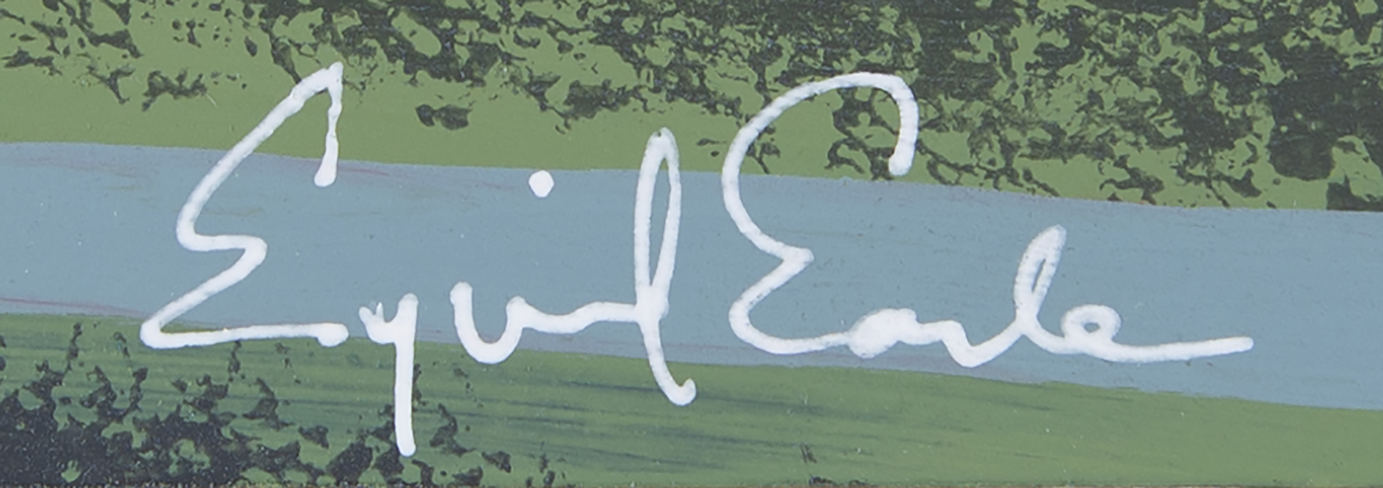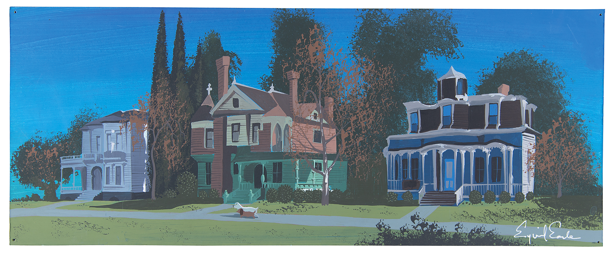 (Walt Disney Studios, 1955) Superb original panoramic concept painting by Eyvind Earle for Lady and the Tramp, depicting the two dogs walking down a sidewalk in Lady’s wealthy neighborhood. Earle captures the scene deftly, training your attention to the two title pooches, whose smallness is exaggerated by the grandiosity of the detailed surroundings—three stunning 'painted lady' Victorian homes, each bordered by immense trees below a dusk blue sky; this beautifully realized moment begins Lady and Tramp’s wonderful date that culminates in the romantic 'Bella Notte' sequence. Accomplished in tempera on 15 x 6 artist's board, signed in the lower right corner in white paint, "Eyvind Earle." In fine condition, with tack holes to corners. Disney artist Eyvind Earle, who later became Sleeping Beauty's production designer, created almost 50 miniature concept sketches for the 'Bella Notte' sequence and was a key contributor to the classic film. A simply brilliant original piece of Disney art.