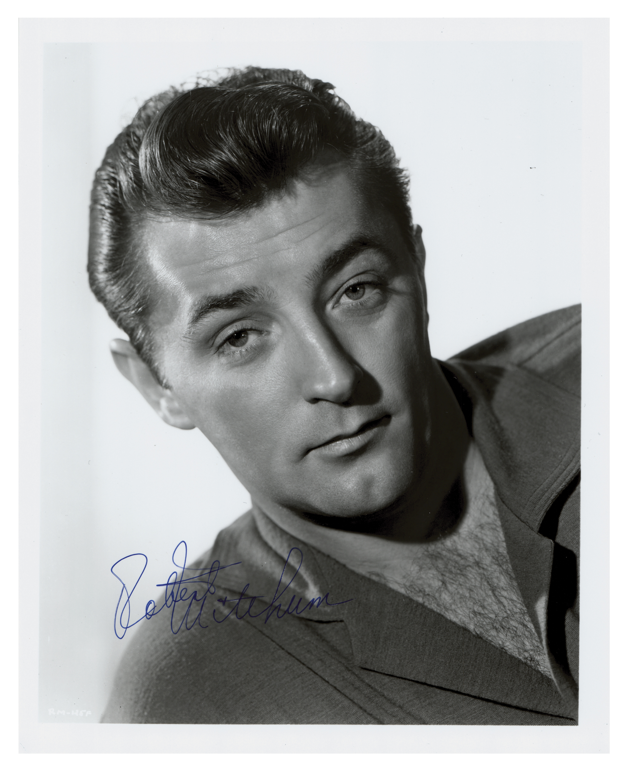 Glossy 8 x 10 photo of Robert Mitchum in a handsome head-and-shoulders pose, signed in blue felt tip. In fine condition.
