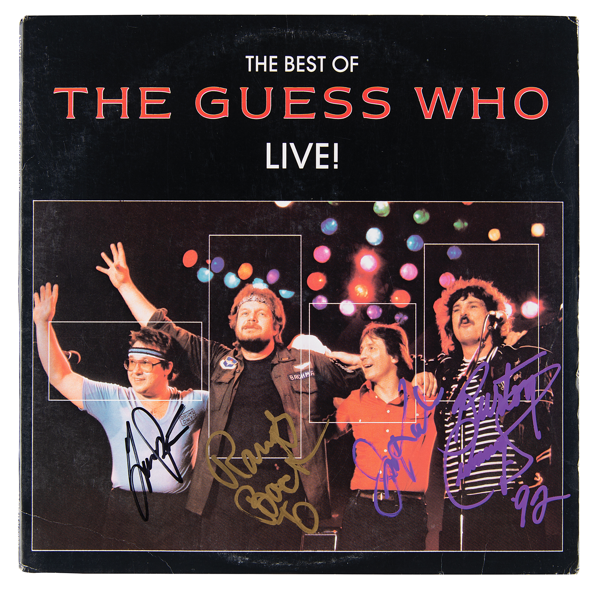 The Best of The Guess Who Live! album signed on the front cover in black felt tip by Garry Peterson, in gold ink by Randy Bachman, and in purple paint pen by Jim Kale and Burton Cummings. In fine condition. The record is included.