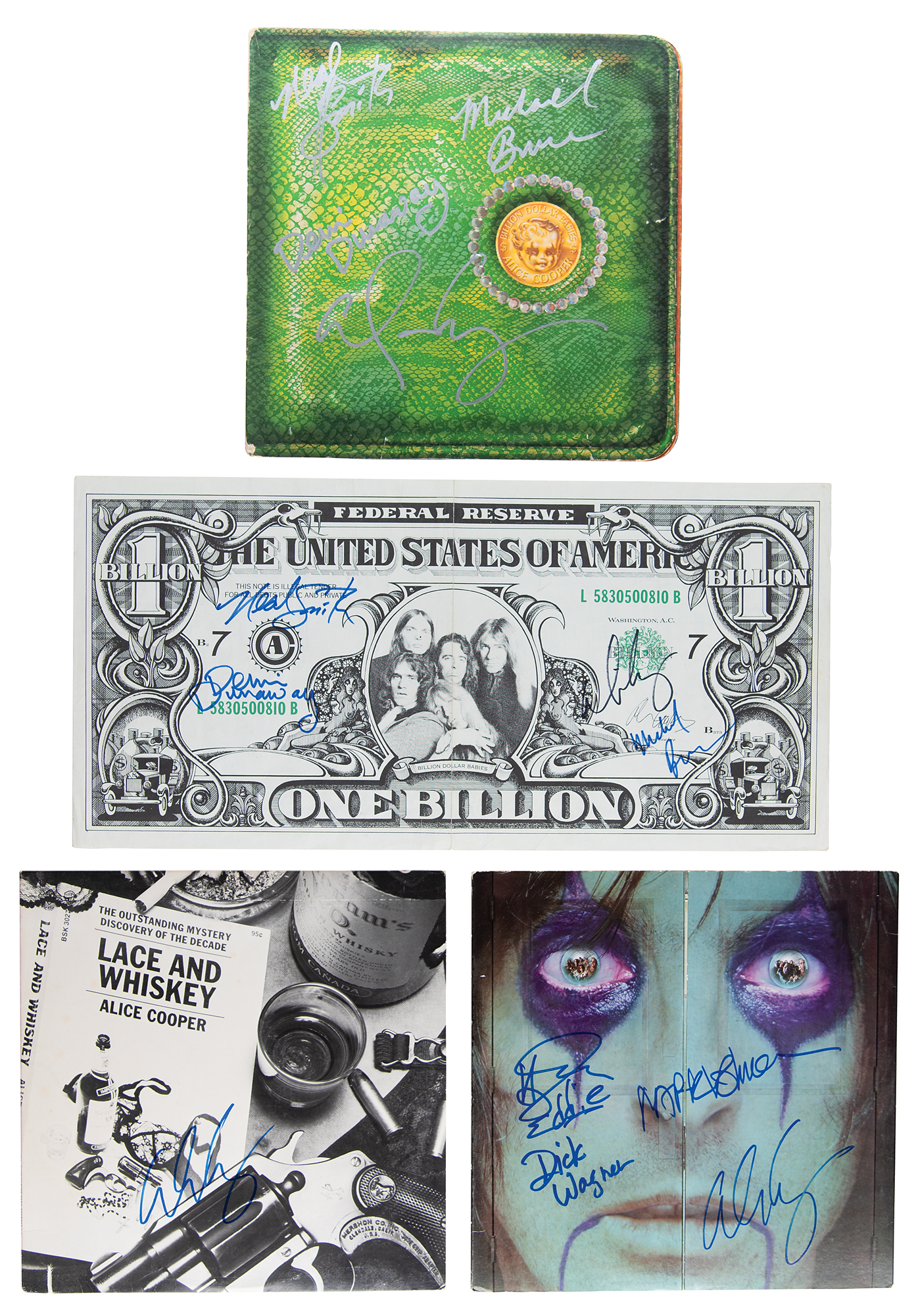 Four items: a 'One Billion' dollar bill album insert from Billion Dollar Babies by Alice Cooper, 22 x 10.75, signed in blue and black felt tip by Alice Cooper, Neal Smith, Dennis Dunaway, and Michael Bruce; a Billion Dollar Babies album, signed on the front cover in silver ink by Cooper, Smith, Dunaway, and Bruce; a From the Inside album signed on the front cover in blue felt tip by Cooper, Dick Wagner, and Flo & Eddie (Mark Volman and Howard Kaylan); and Lace and Whiskey album by Alice Cooper, who has signed the front cover in blue felt tip. In overall fine condition, with some wear to edges. The records are included.