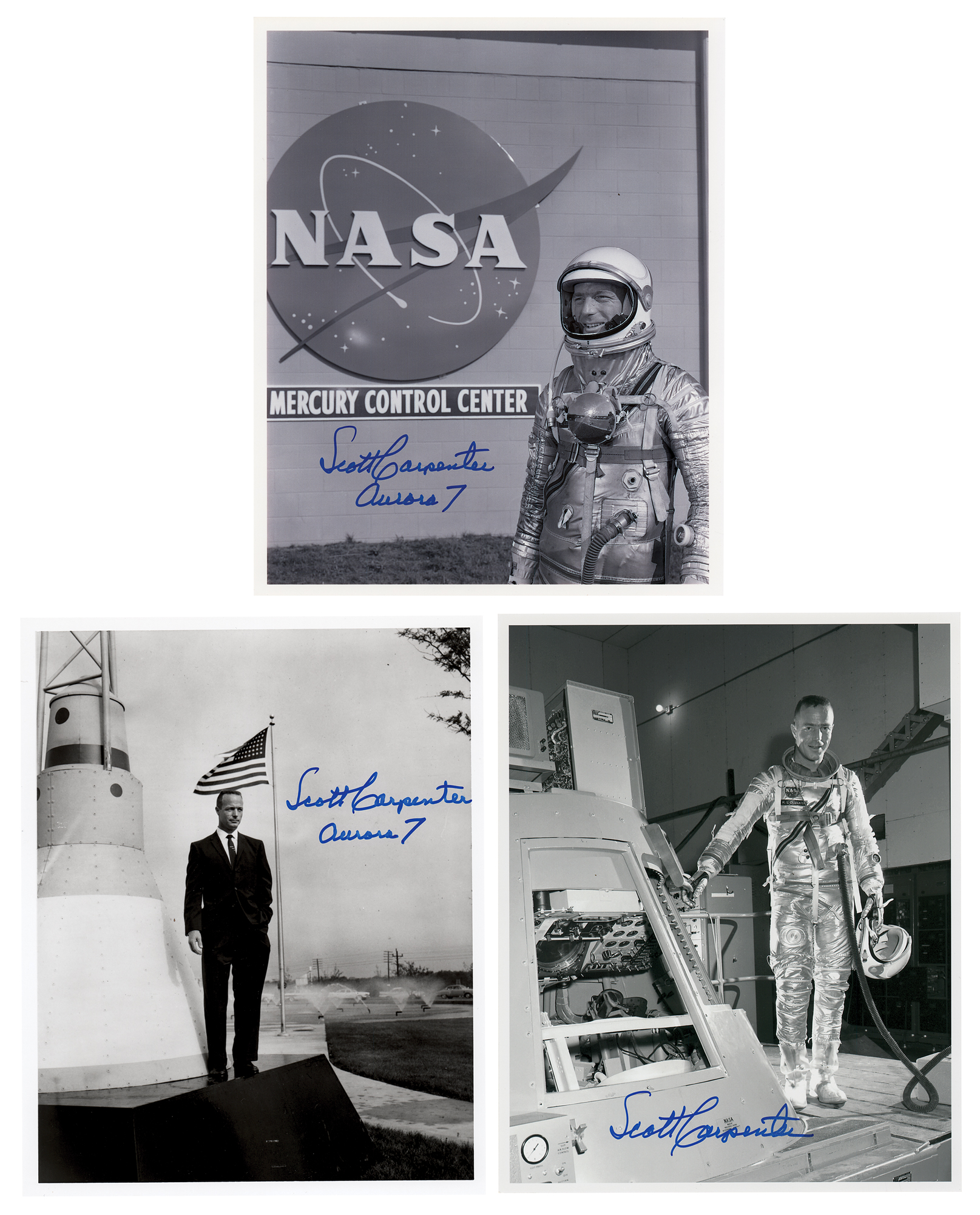 Three satin-finish photos of astronaut Scott Carpenter during the Mercury program, each approximately 8 x 10, each signed in blue felt tip, with Carpenter adding “Aurora 7” to two photos. In overall very fine condition.