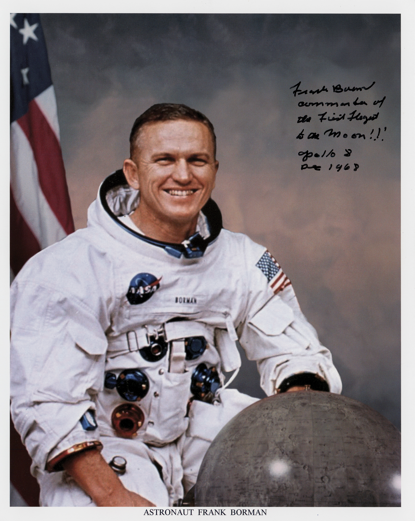 Color semi-glossy 8 x 10 cardstock photo of CDR Borman in his white space suit with a lunar globe, signed in black felt tip, "Frank Borman, Commander of the First Flight to the Moon!!! Apollo 8, Dec 1968." In very fine condition.