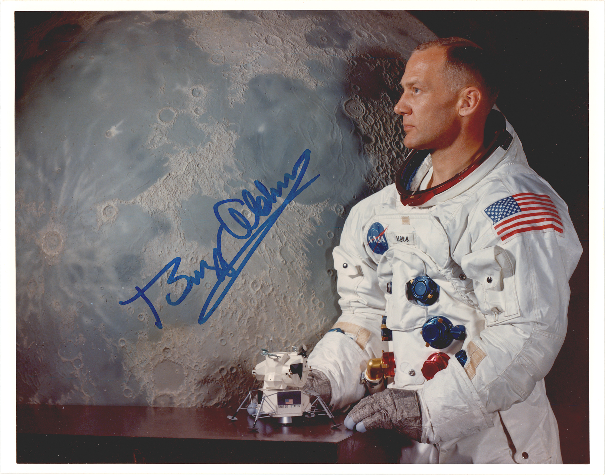 Uncommon color satin-finish 10 x 8 photo of Apollo 11 LMP Buzz Aldrin in a heroic profile pose wearing his white space suit and posing with a lunar module model against a lunar backdrop, signed prominently in blue felt tip. In very fine condition.