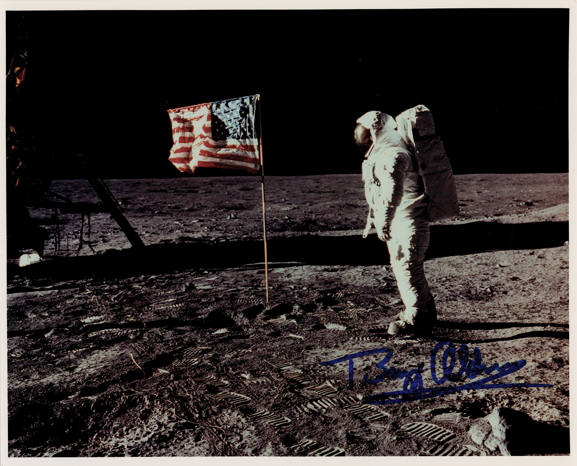 Color glossy 10 x 8 full-length photo of LMP Buzz Aldrin on the surface of the moon next to the American flag during the historic Apollo 11 EVA, signed in blue felt tip. In very fine condition.
