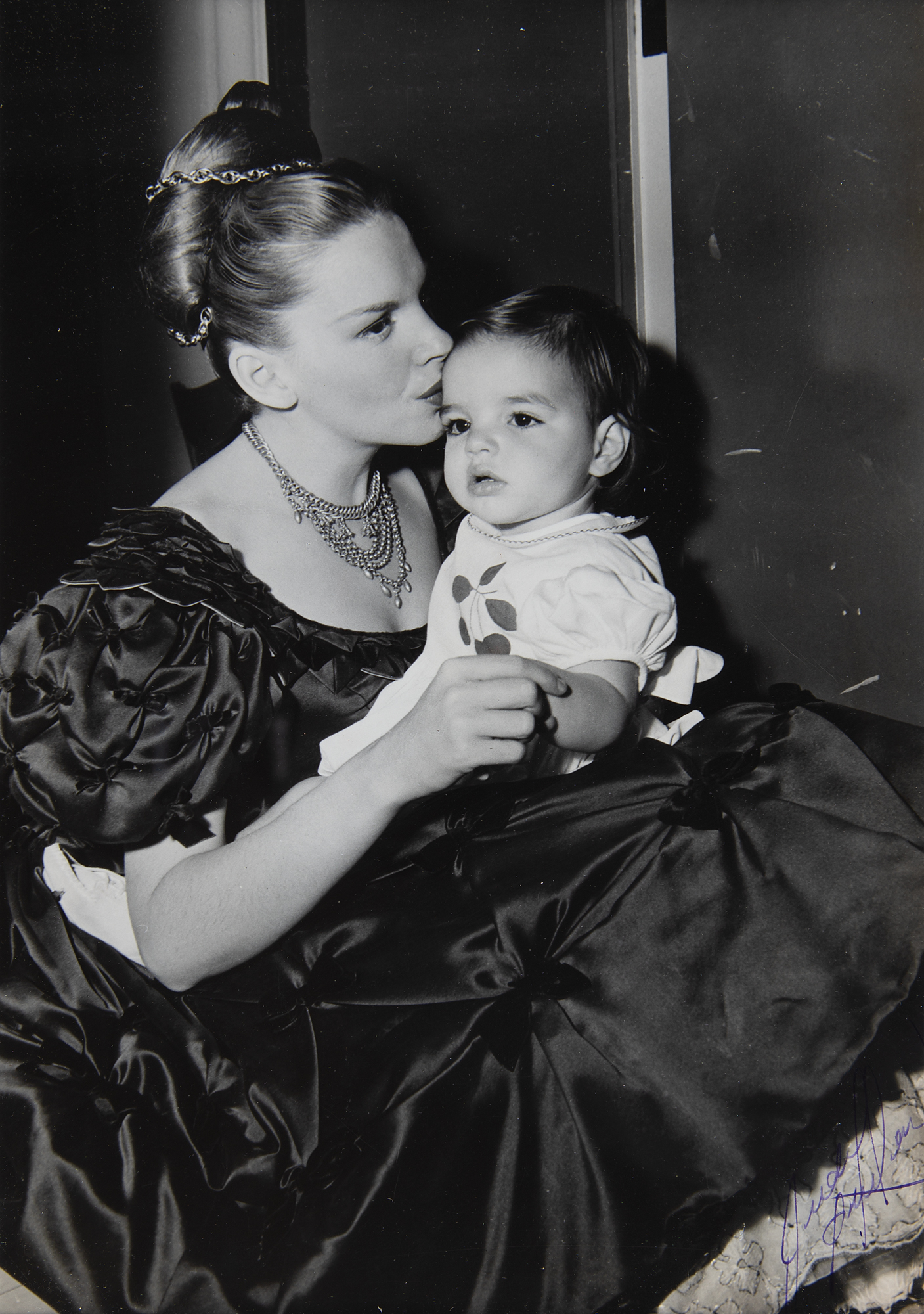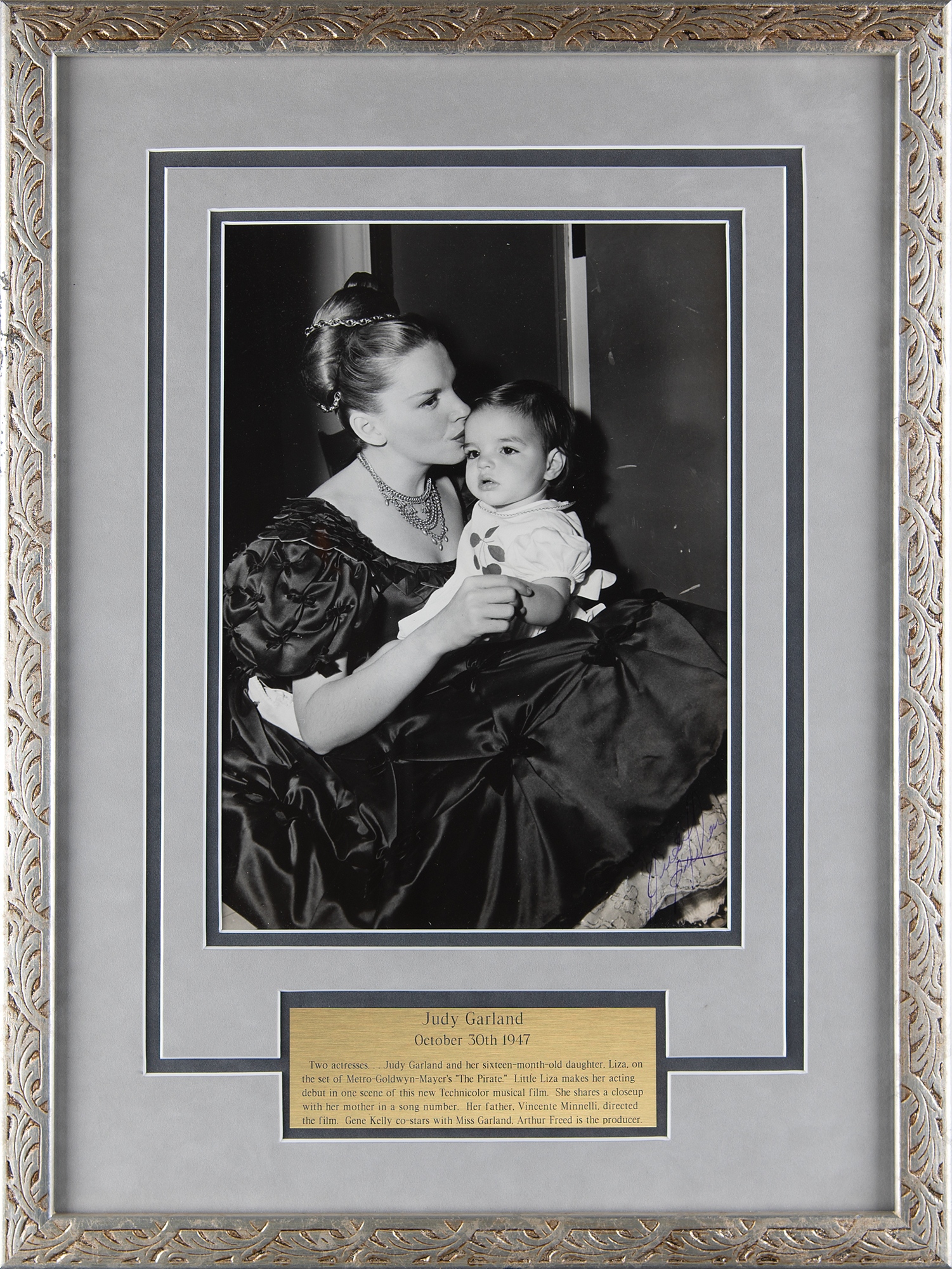 Vintage glossy 8.5 x 12 photo of Judy Garland holding her baby, Liza Minelli, signed in the lower right corner in purple fountain pen, "Judy Garland." Archivally double-matted and framed with a plaque to an overall size of 15.75 x 21.25. In fine condition, with moderate signature contrast.