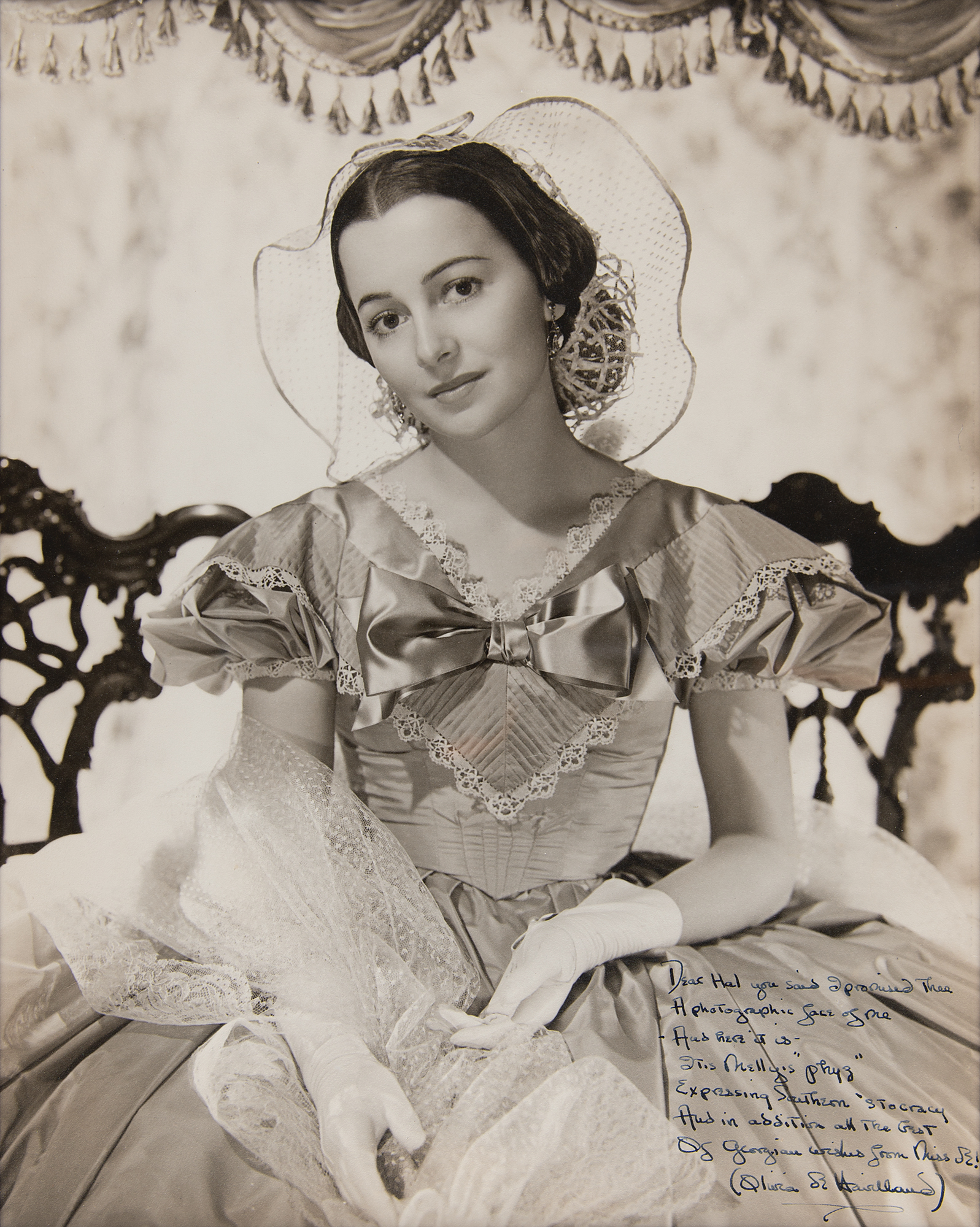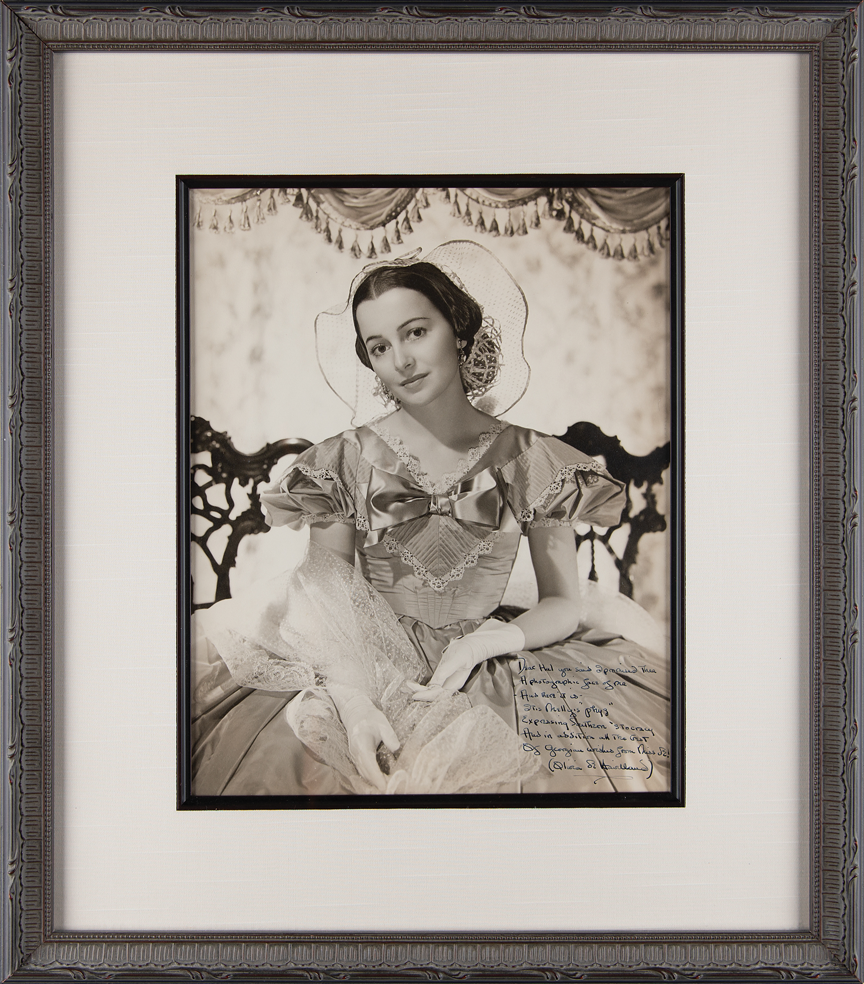 Vintage matte-finish 10 x 13 photo of de Havilland in her best known role as Melanie Hamilton in Gone With the Wind, signed and inscribed in fountain pen, "Dear Hal, you said I promised Thea a photographic face of me—and here it is—It's Melly's 'phyz' expressing Southern 'stocracy and in addition all the best of Georgian wishes from Miss de! (Olivia de Havilland).” Archivally matted and framed to an overall size of 18 x 20.5. In fine condition.