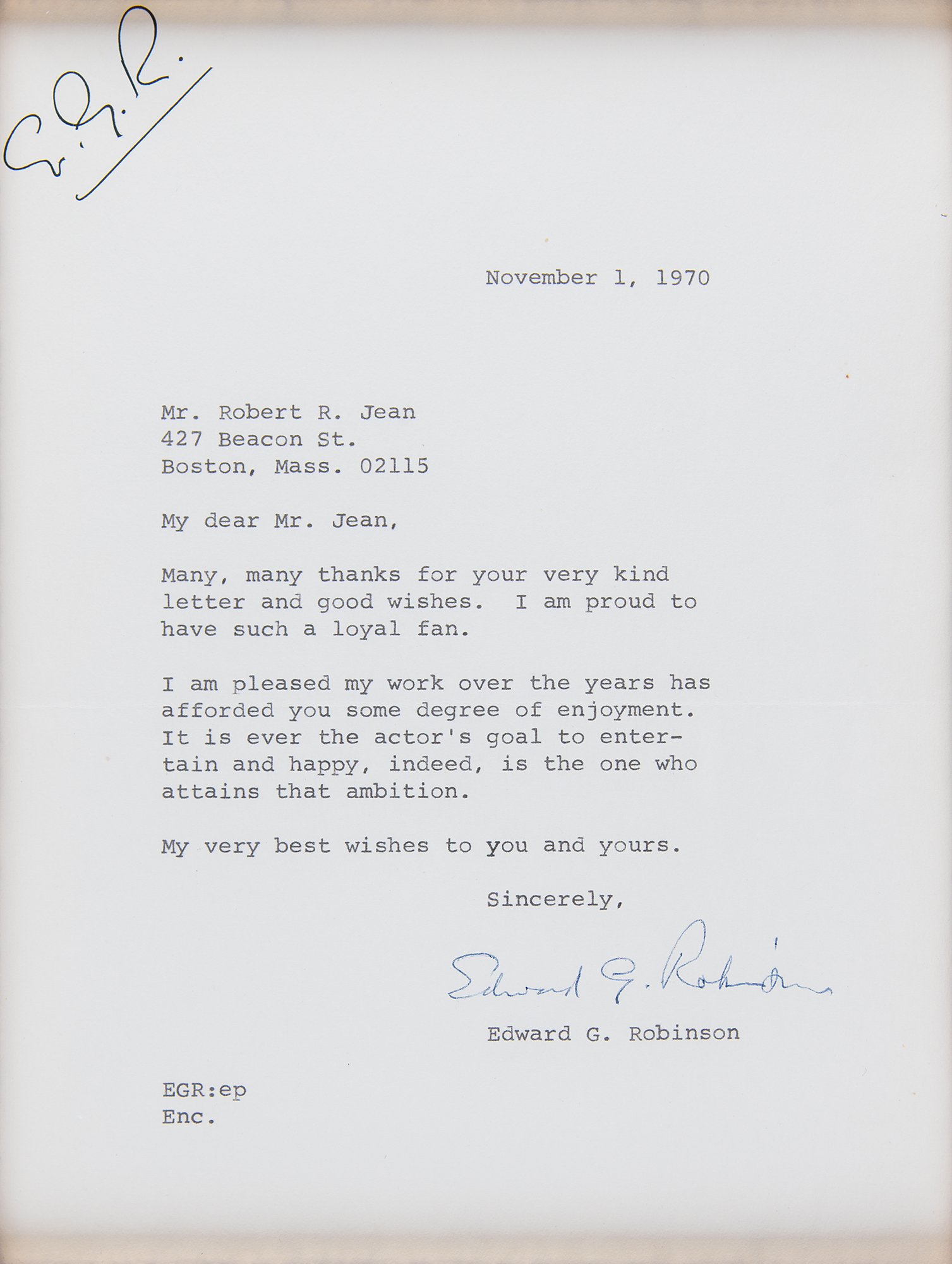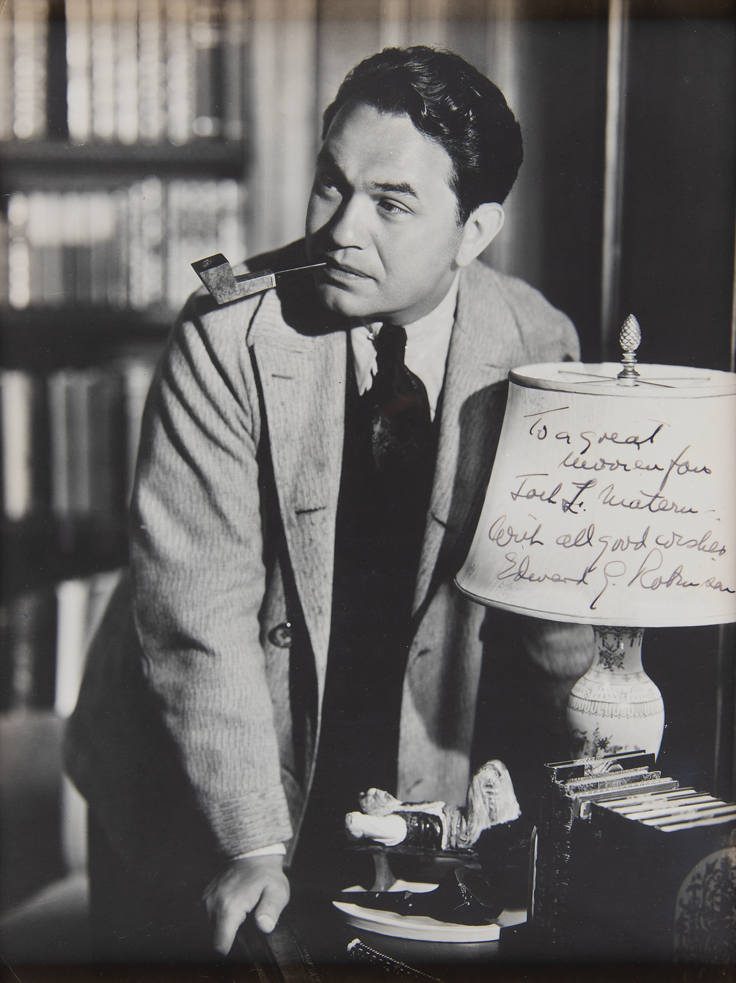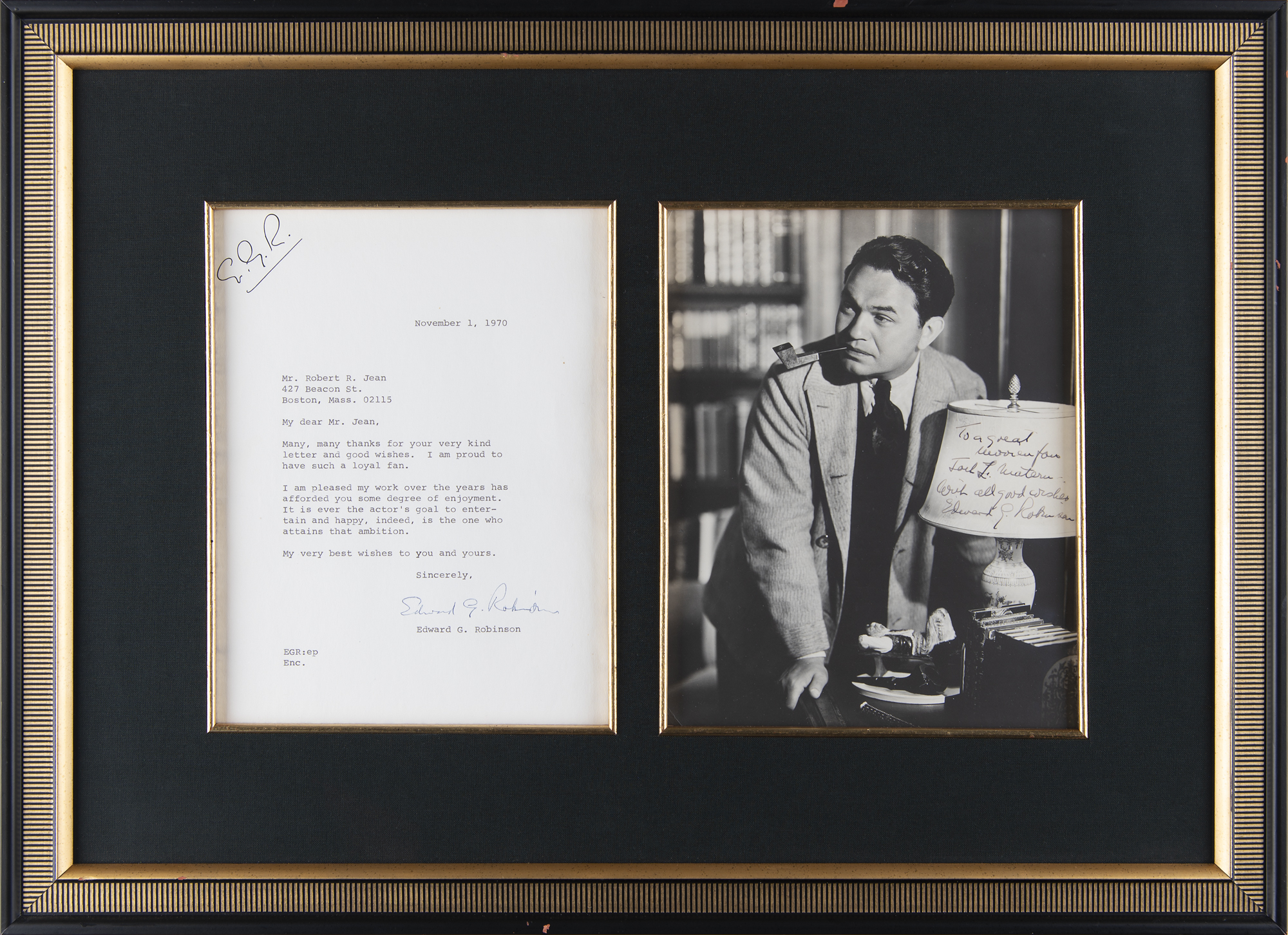 Two items: a vintage matte-finish 7 x 9 photo of Robinson with a pipe in his mouth, signed and inscribed in fountain pen, "To a great women for Jack L. Matera, With all good wishes, Edward G. Robinson"; a TLS, one page, 6.75 x 9, personal letterhead featuring his initials in facsimile, November 1, 1970, in part: "I am proud to have such a loyal fan. I am pleased my work over the years has afforded you some degree of enjoyment. It is ever the actor's goal to entertain and happy, indeed, is the one who attains that ambition." Archivally cloth-matted and framed to an overall size of 22 x 16. In fine condition.