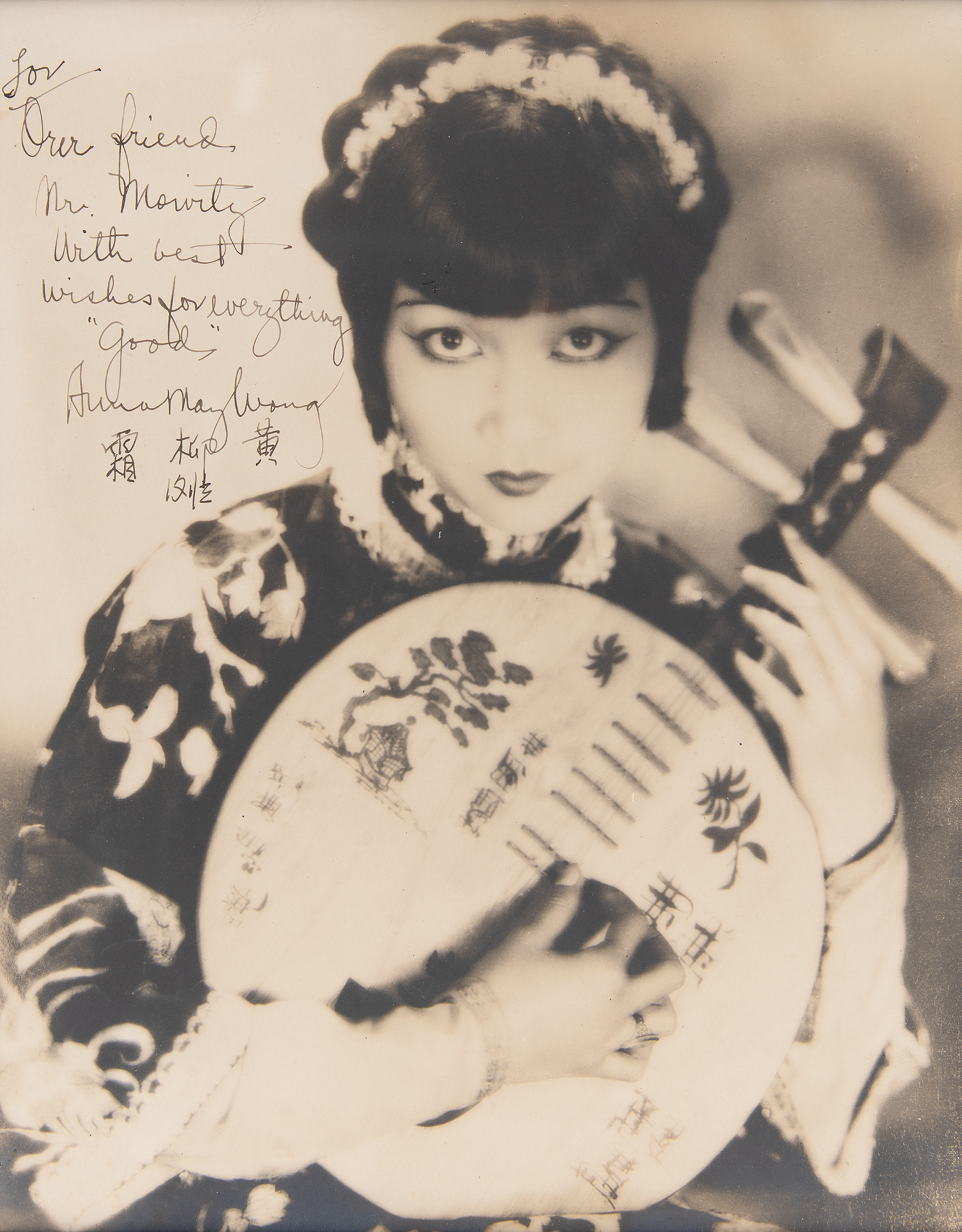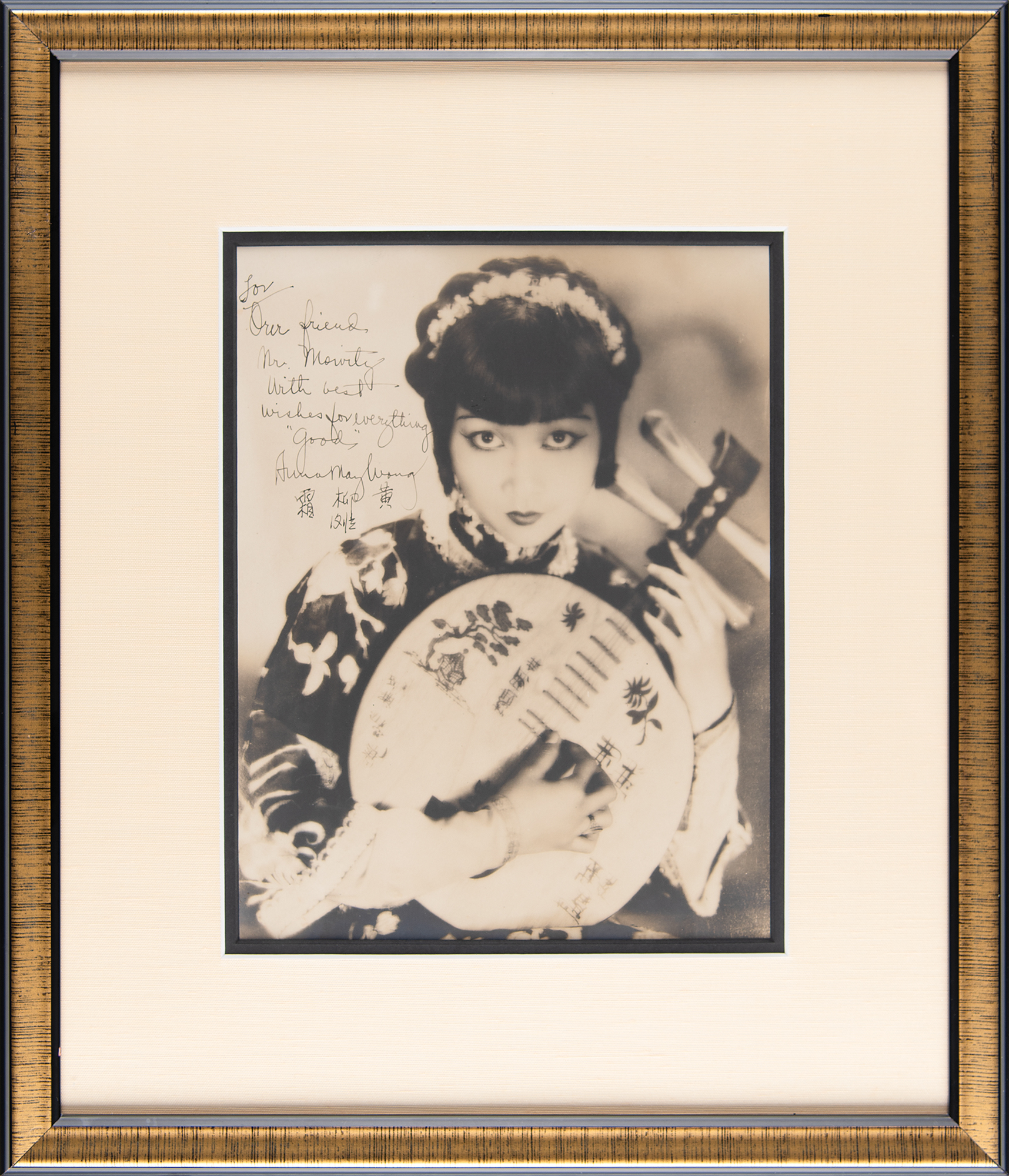 Lovely vintage matte-finish 7 x 9 photo of the pioneering Chinese-American actress playing a traditional instrument, signed and inscribed in fountain pen, "For our friend Mr. Morvitz, with best wishes for everything 'good,' Anna May Wong.” Archivally double-matted and framed to an overall size of 13.25 x 15.5. In fine condition.