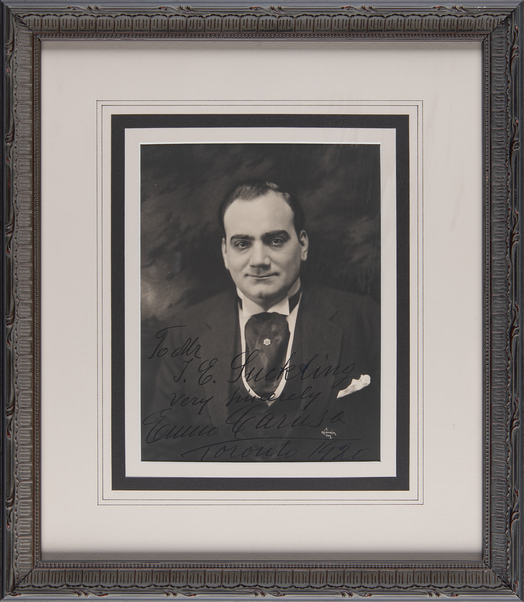 Ideal vintage matte-finish 6.5 x 8.5 portrait of the Italian tenor by Mishkin of New York, prominently signed and inscribed in fountain pen, "To Mr. T. E. Suckling, very sincerely, Enrico Caruso, Toronto 1920.” Archivally double-matted and framed to an overall size of 14 x 16.25. In fine condition.