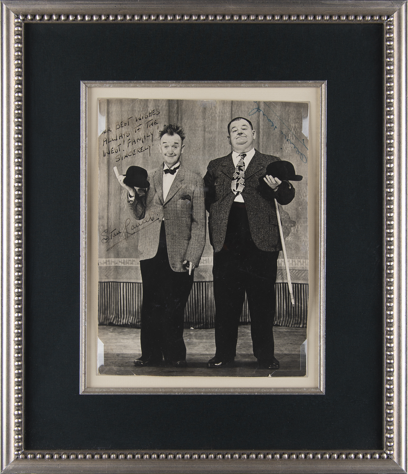 Vintage glossy 7 x 9 photo of the legendary duo posing side-by-side, signed and inscribed in fountain pen, "Our best wishes always to the West! Family! Sincerely, Stan Laurel" and "Oliver Hardy." Archivally corner-mounted, matted, and framed to an overall size of 13.25 x 15.5. In fine condition, with slight curling to the trimmed edges. An uncommon full-length pose of the iconic comedic team.