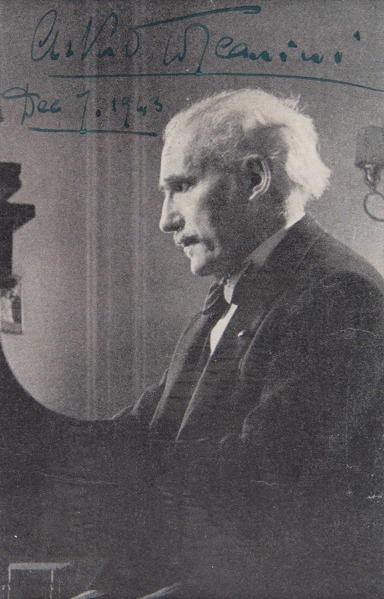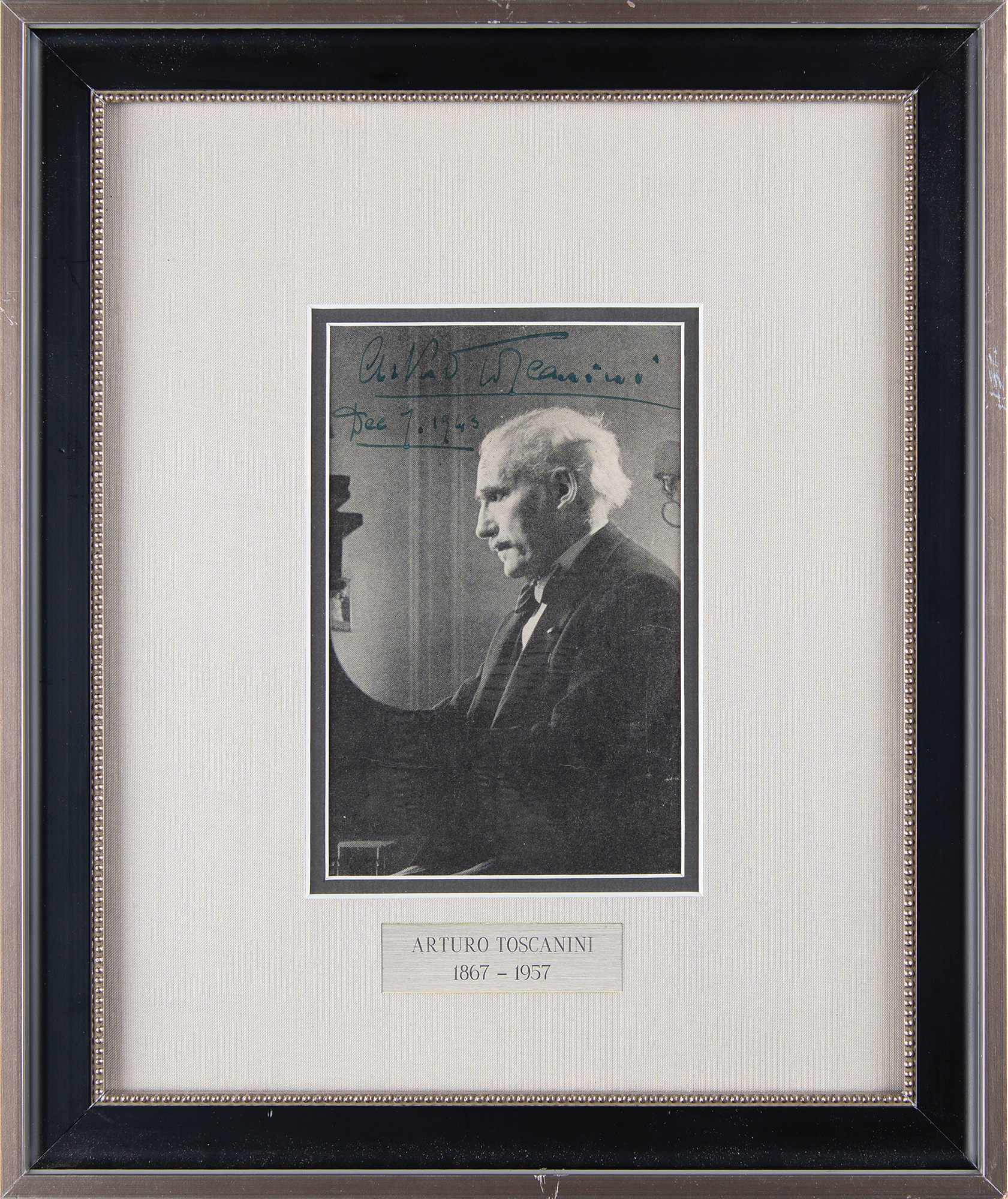 Vintage 4.5 x 7 paperstock photo of the acclaimed conductor, signed across the top in fountain pen, "Arturo Toscanini. Dec. 7, 1943." Archivally double-matted and framed with an engraved nameplate to an overall size of 12.5 x 15.25. In fine condition.