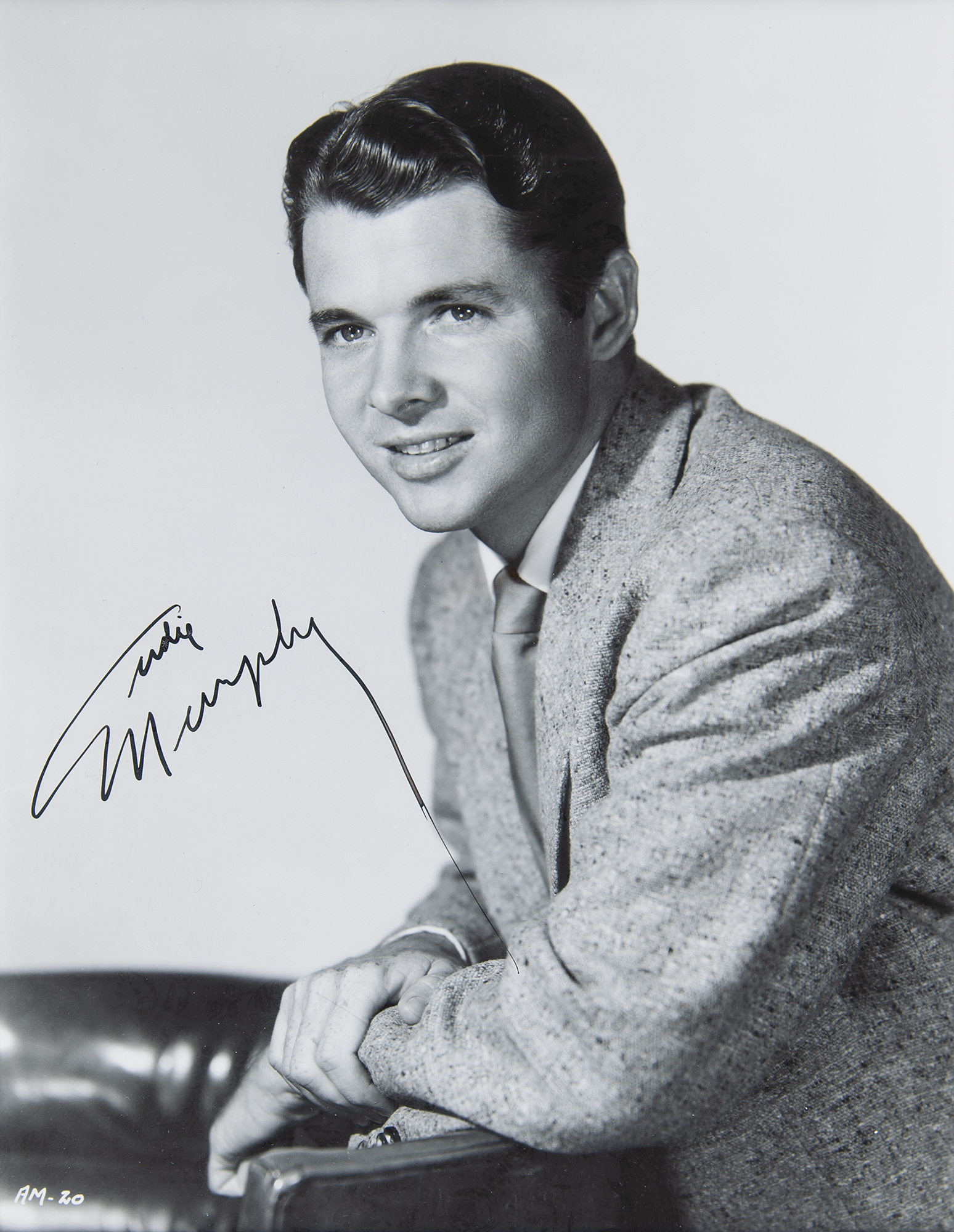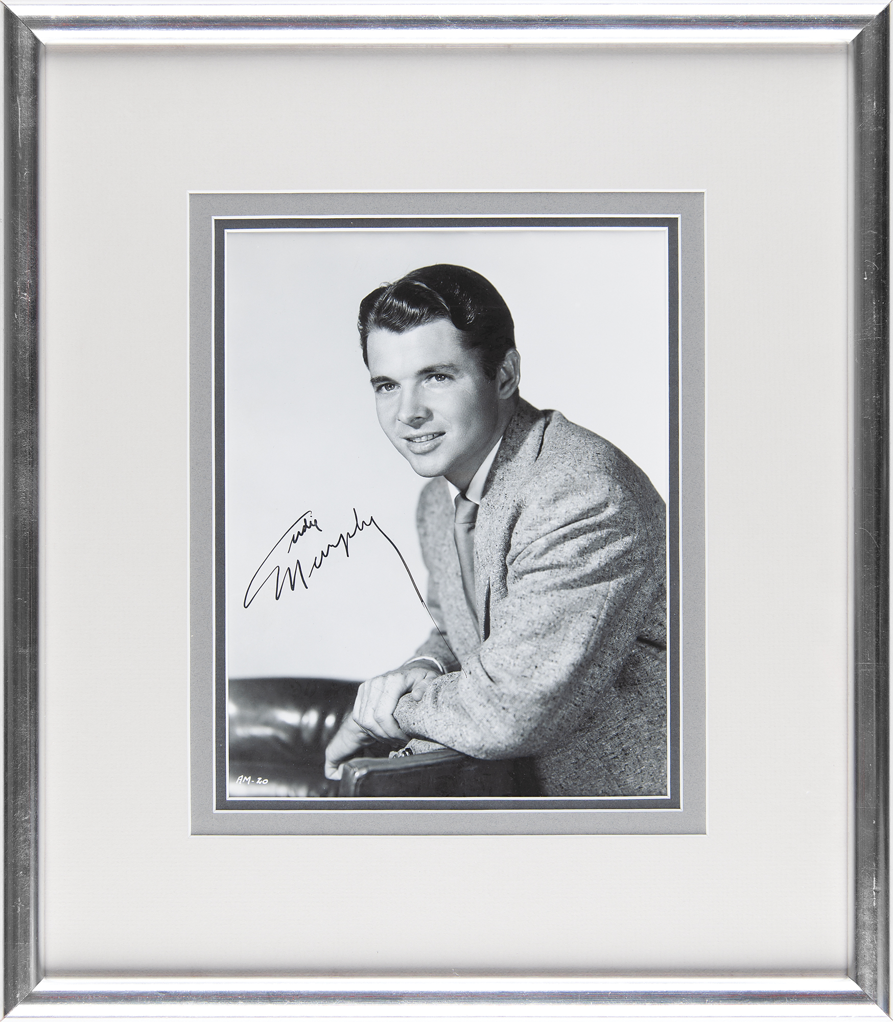 Vintage glossy 6.75 x 8.75 bust-length portrait of Audie Murphy, nicely signed in fountain pen. Archivally triple-matted and framed to an overall size of 13.75 x 15.75. In very good to fine condition, with some creasing to the top of Murphy's head.