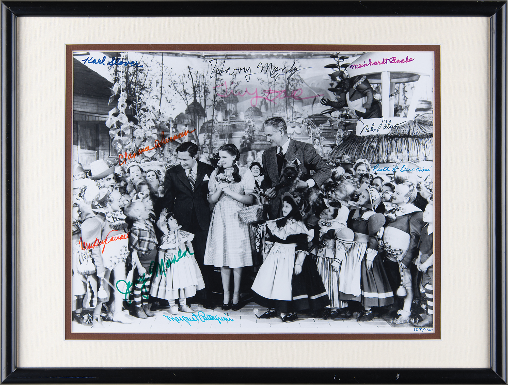 Limited edition glossy 13.5 x 10.5 photo of the Munchkin cast from The Wizard of Oz, numbered 107/300, signed in felt tip by ten, including: Jerry Maren, Meinhardt Raabe, Margaret Pellegrini, Karl Slover, Clarence Swensen, Mickey Carroll, Nels Nelson, Ruth Robinson Duccini, Harry Monty, and Tiny Doll Earles. Double-matted and framed to an overall size of 19 x 14.5. In fine condition.