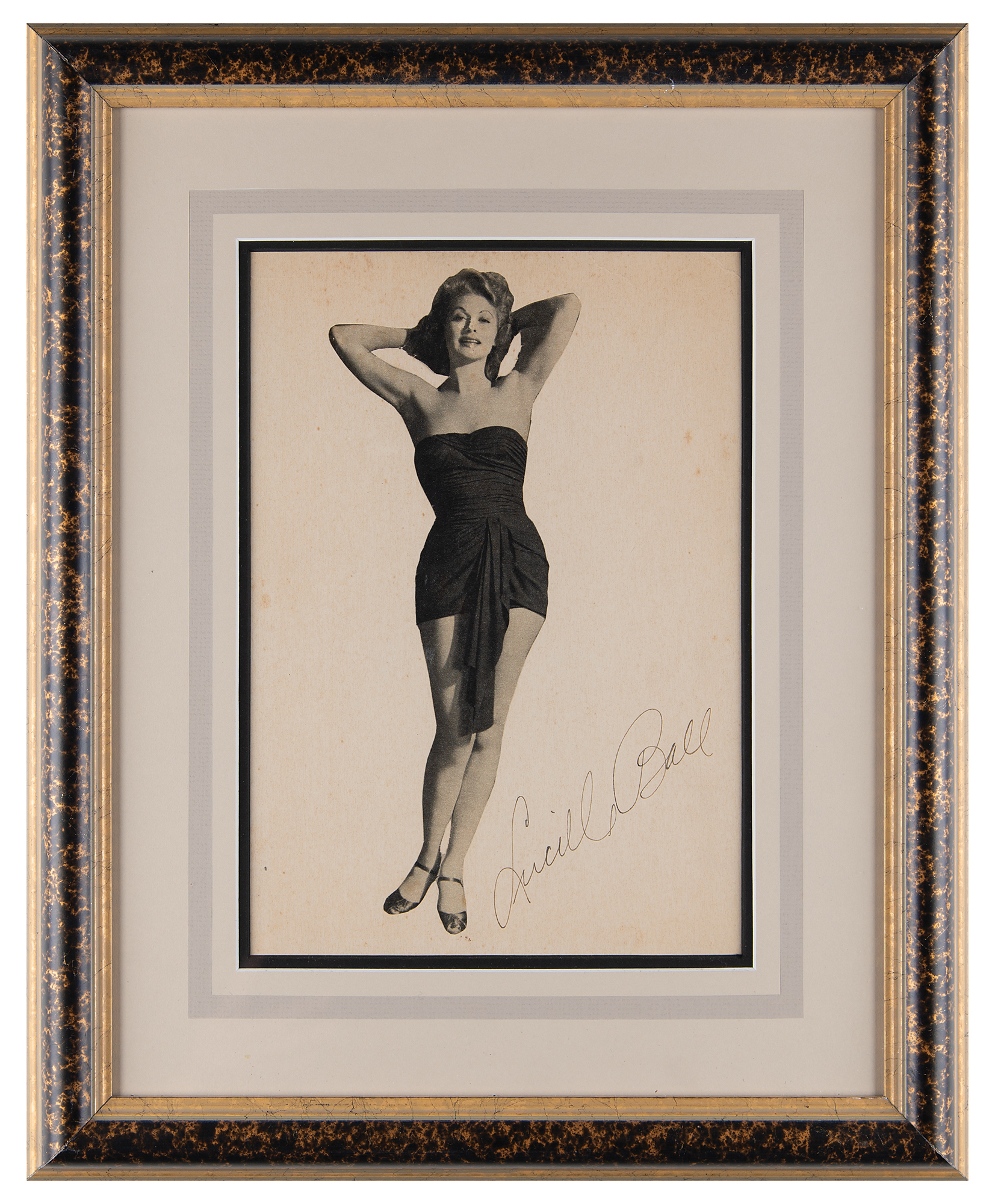 Unusual vintage 7.75 x 11 cardstock photo of the comedienne striking an attractive full-length pose, signed in fountain pen, "Lucille Ball." Archivally double-matted and framed to an overall size of 15.25 x 18.5. In fine condition, with scattered light foxing, some touching her face.