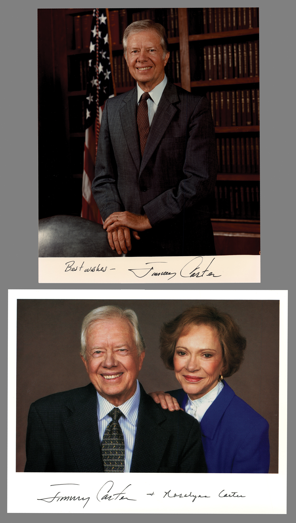 Two items: a color 10 x 8 cardstock photo of the Carters together, signed in the lower border in black felt tip, "Jimmy Carter" and "Rosalynn Carter"; and a color satin-finish 8 x 10 photo of Jimmy Carter posing in front of an American flag, signed in the lower border in black felt tip, "Best Wishes—Jimmy Carter." In overall fine condition, with some tiny surface impressions to the dual-signed photo.