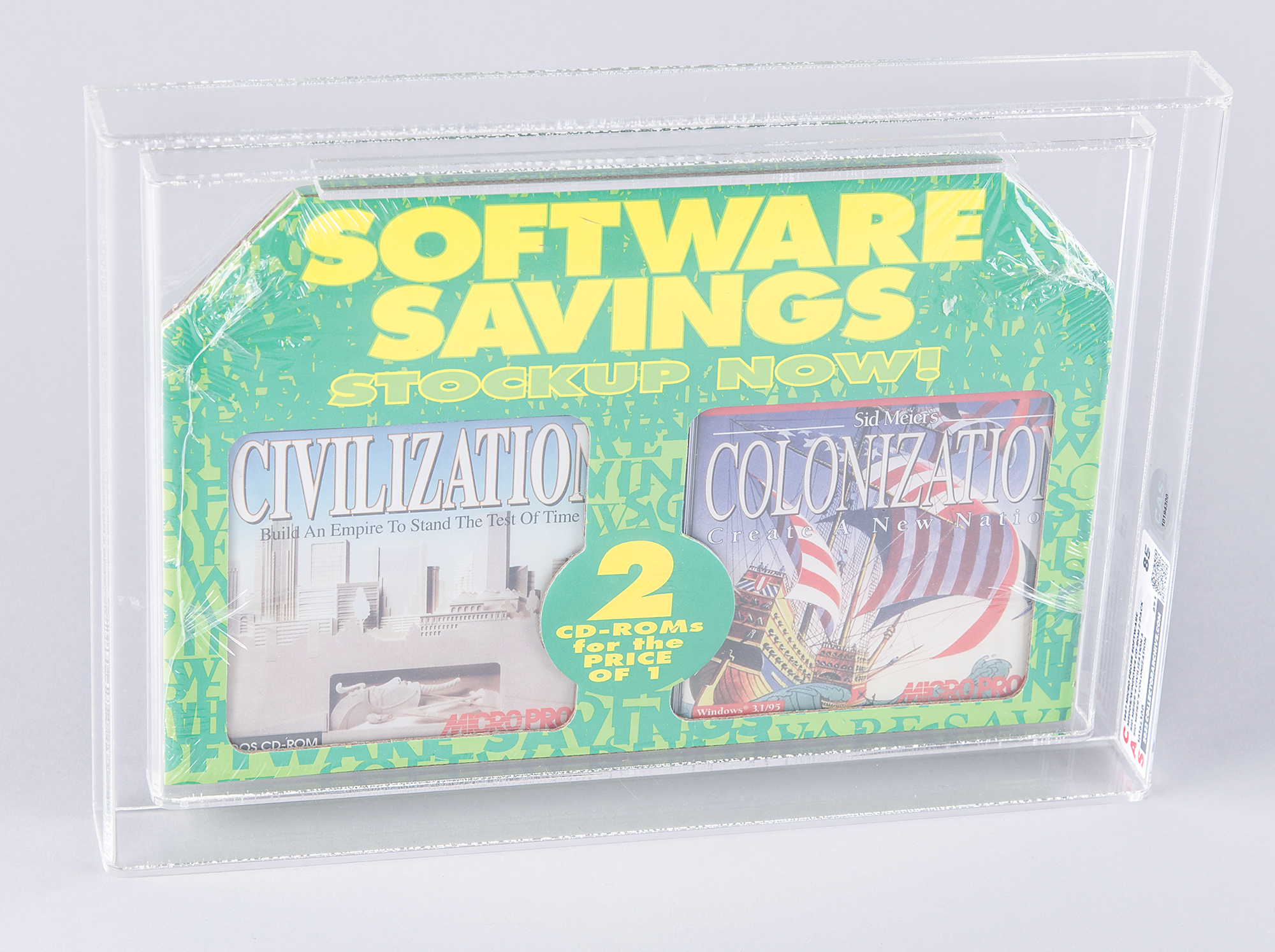Unopened two-pack bundle of "Sid Meier's Civilization" and "Sid Meier's Colonization" Windows CD-ROM computer games developed and published by MicroProse, released in 1997. Encapsulated and graded by CAS with a master grade of "85" and a real grade of "87.1."