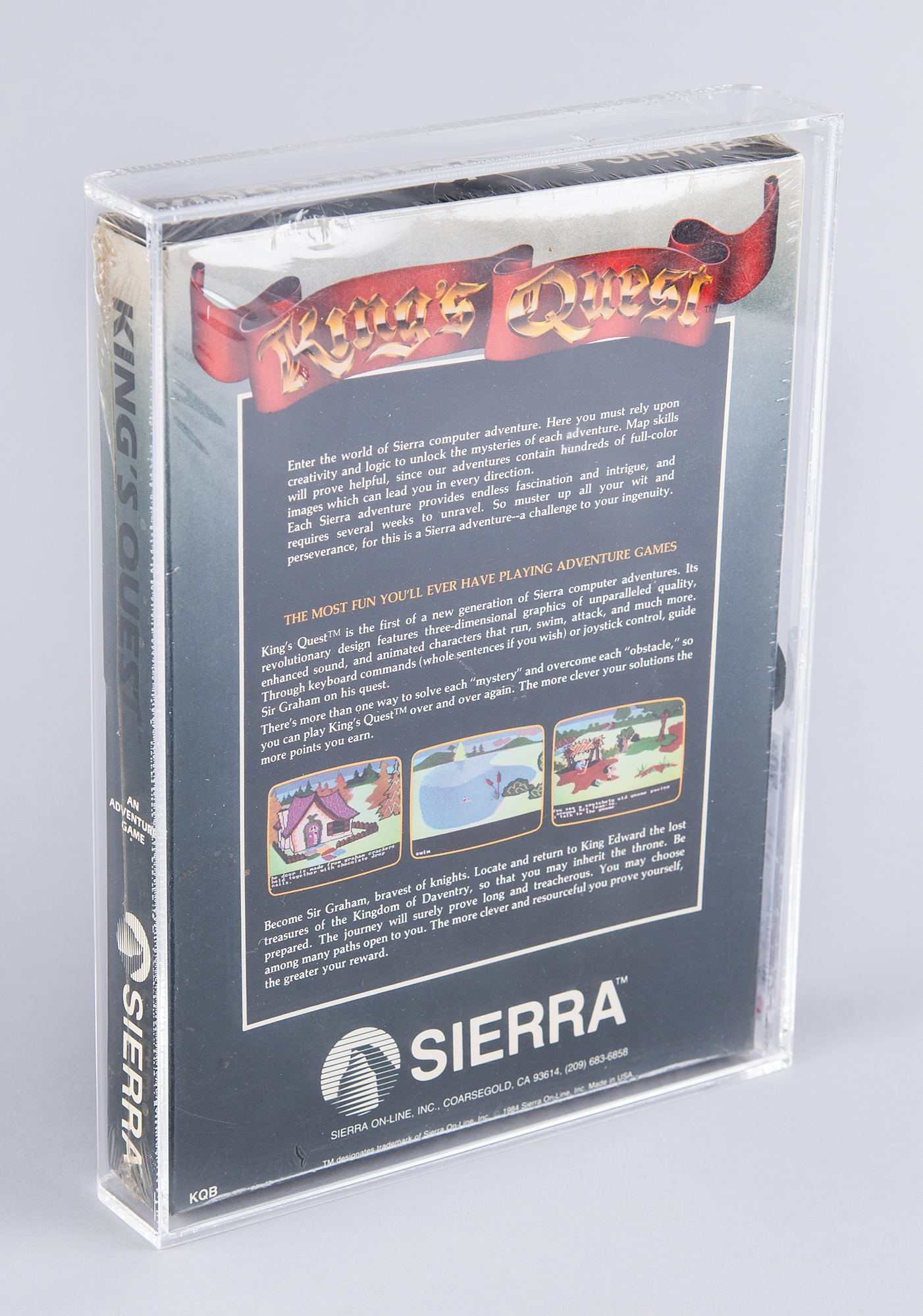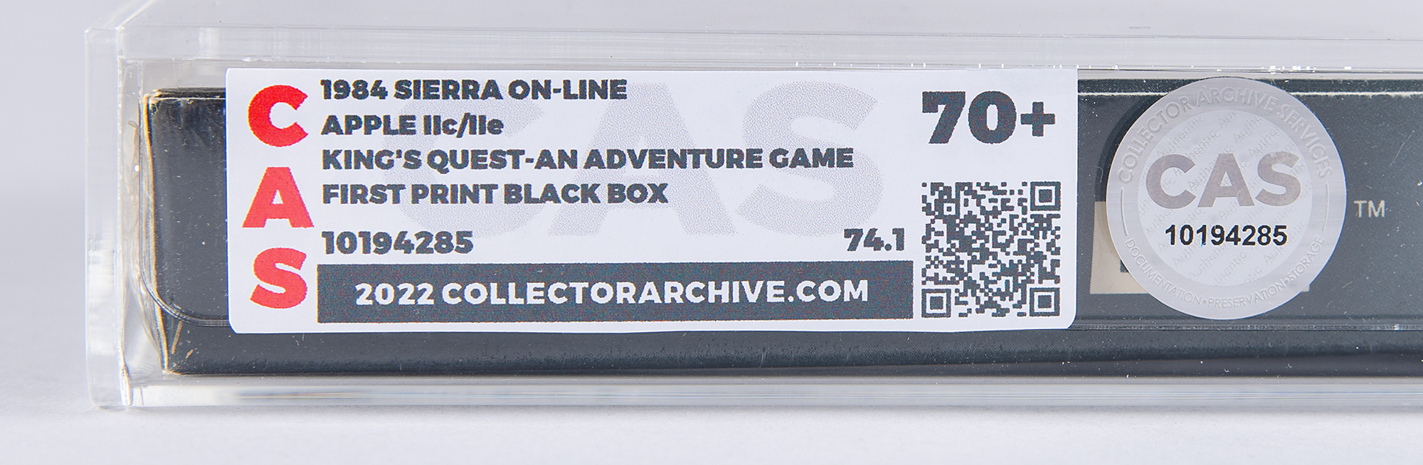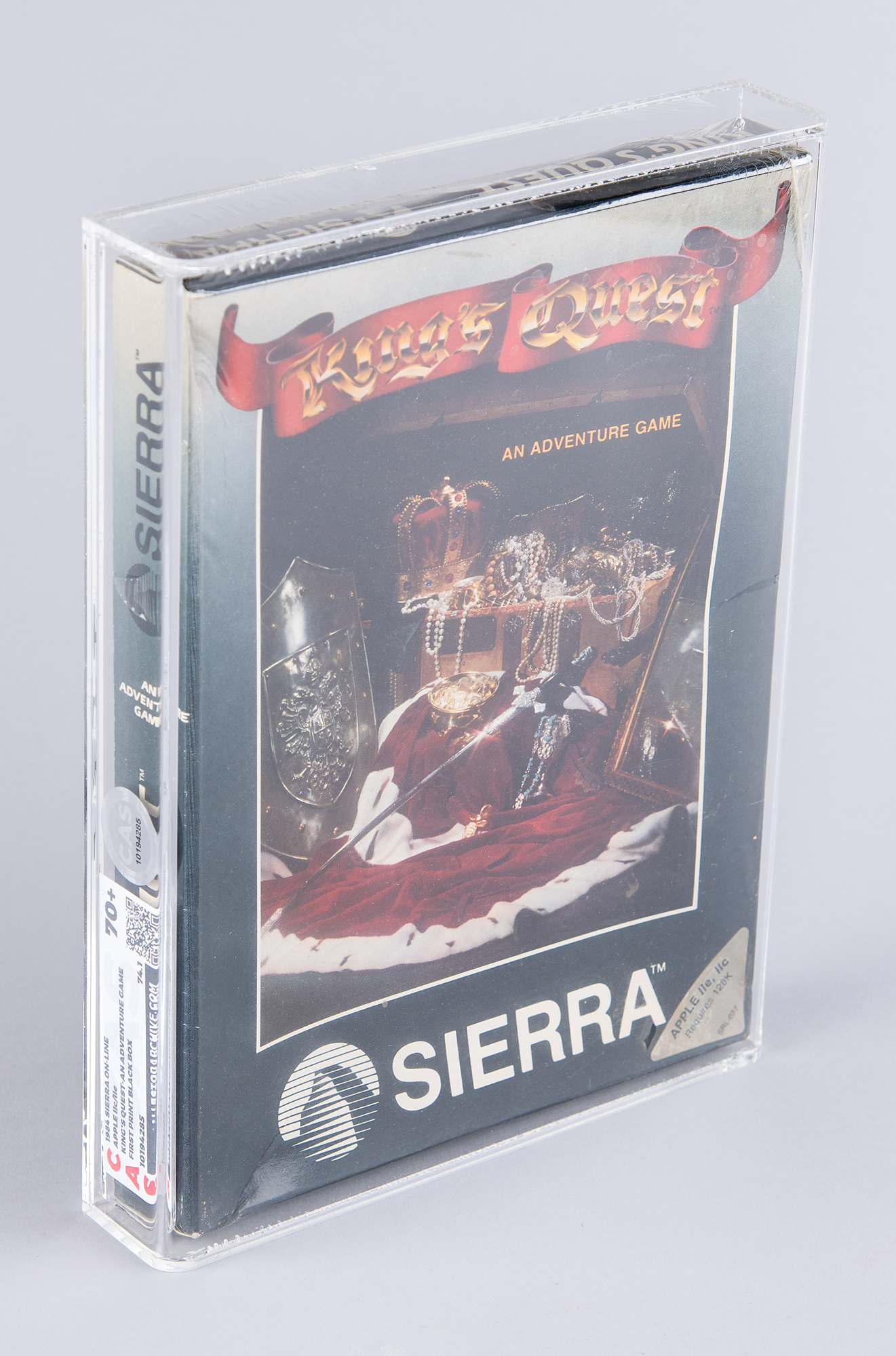 Unopened "King's Quest" Apple IIe and IIc 5.25″ floppy disk computer game developed and published by Sierra On-Line, released in 1984. A revolutionary game, this kicked off the popular King's Quest series and proved highly influential in the evolution of the graphic adventure game. Featuring pioneering interactive graphics, it was the first adventure game to integrate graphical animation into the player's view of the game world and marked a major departure from previous text-based adventure games that relied on static imagery. Encapsulated and graded by CAS with a master grade of "70" and a real grade of "74.1."