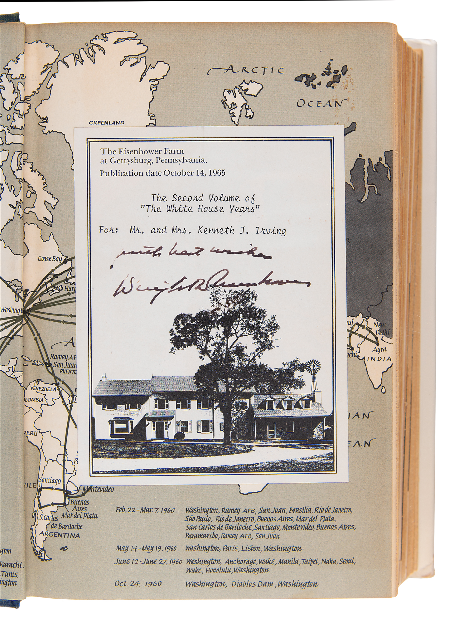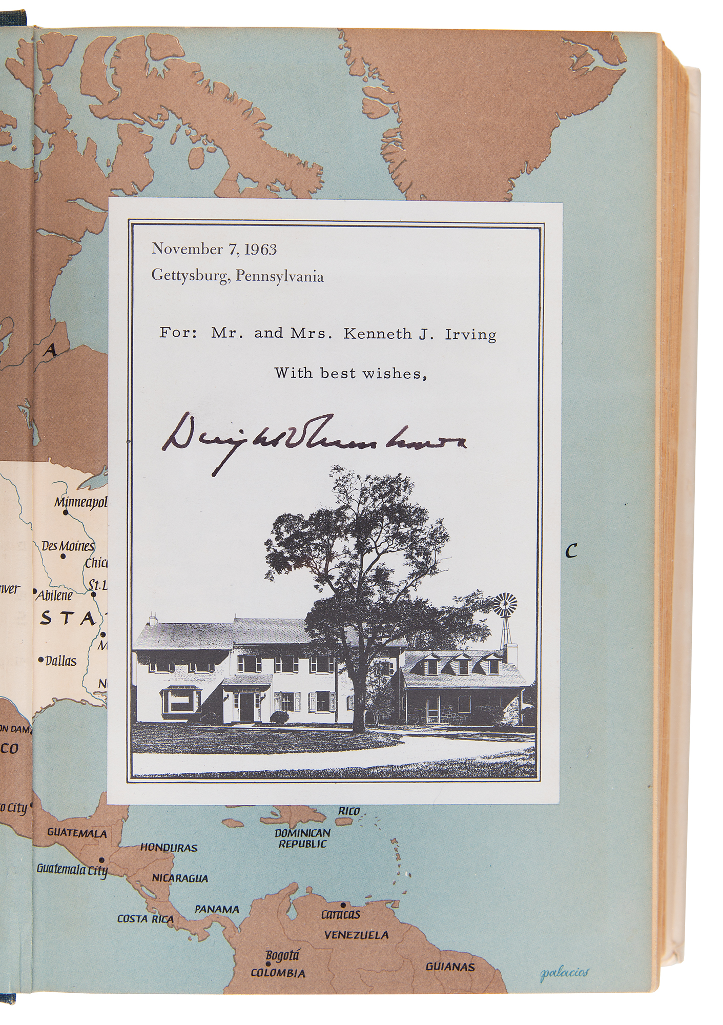 Signed book: Mandate for Change: The White House Years, A Personal Account, 1953–1956. First trade edition. NY: Doubleday & Company, 1963. Hardcover with dust jacket, 6.5 x 9.5, 650 pages. Signed on a Gettysburg bookplate affixed to the first free end page in black ink, "Dwight D. Eisehnhower," and inscribed in type: "For: Mr. and Mrs. Kenneth J. Irving, With best wishes." In very good to fine condition, with light wear to the price-clipped dust jacket, and toning to the page fore edges.