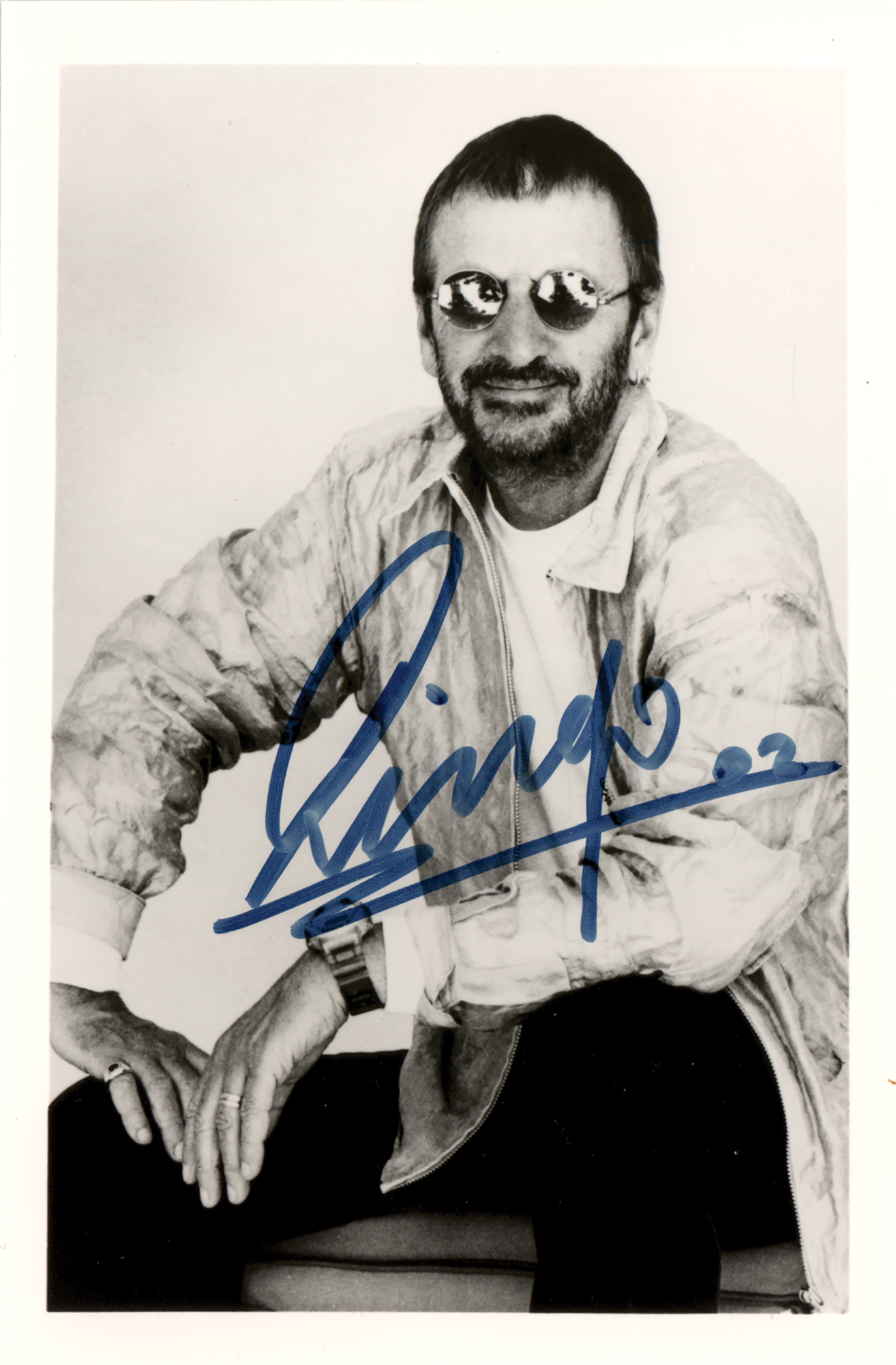 Satin-finish 4 x 6 photo of the Beatles drummer looking cool in his sunglasses, signed in black felt tip, "Ringo, '02." In fine condition.