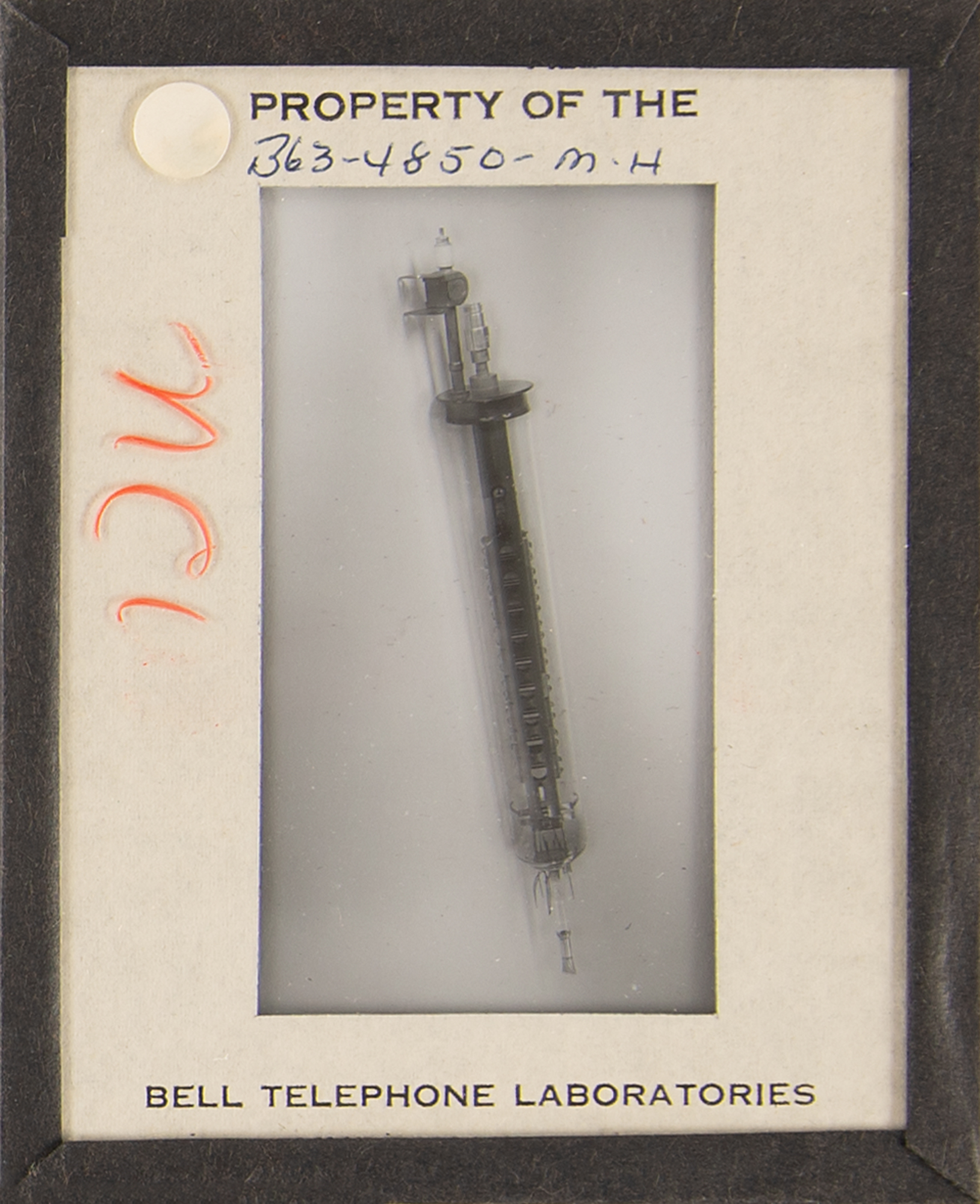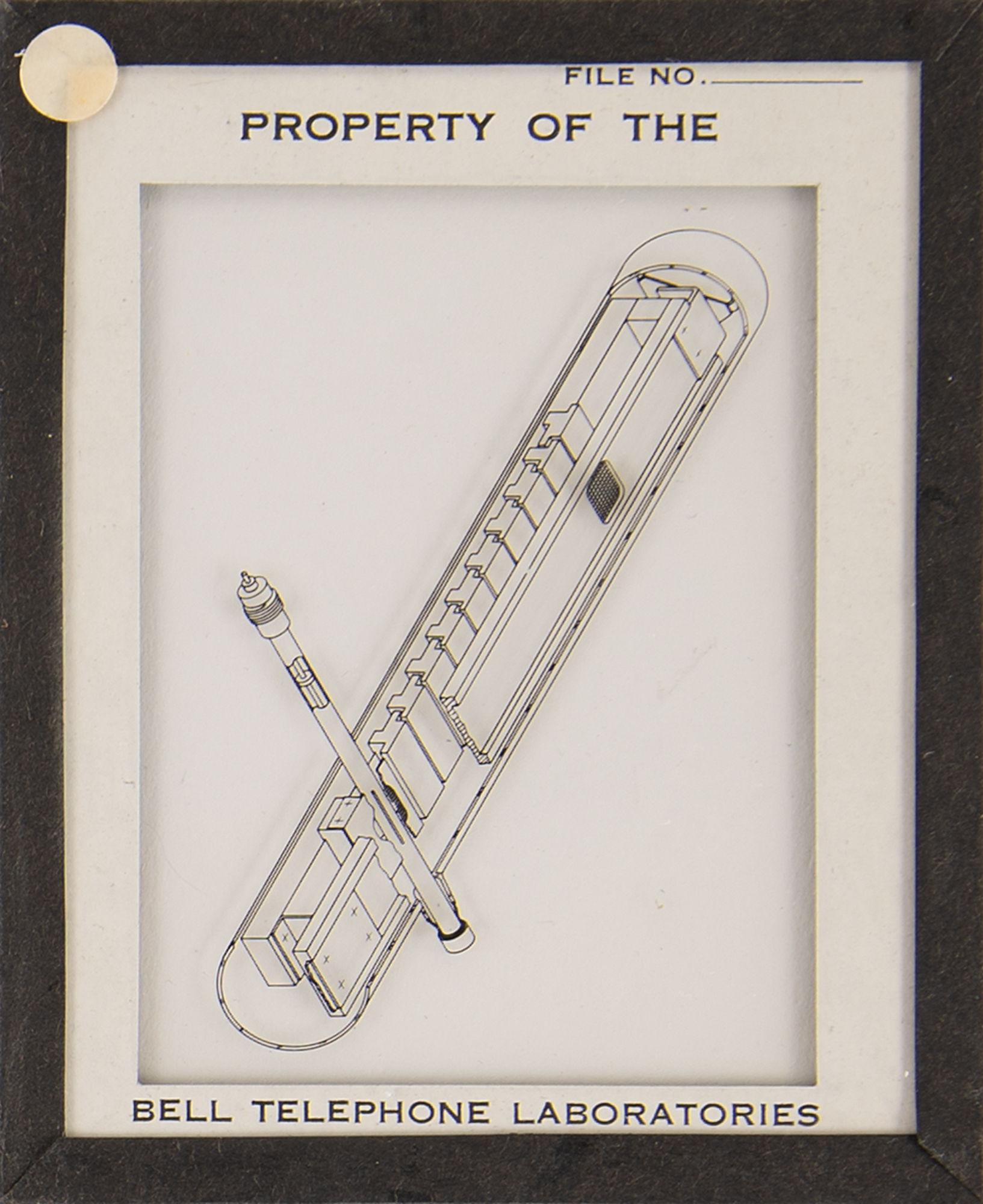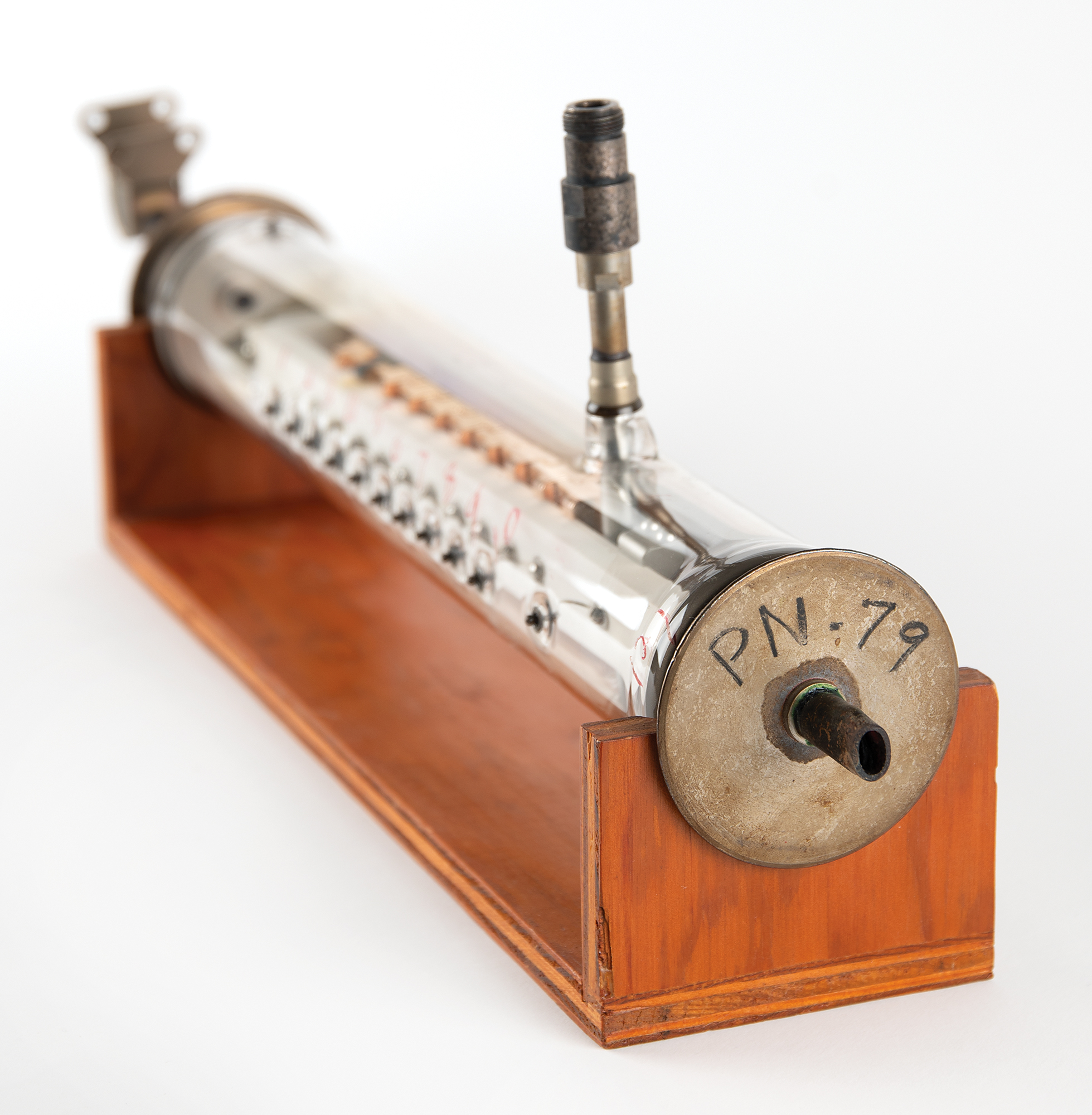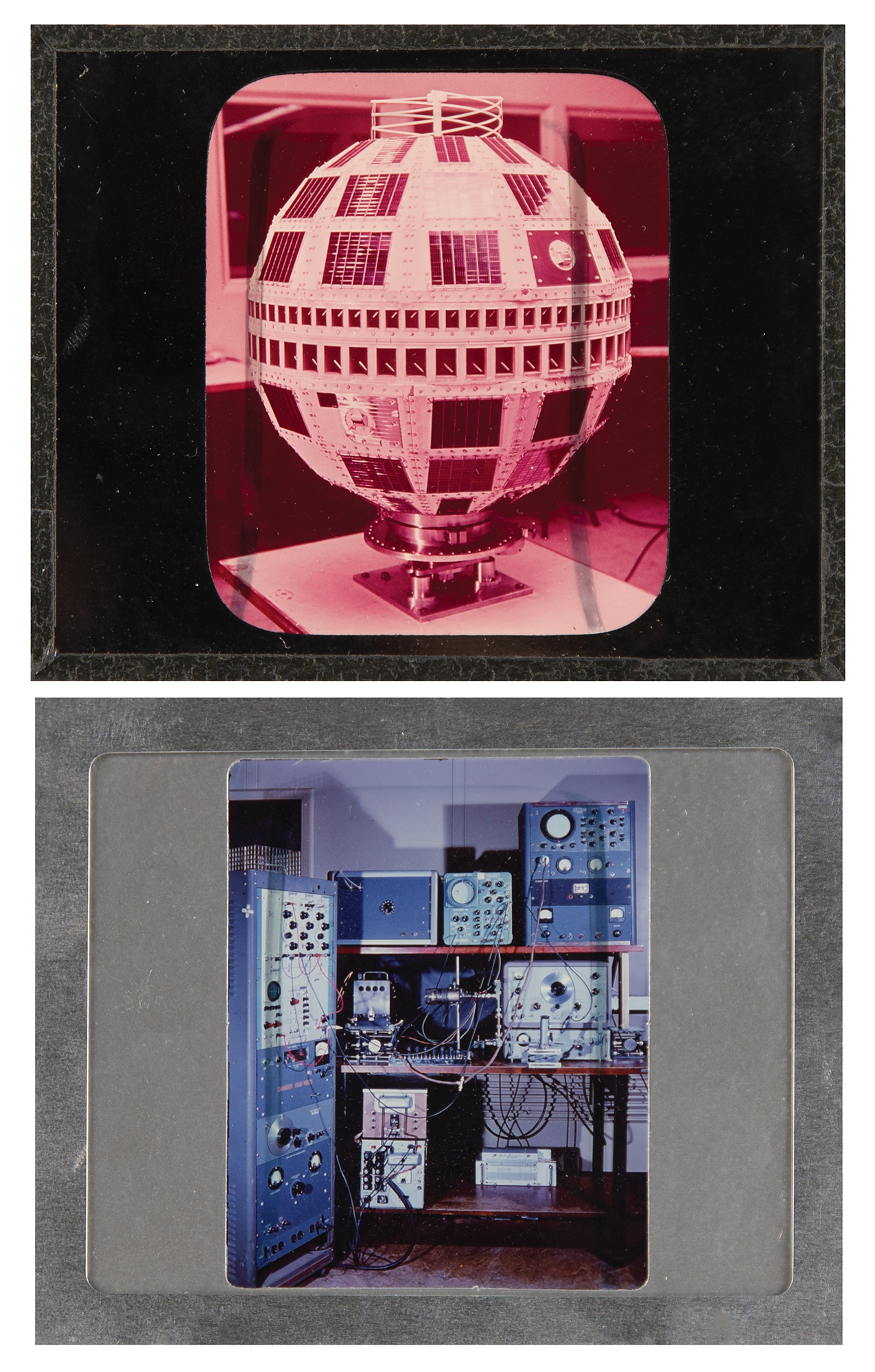 Diode array component associated with the proton/electron radiation experiment onboard Telstar 1, used to measure Van Allen Belt proton/electron distribution. Housed in a glass cylinder with metal endcaps (one marked "PN-79") and various ports, the piece measures approximately 24˝ long with a diameter of 3˝, and is accompanied by a wooden display stand. Also includes a group of 19 glass slides with images and schematics documenting this device and the Telstar 1. In overall fine condition.