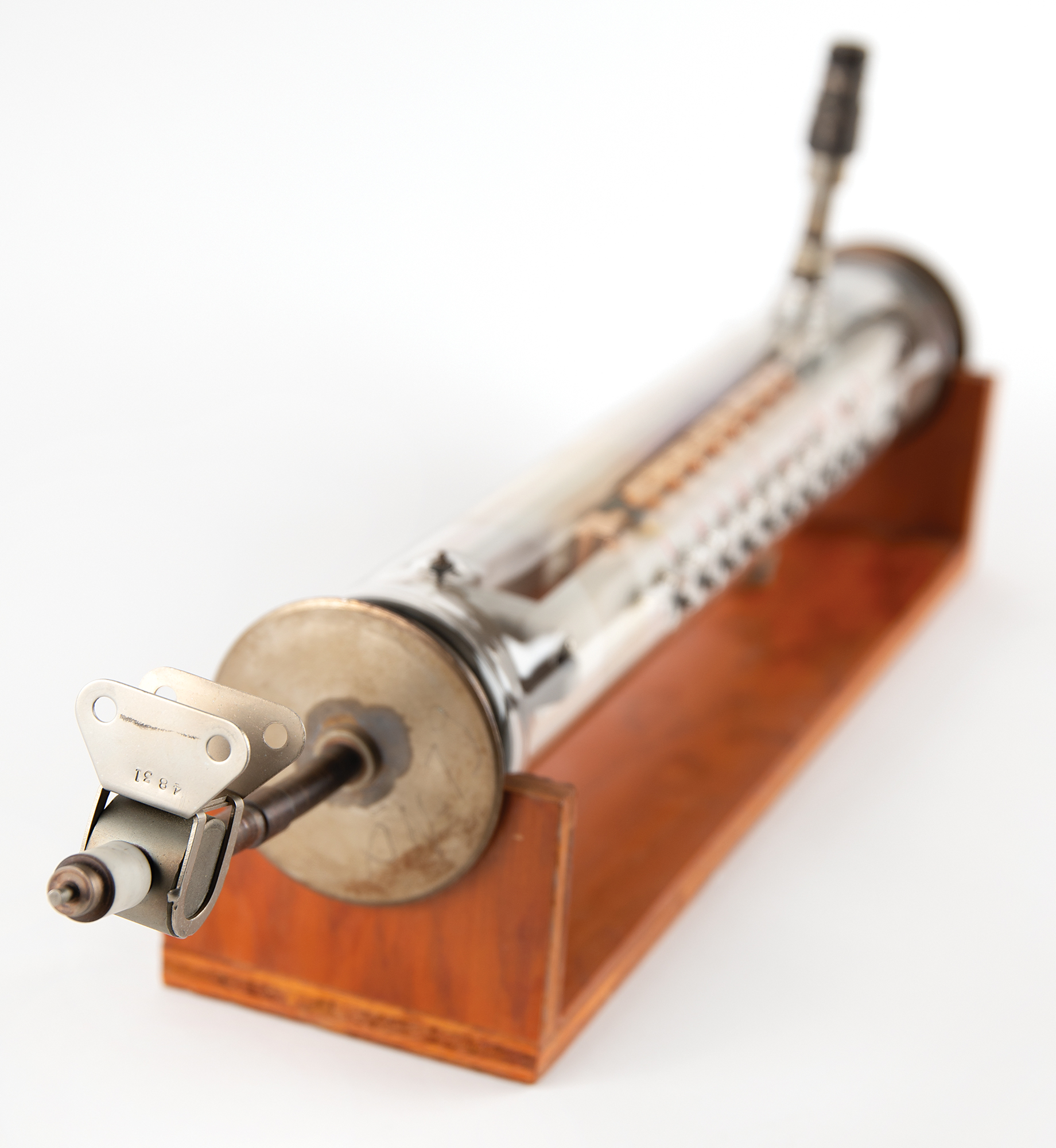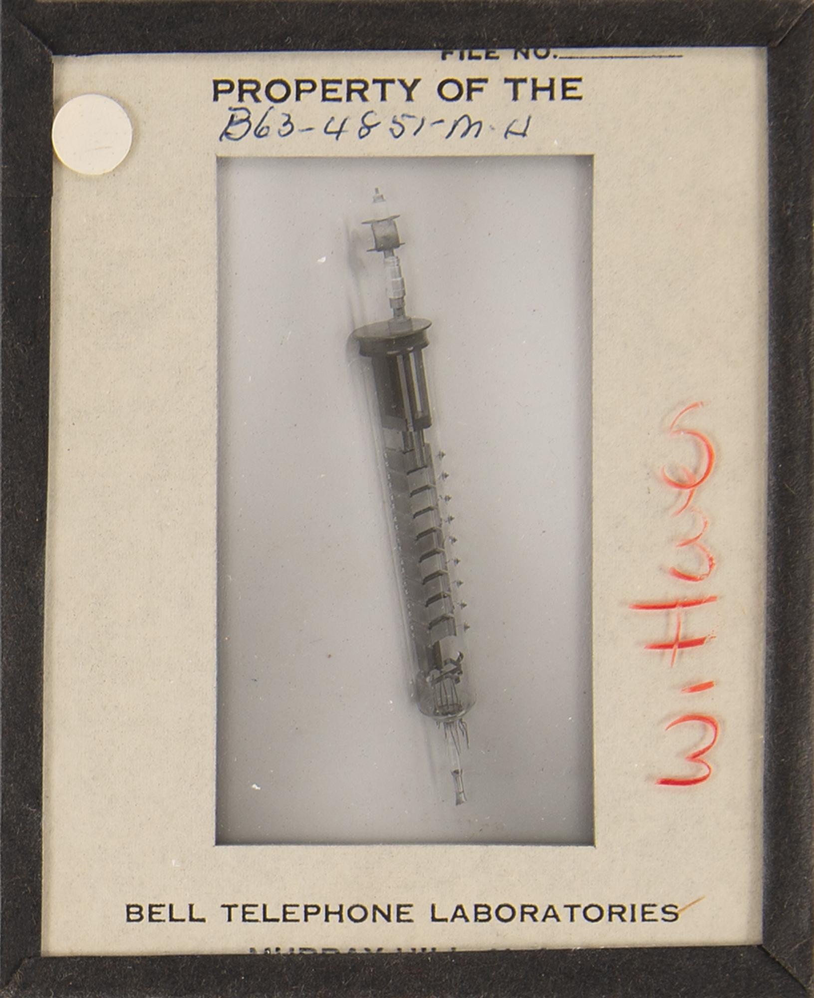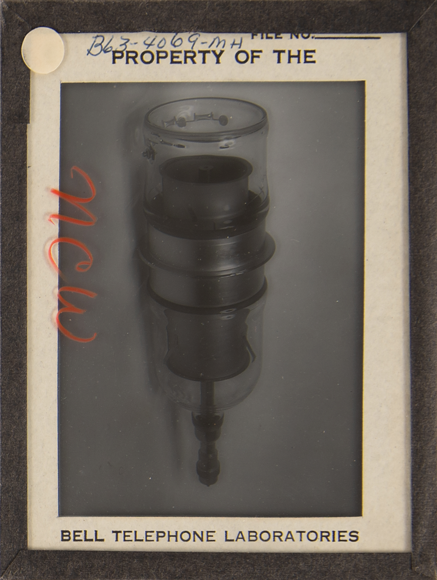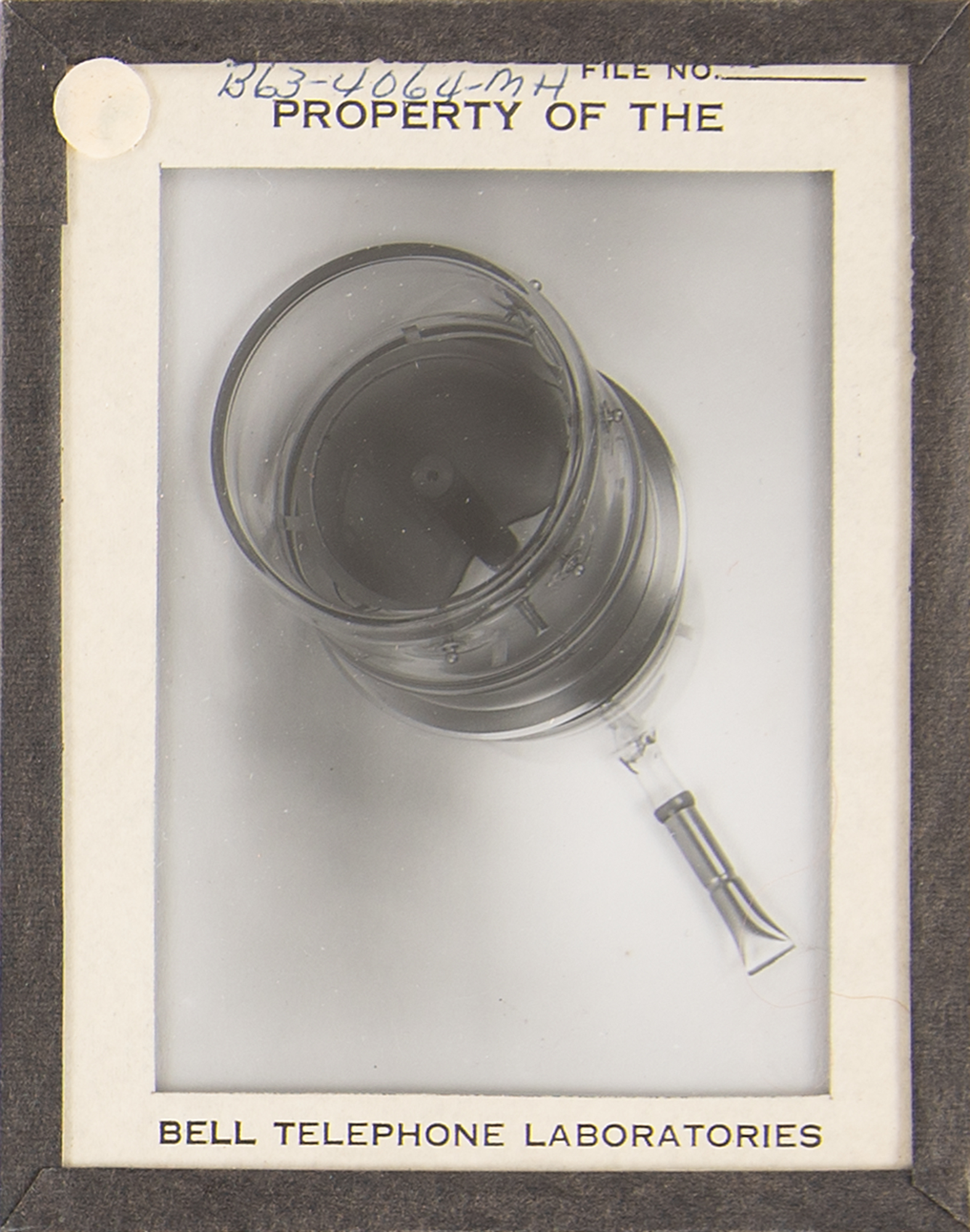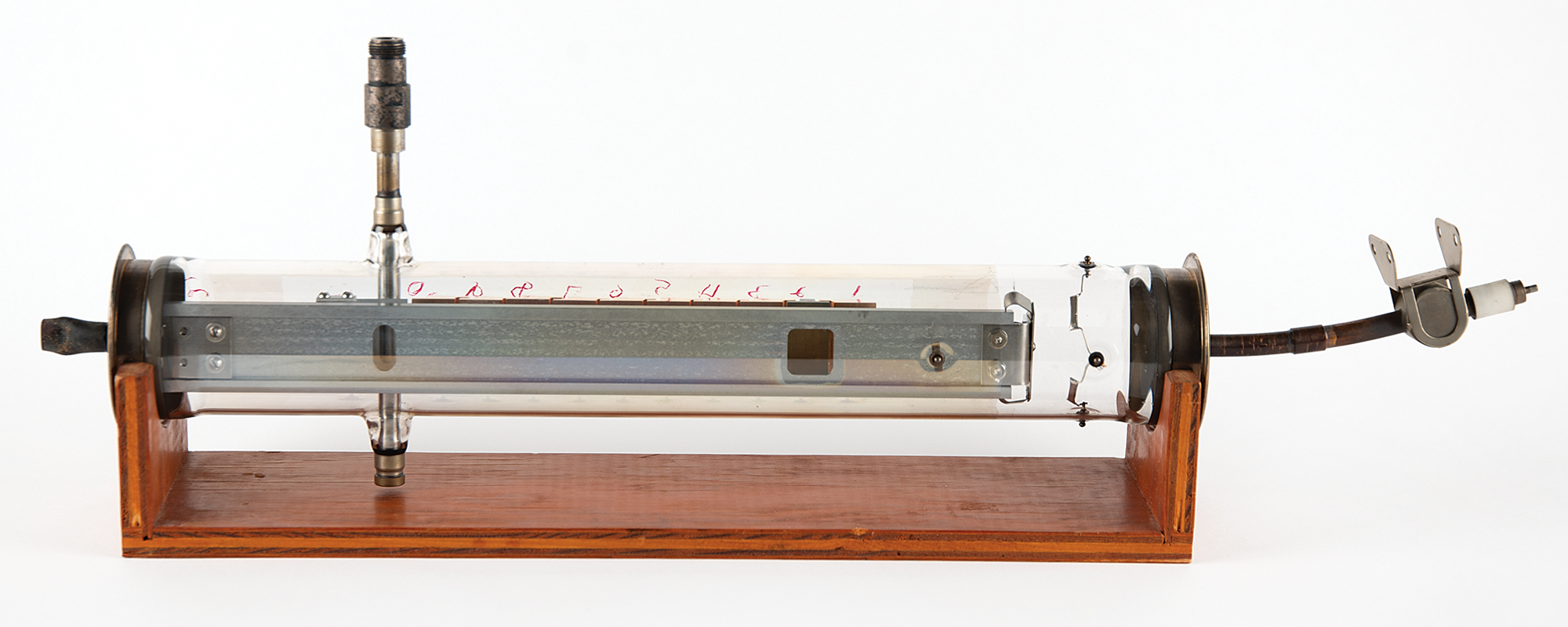 Diode array component associated with the proton/electron radiation experiment onboard Telstar 1, used to measure Van Allen Belt proton/electron distribution. Housed in a glass cylinder with metal endcaps (one marked "PN-79") and various ports, the piece measures approximately 24˝ long with a diameter of 3˝, and is accompanied by a wooden display stand. Also includes a group of 19 glass slides with images and schematics documenting this device and the Telstar 1. In overall fine condition.