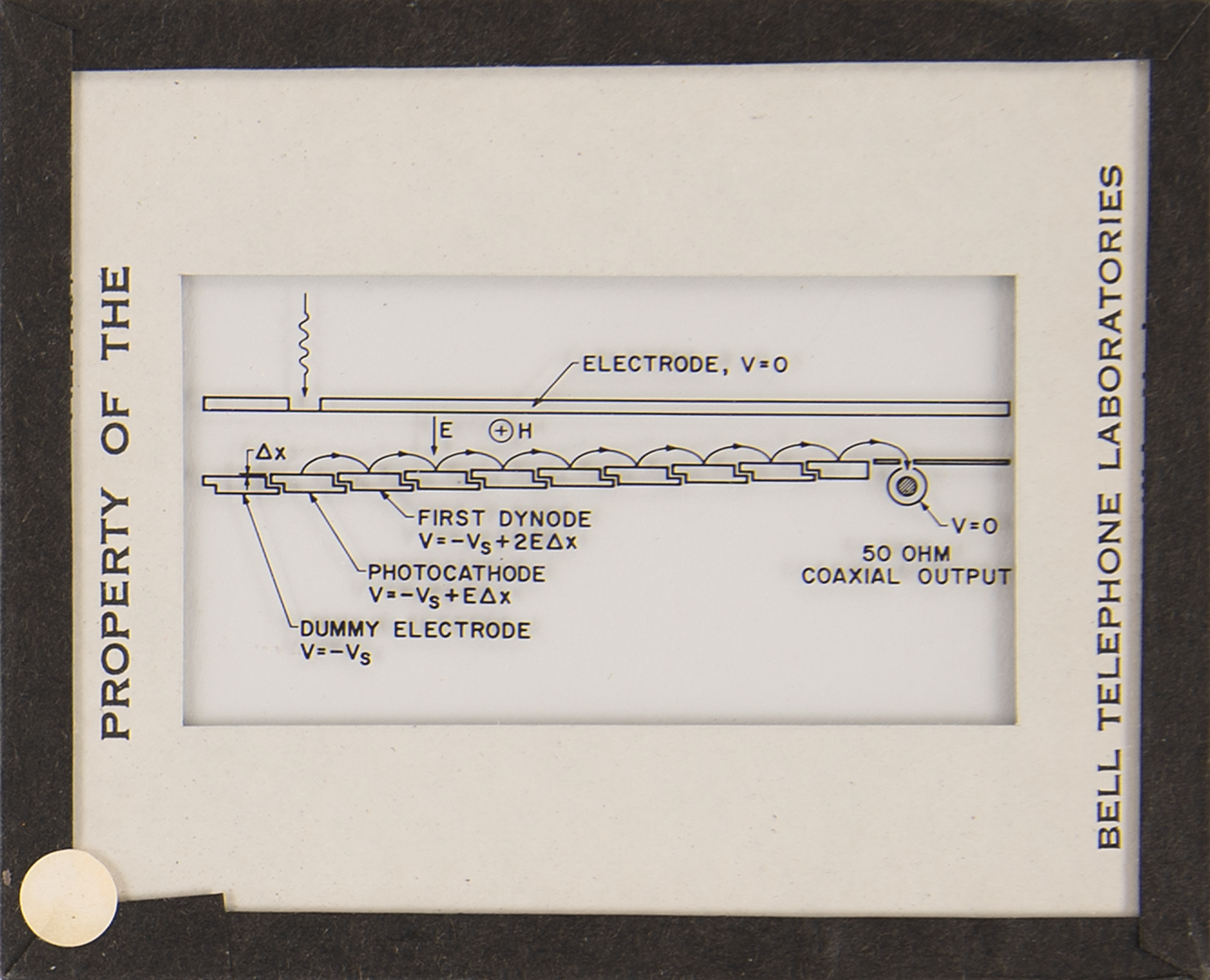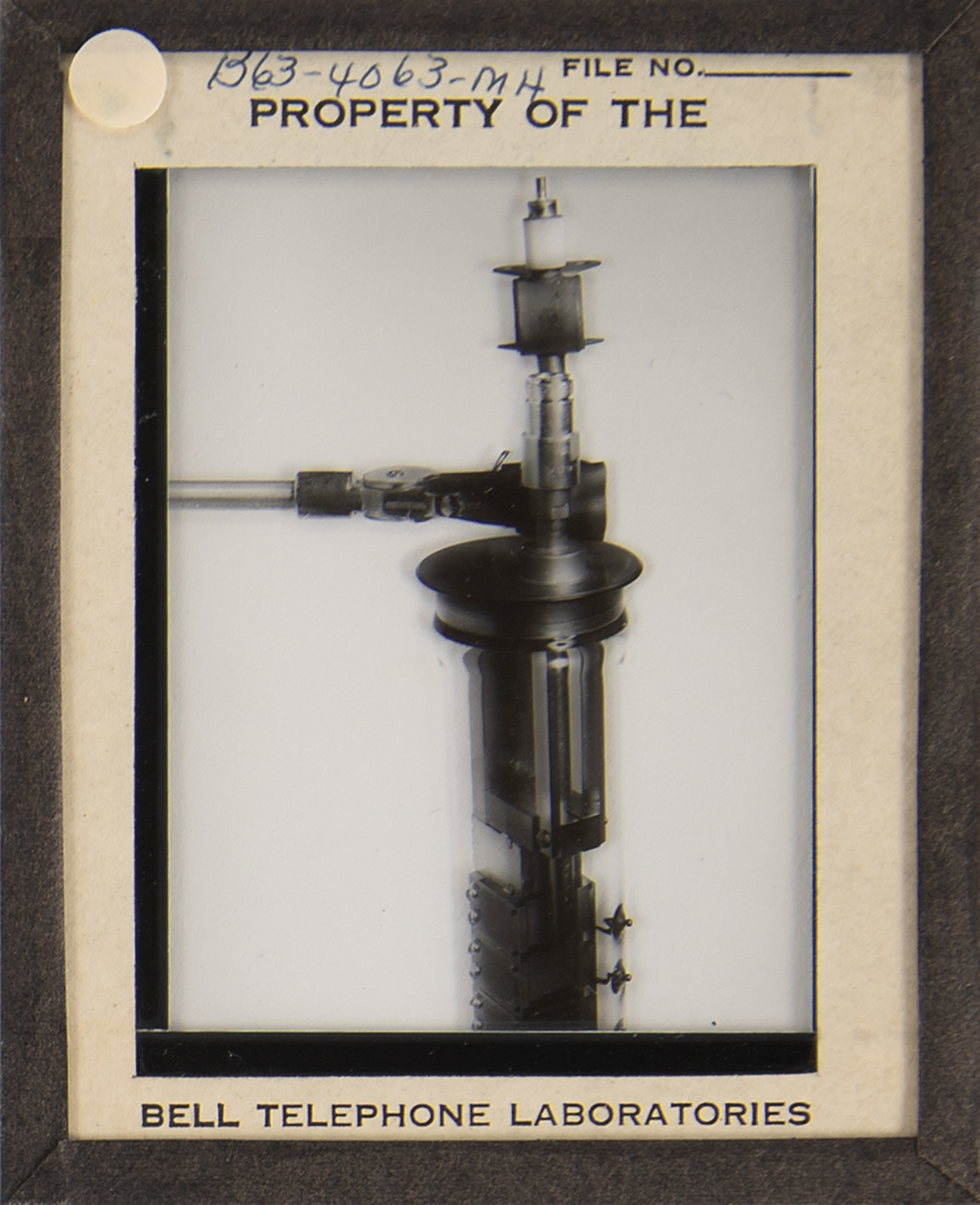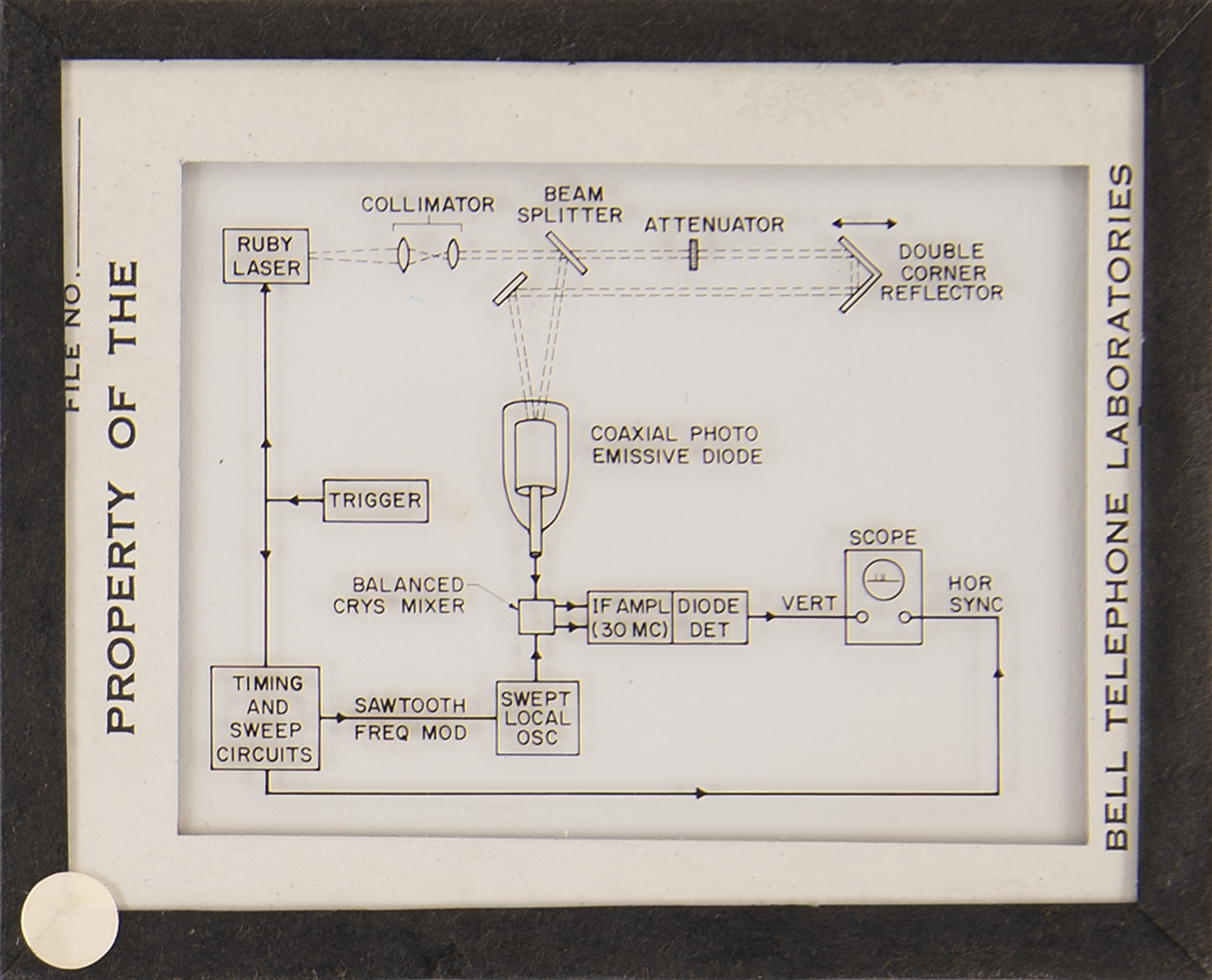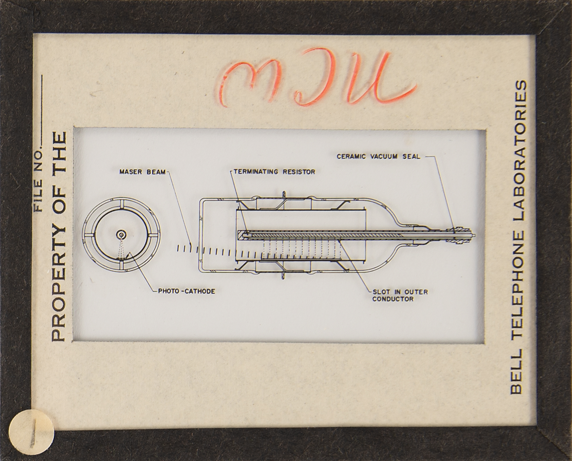 Diode array component associated with the proton/electron radiation experiment onboard Telstar 1, used to measure Van Allen Belt proton/electron distribution. Housed in a glass cylinder with metal endcaps (one marked "PN-79") and various ports, the piece measures approximately 24˝ long with a diameter of 3˝, and is accompanied by a wooden display stand. Also includes a group of 19 glass slides with images and schematics documenting this device and the Telstar 1. In overall fine condition.