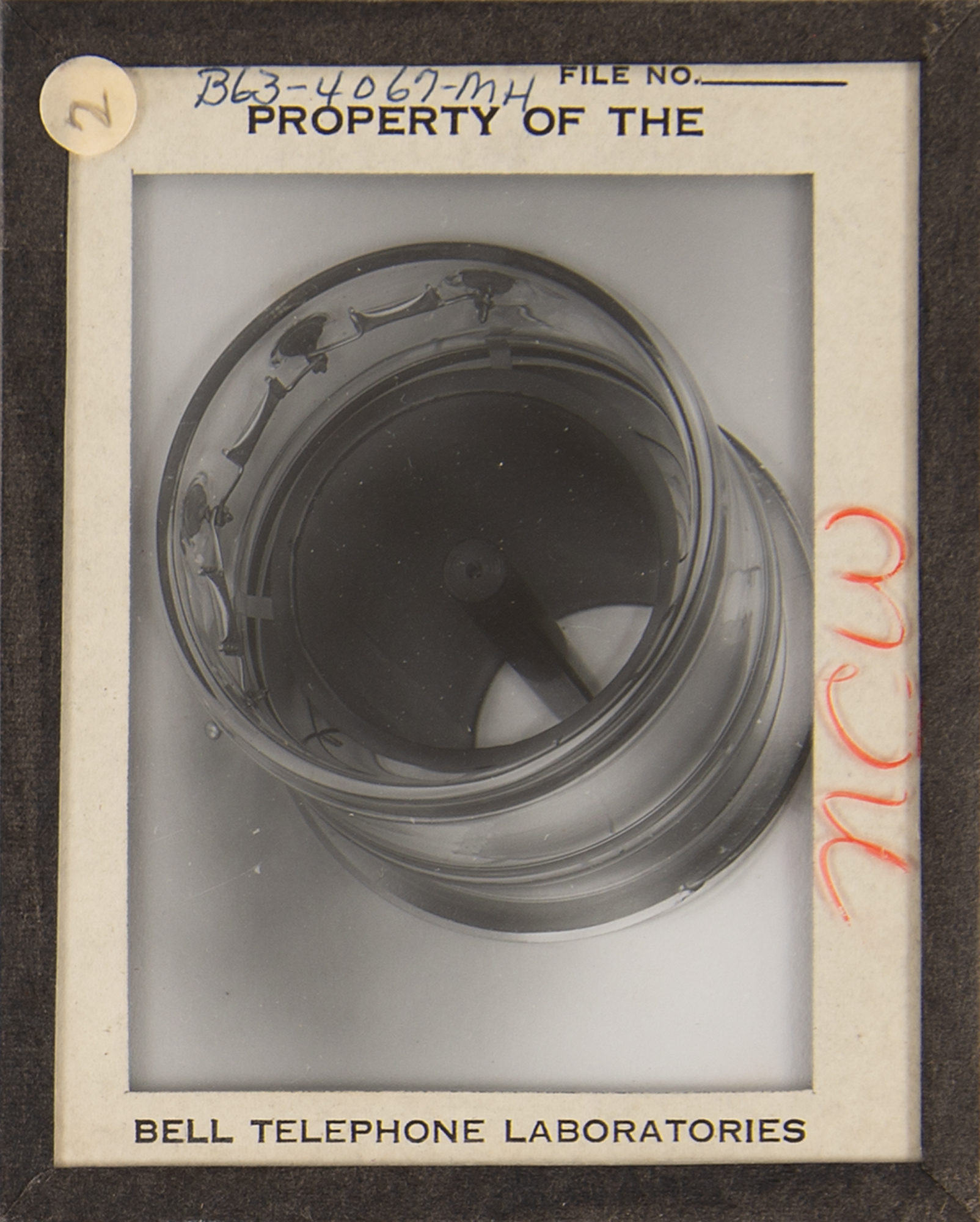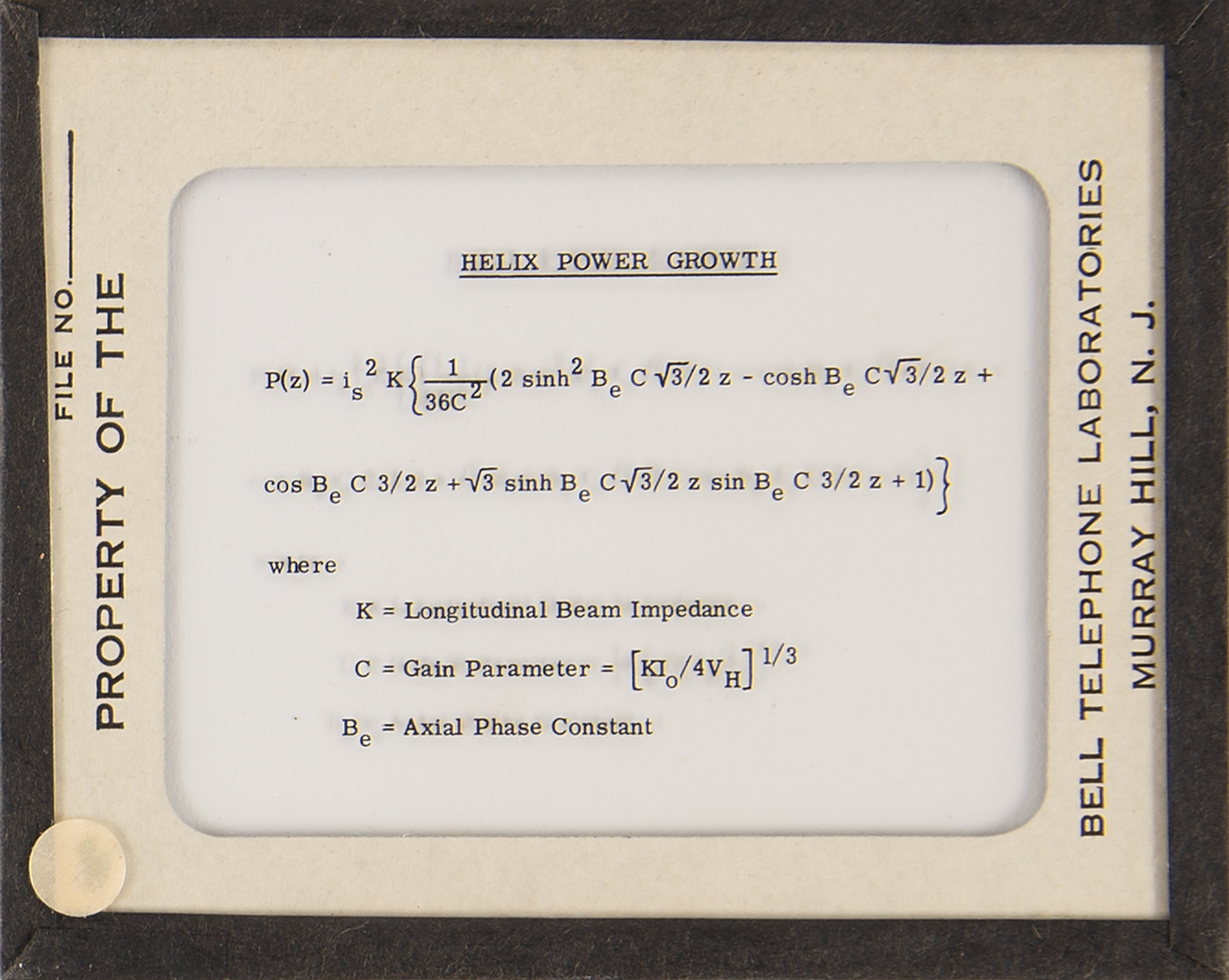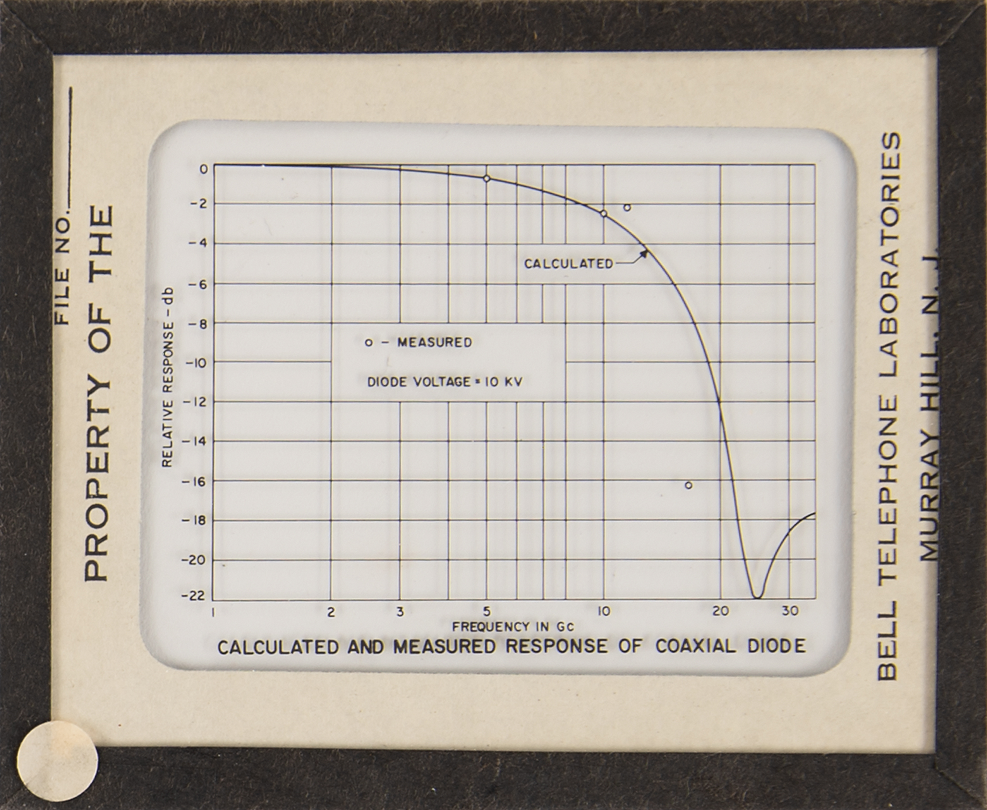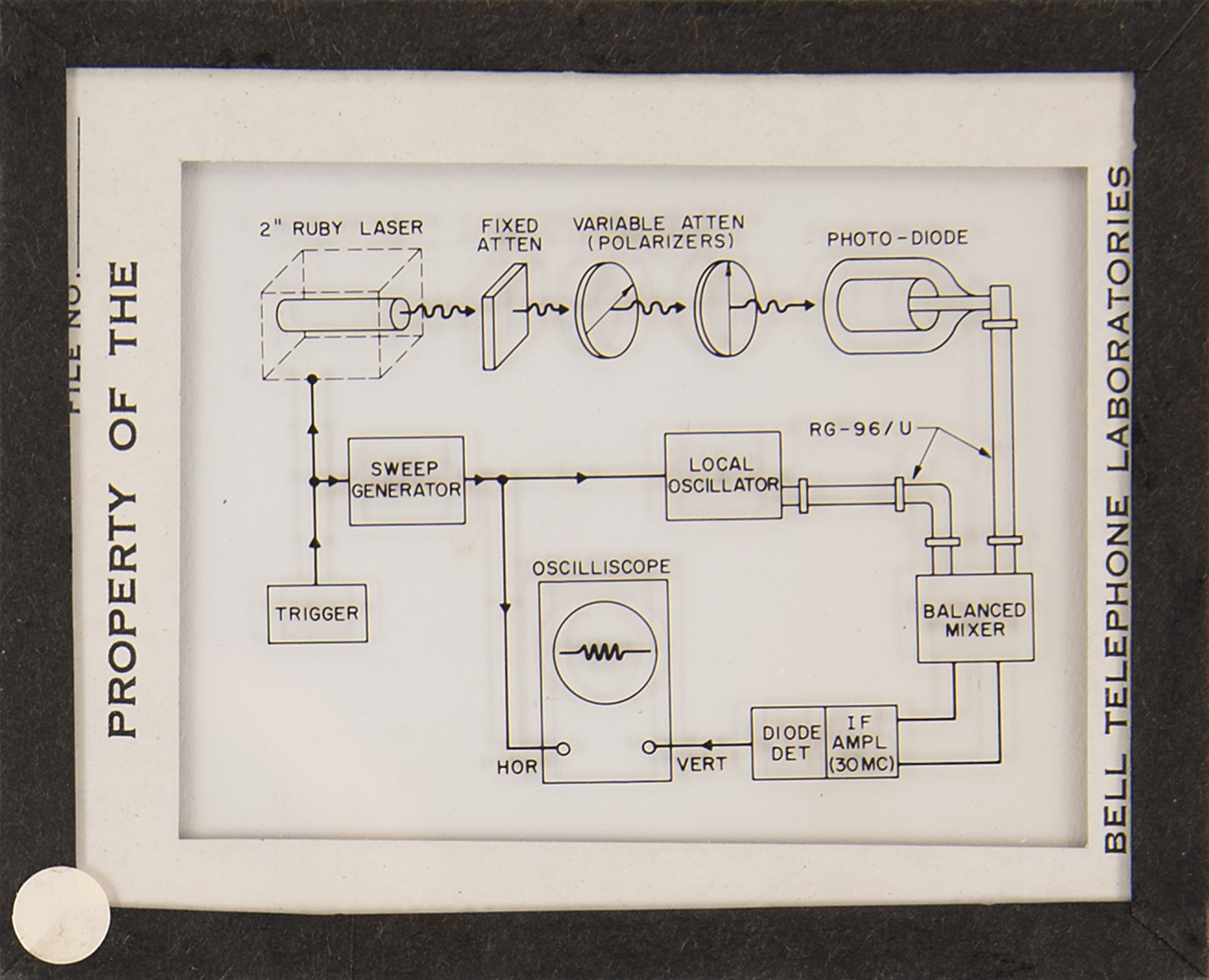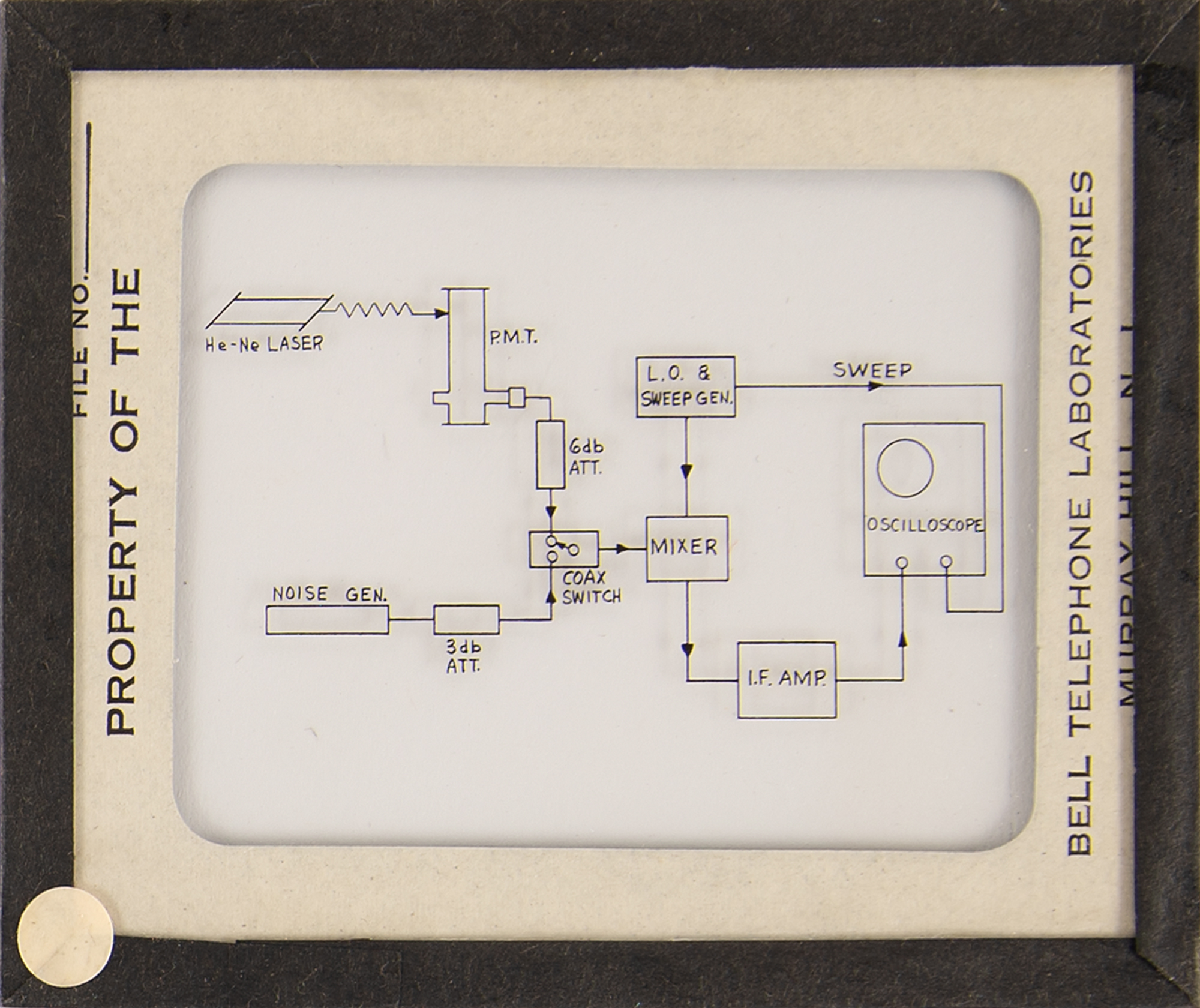 Diode array component associated with the proton/electron radiation experiment onboard Telstar 1, used to measure Van Allen Belt proton/electron distribution. Housed in a glass cylinder with metal endcaps (one marked "PN-79") and various ports, the piece measures approximately 24˝ long with a diameter of 3˝, and is accompanied by a wooden display stand. Also includes a group of 19 glass slides with images and schematics documenting this device and the Telstar 1. In overall fine condition.