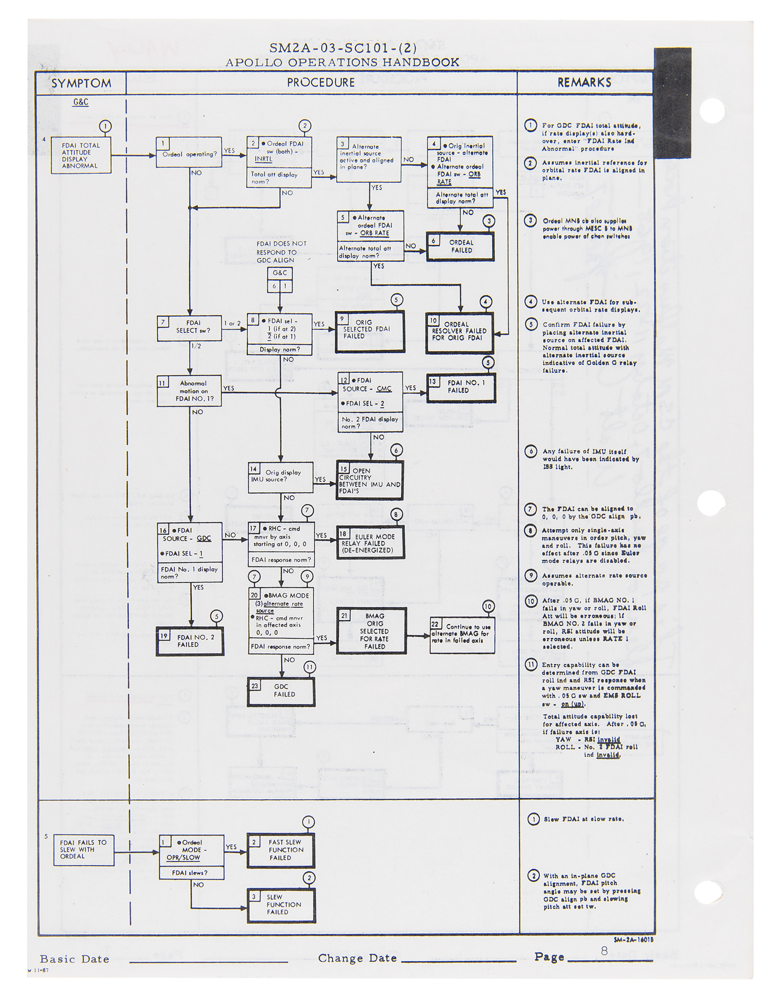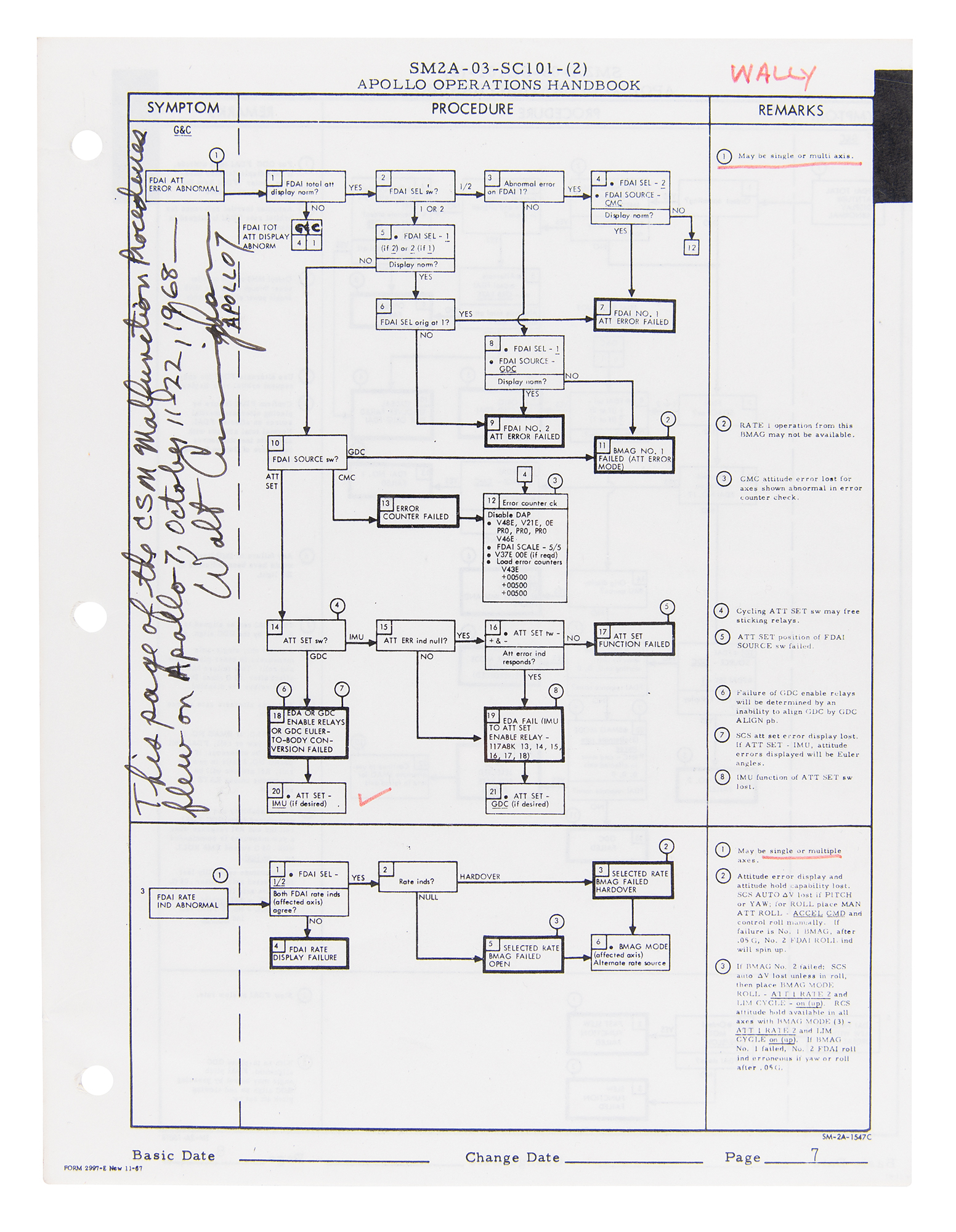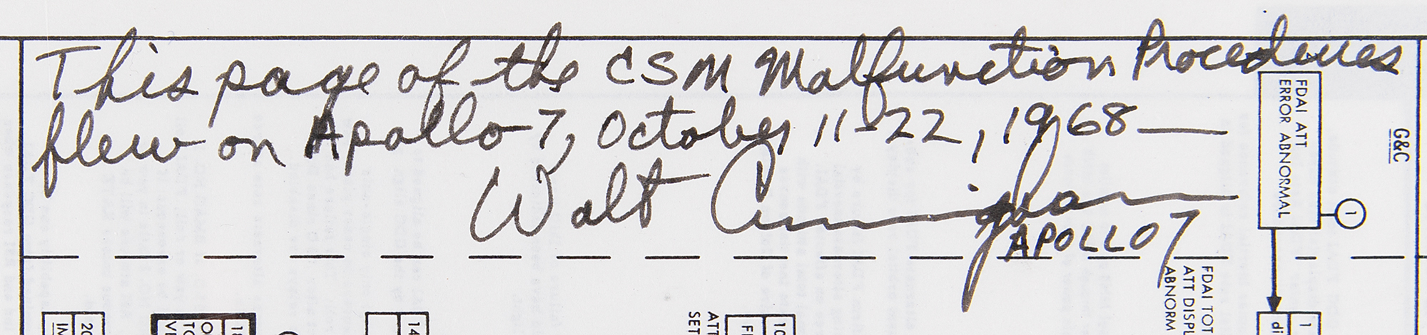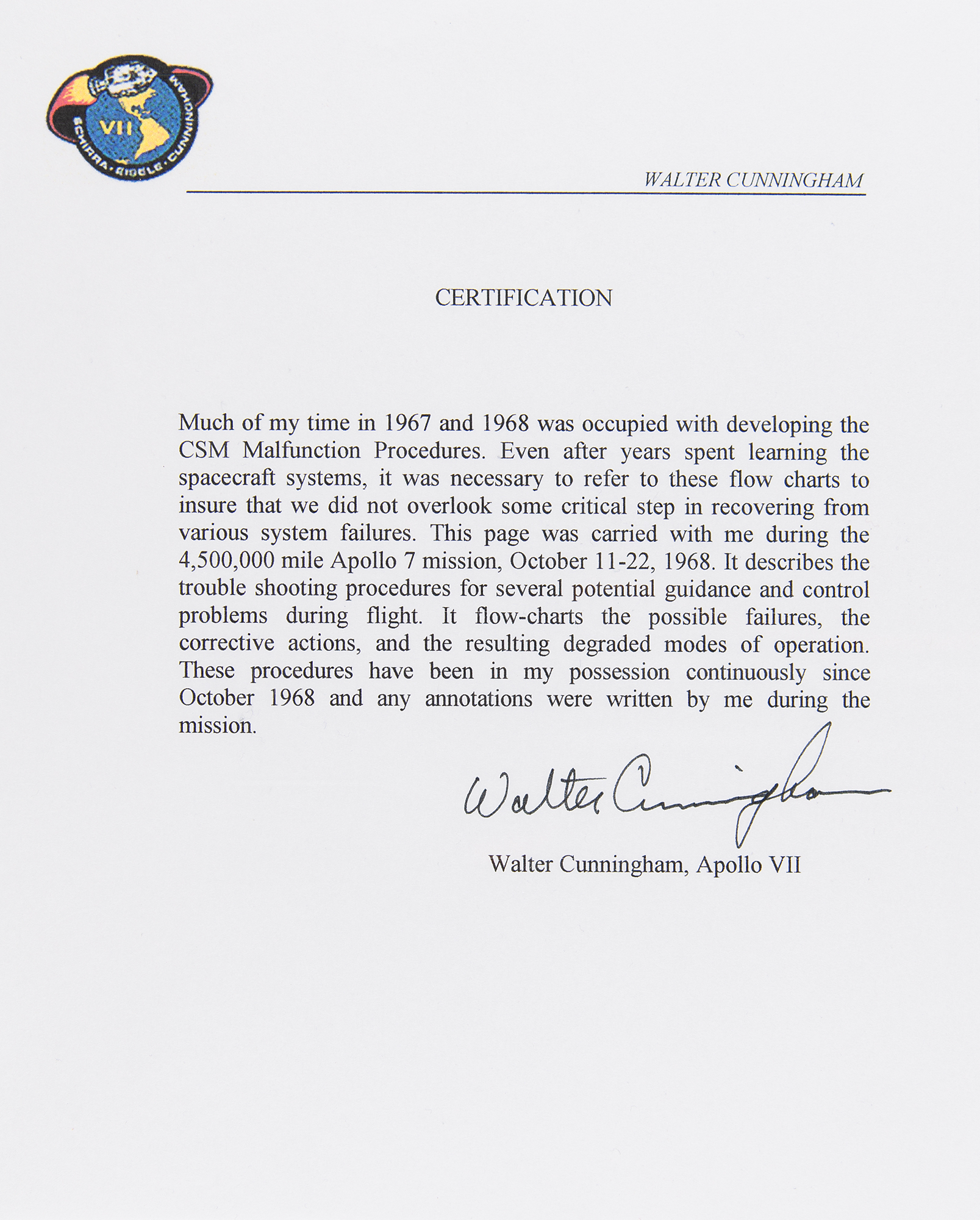 Accompanied by a letter of provenance signed by Cunningham, in full: "Much of my time in 1967 and 1968 was occupied with developing the CSM Malfunction Procedures. Even after years spent learning the spacecraft systems, it was necessary to refer to these flow charts to insure that we did not overlook some critical step in recovering from various system failures. This page was carried with me during the 4,500,000 mile Apollo 7 mission, October 11-22, 1968. It describes the trouble shooting procedures for several potential guidance and control problems during flight. It flow-charts the possible failures, the corrective actions, and the resulting degraded modes of operation. These procedures have been in my possession continuously since October 1968 and any annotations were written by me during the mission."