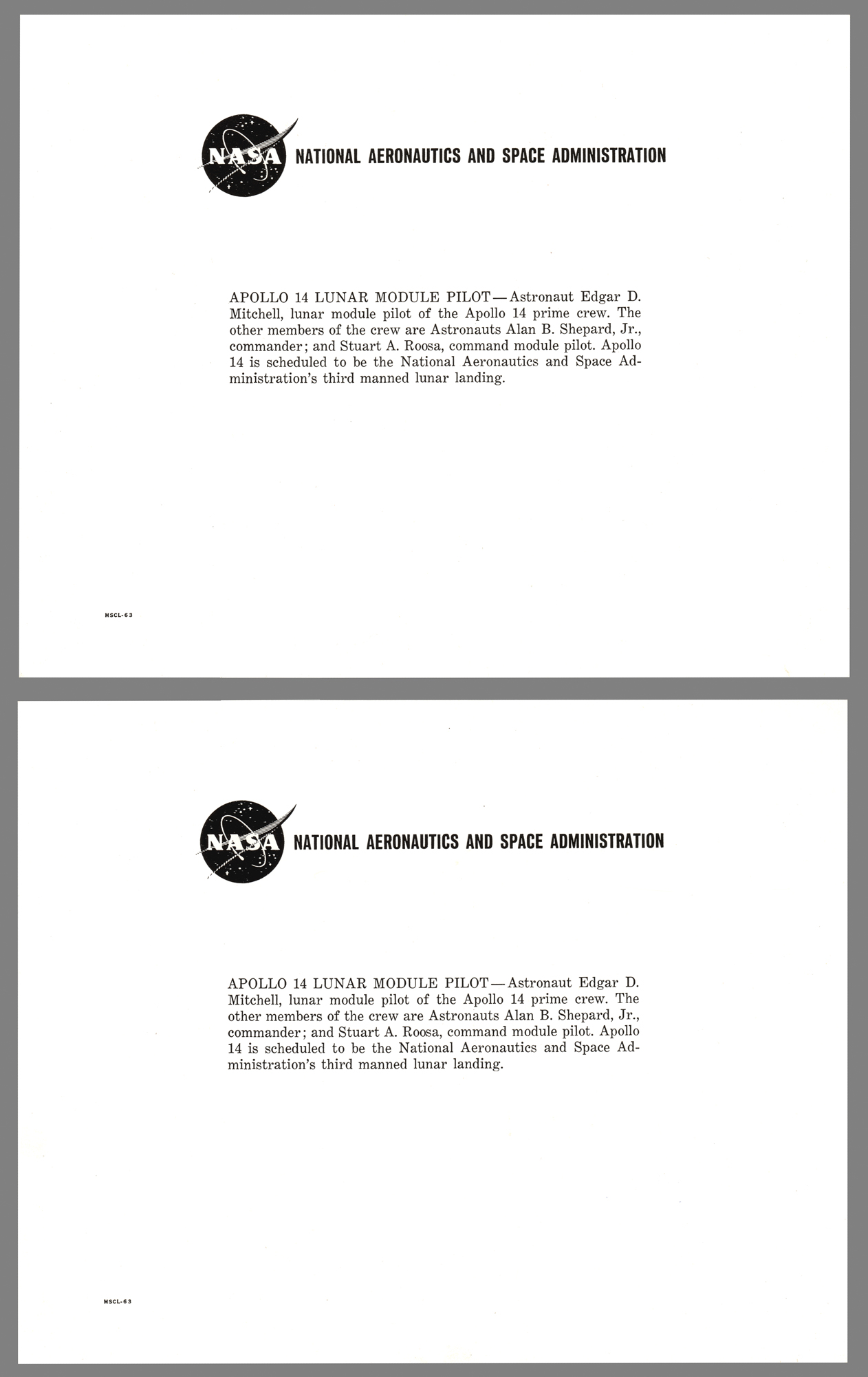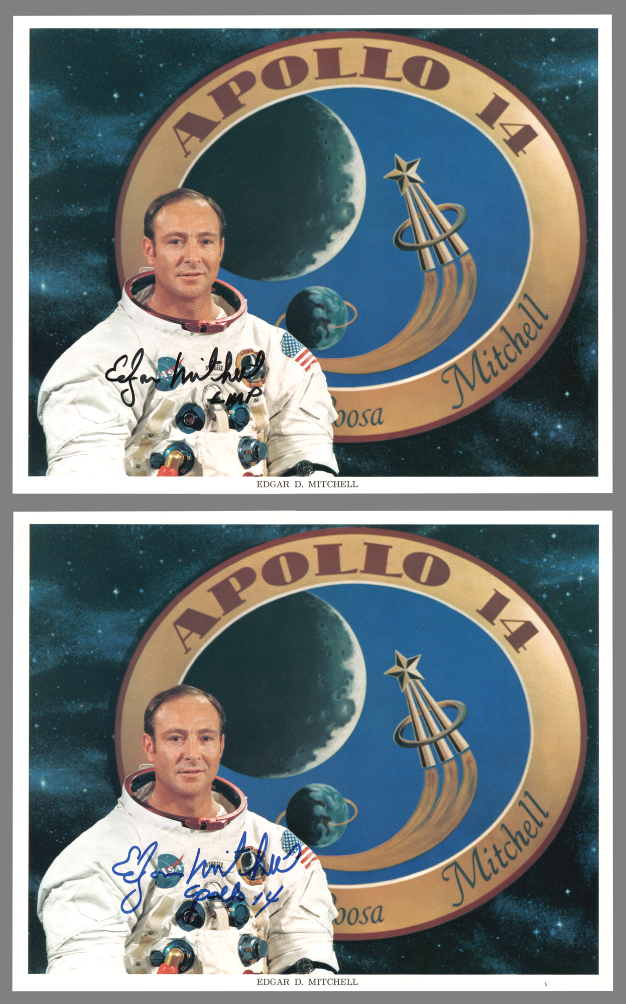 Two official color 10 x 8 NASA lithographs of Edgar Mitchell posing in his white space suit against the Apollo 14 mission insignia, individually signed in blue felt tip, "Edgar Mitchell, Apollo 14," and in black felt tip, "Edgar Mitchell, LMP." In overall very fine condition.