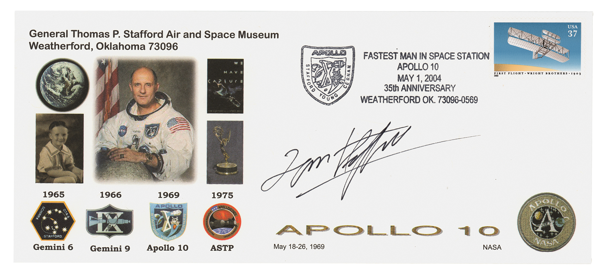 Commemorative cover with a cachet honoring the 35th anniversary of Tom Stafford's achievement of 'fastest man in space' on Apollo 10, signed in black felt tip, "Tom Stafford." In very fine condition.