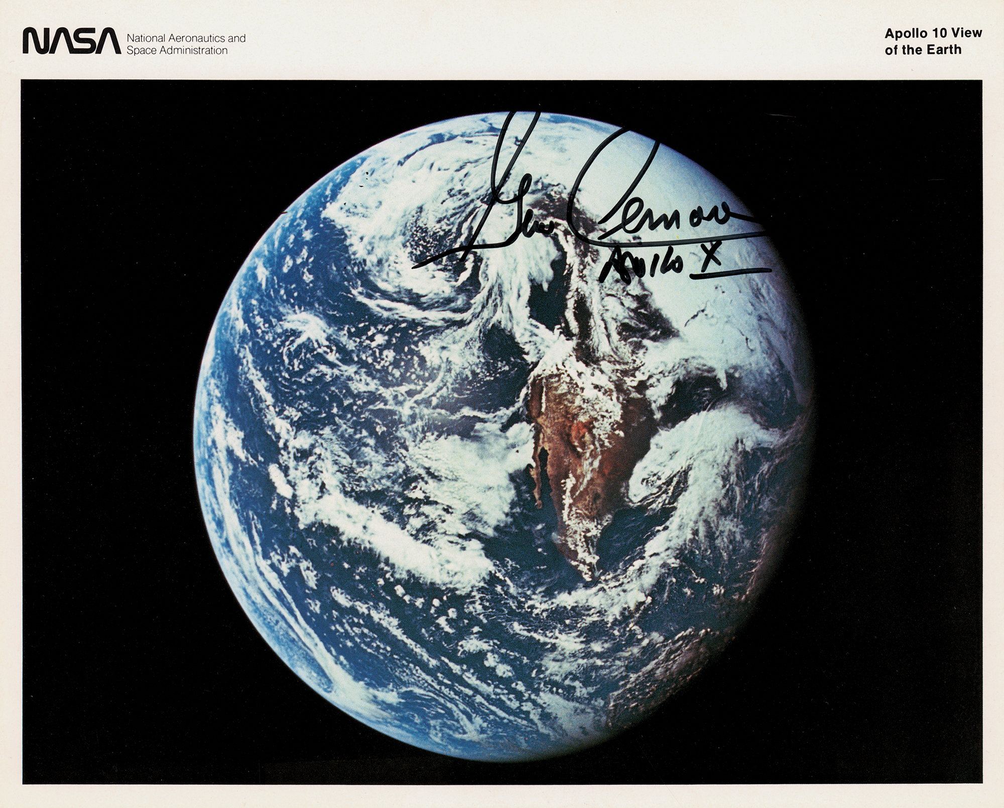 Official color 10 x 8 NASA lithograph of a view of Earth captured during Apollo 10, signed in black felt tip by the Lunar Module Pilot, "Gene Cernan, Apollo X." In fine condition.