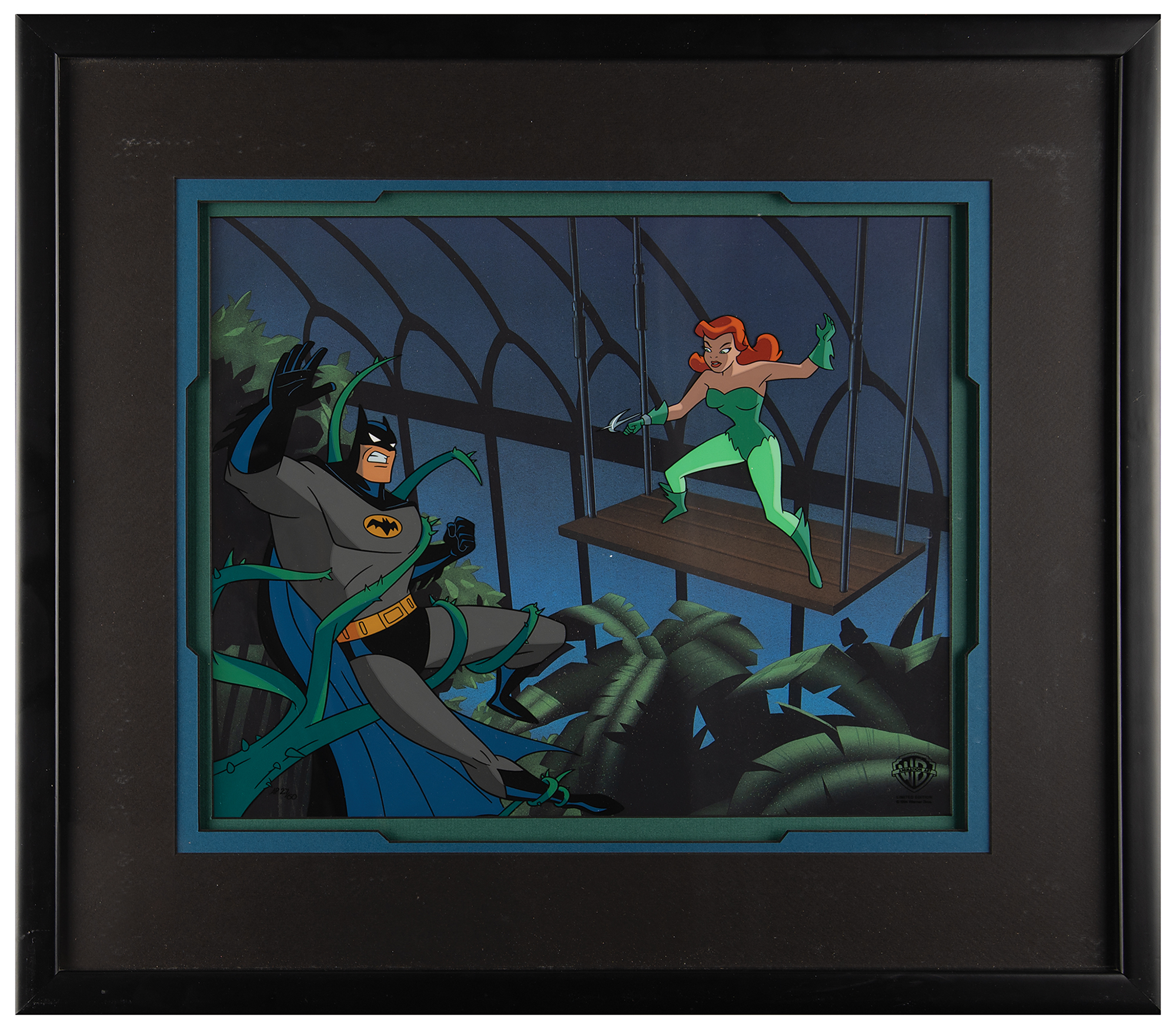 (Warner Brothers Studios, 1994) Limited edition hand-painted cel featuring Batman and Poison Ivy entitled ‘A Touch of Poison Ivy,’ numbered AP27/50, inspired by ‘Pretty Poison,’ episode nine of the first season of Batman: The Animated Series, which aired on September 14, 1992. The large cel, which is placed on a matching high-quality background print, shows Batman being entangled by spiky vines in the greenhouse lair of the beautiful-but-deadly villain, Poison Ivy. The character images measure 7.75 x 10.5 and 5 x 6, with a mat opening of 16 x 13. The lower right corner bears a Warner Bros. Animation seal. Triple-matted and framed to an overall size of 24.75 x 21.5. In fine condition. Accompanied by a certificate of authenticity from Warner Bros. Animation Art.