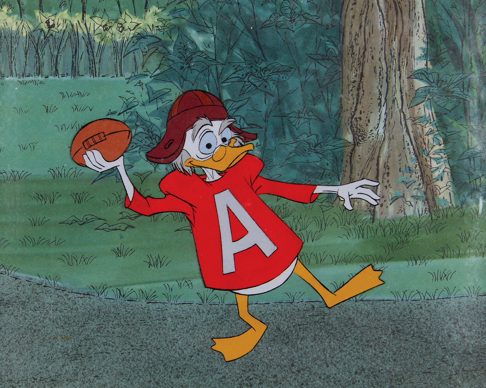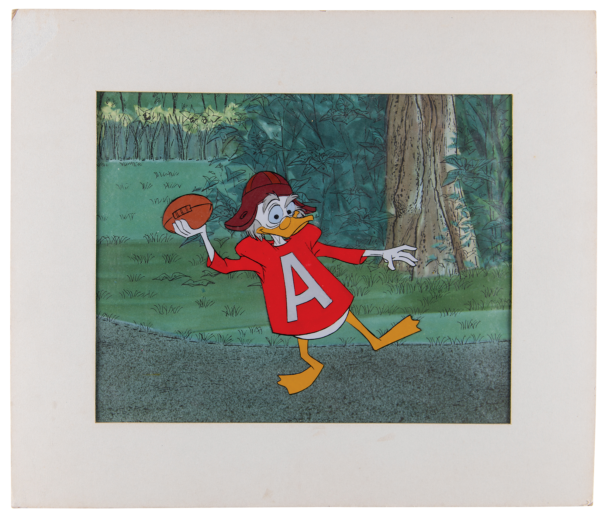 (Walt Disney Studios, 1961) Original production cel featuring Professor Ludwig Von Drake from Walt Disney's Wonderful World of Color, showing him in a full-length pose wearing a football uniform about to make a pass. The cel is placed on a Disney litho background. Image measures 6 x 5.5, with a mat opening of 10 x 8. Matted to an overall size of 14 x 12. Reverse of the backing bears a gold label stating that it is an original hand-painted celluloid actually used in a Walt Disney production, and was released exclusively at Disneyland. In fine condition, with some edgewear to the mat.