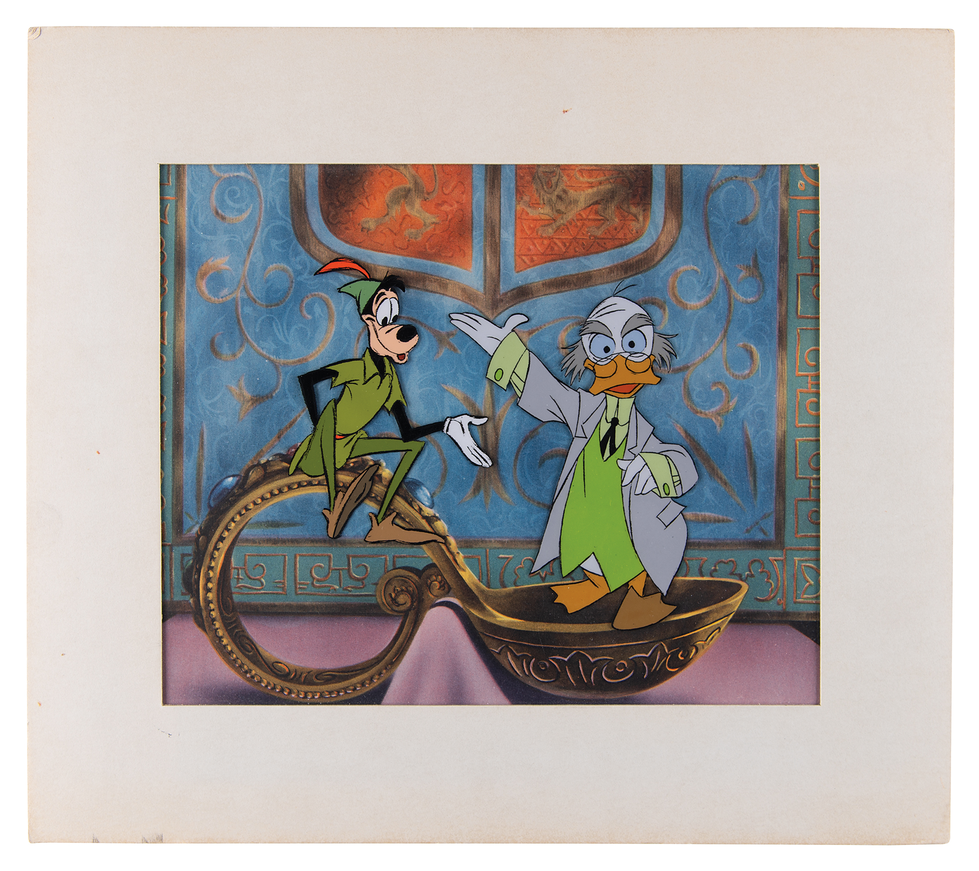 (Walt Disney Studios, 1961) Original production cel featuring Professor Ludwig Von Drake and Goofy from Walt Disney's Wonderful World of Color, showing both in full-length poses, with Goofy dressed as Peter Pan. The cel is placed on a Disney litho background. Images measure 3.25 x 4.25 and 3.5 x 5, with a mat opening of 10 x 8. Matted to an overall size of 14 x 12. Reverse of the backing bears a gold label stating that it is an original hand-painted celluloid actually used in a Walt Disney production, and was released exclusively at Disneyland. In fine condition, with some edgewear to the mat.