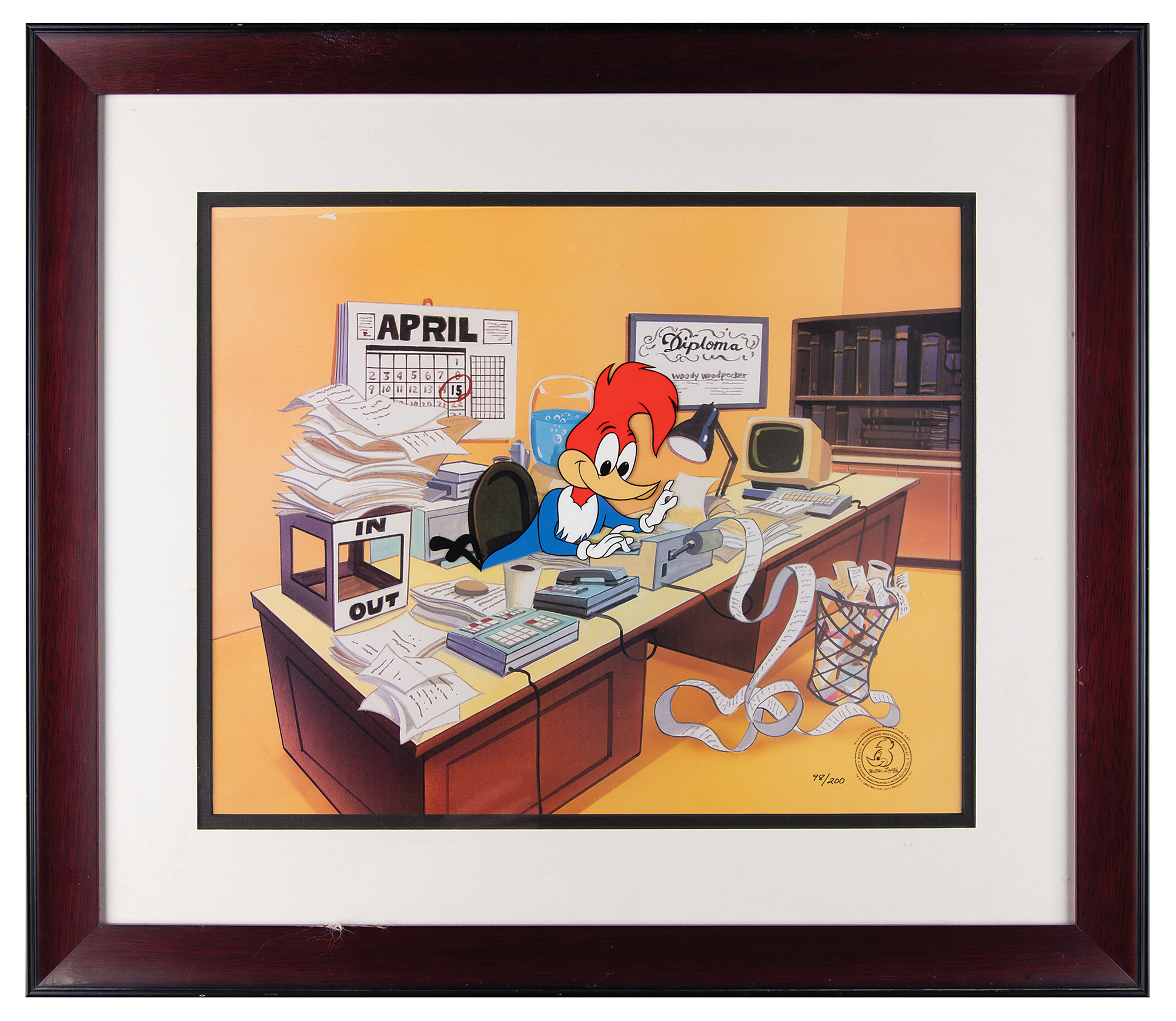 (Walter Lantz Productions, 1995) Original limited edition hand-painted cel from the Woody Woodpecker Profession Series entitled ‘Accountant,’ numbered 98/200, which depicts Woody Woodpecker in his office typing away at his cluttered desk. The cel is placed on a matching lithographic background. Image measures 5.5 x 4.25, with a mat opening of 16 x 13. Double-matted and framed to an overall size of 23.75 x 20.75. The piece has the Walter Lantz Productions seal to the lower right. In fine condition. Accompanied by a certificate of authenticity with matching edition number.