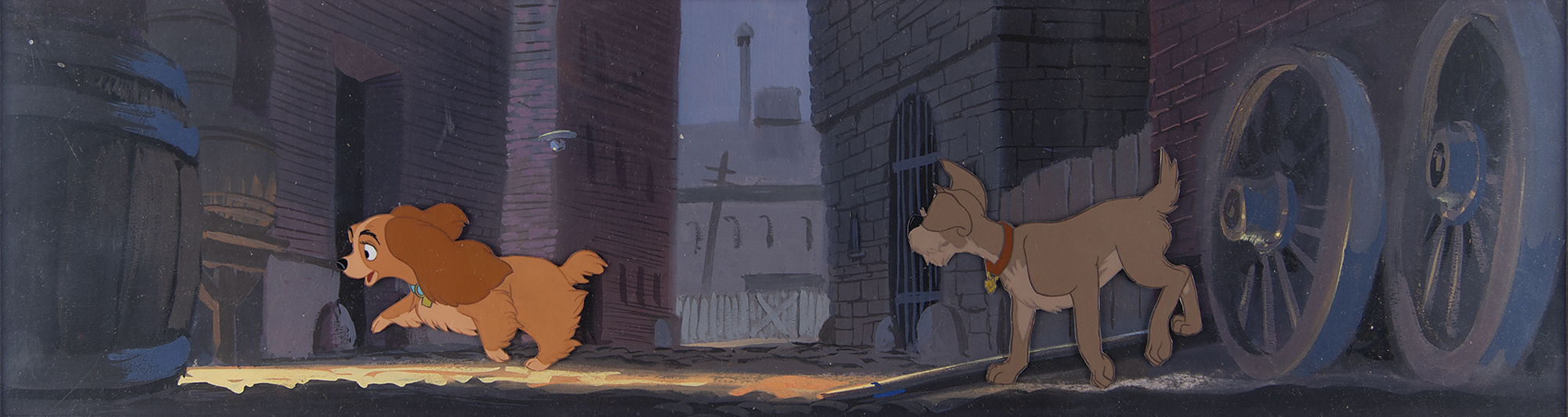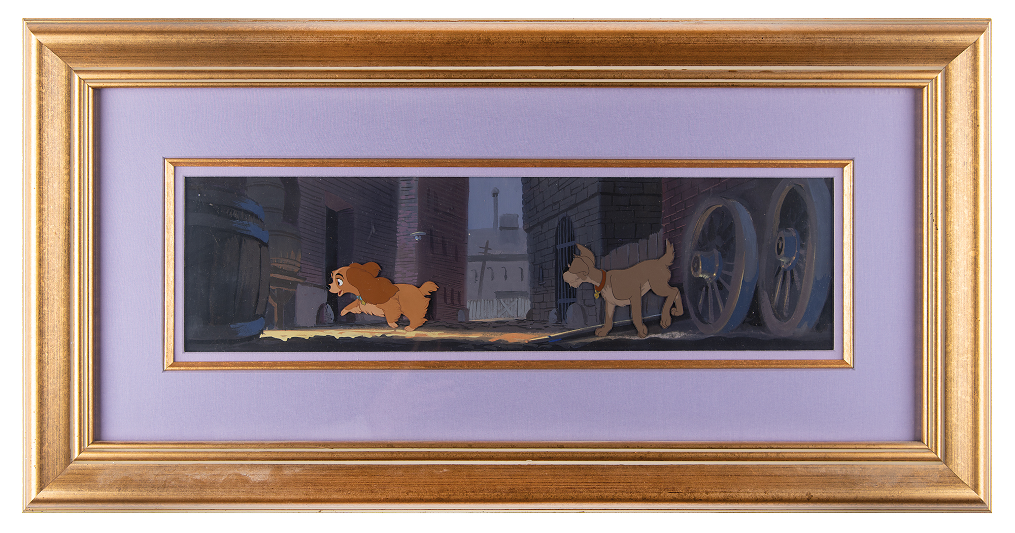 (Walt Disney Studios, 1955) Gorgeous original production key master background set-up from Lady and the Tramp, containing bright full-body production cels of the two title canines against a beautiful hand-painted panoramic key production background, which shows the dogs crossing a dimly lit alleyway towards the shine of an open doorway. The cel images have been trimmed to size and measure 3.5 x 2.25 (Lady) and 3.5 x 3 (Tramp), with a mat opening of 19 x 5. Handsomely cloth-matted and framed to an overall size of 28.25 x 14.5. In fine condition.
