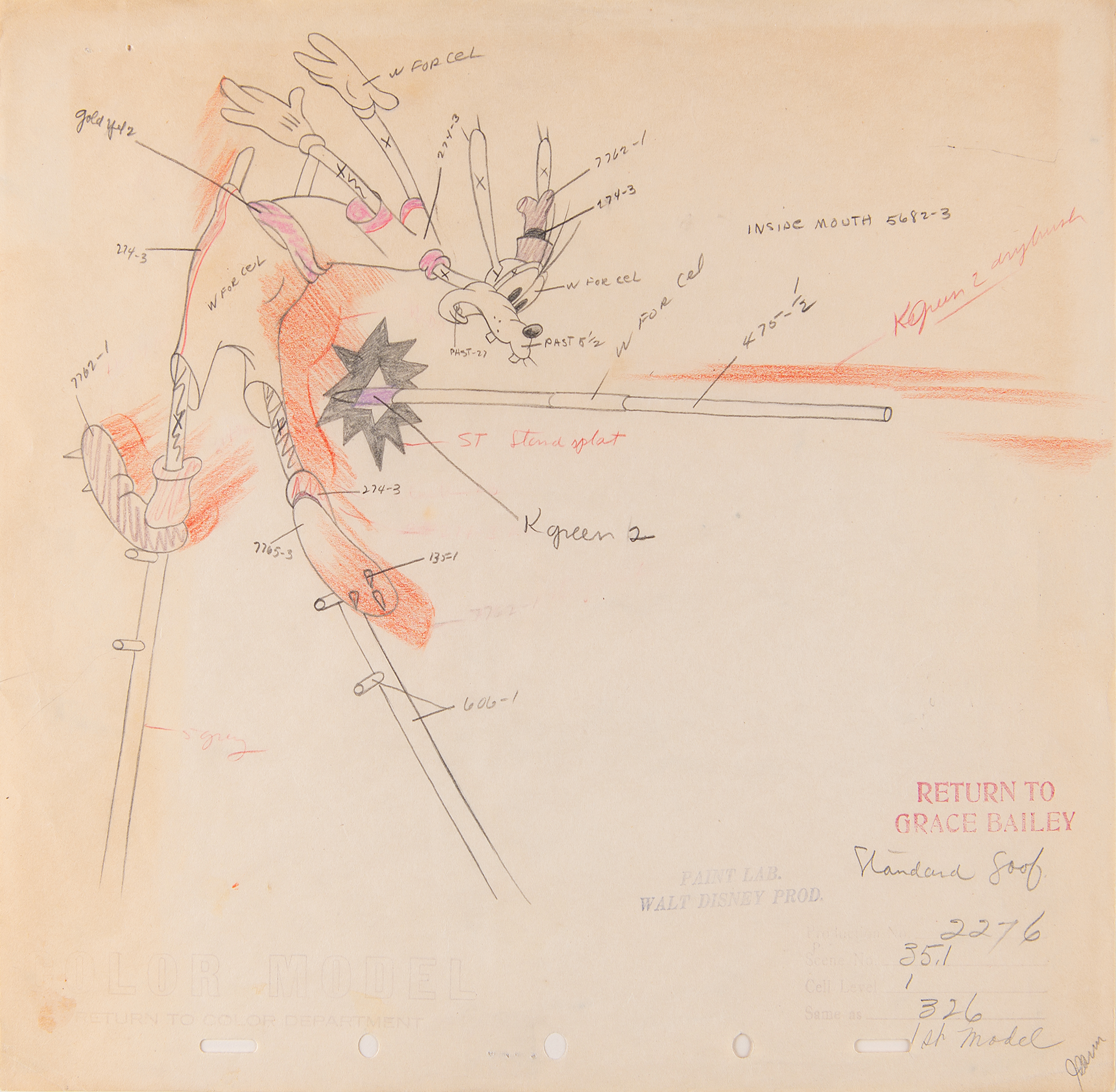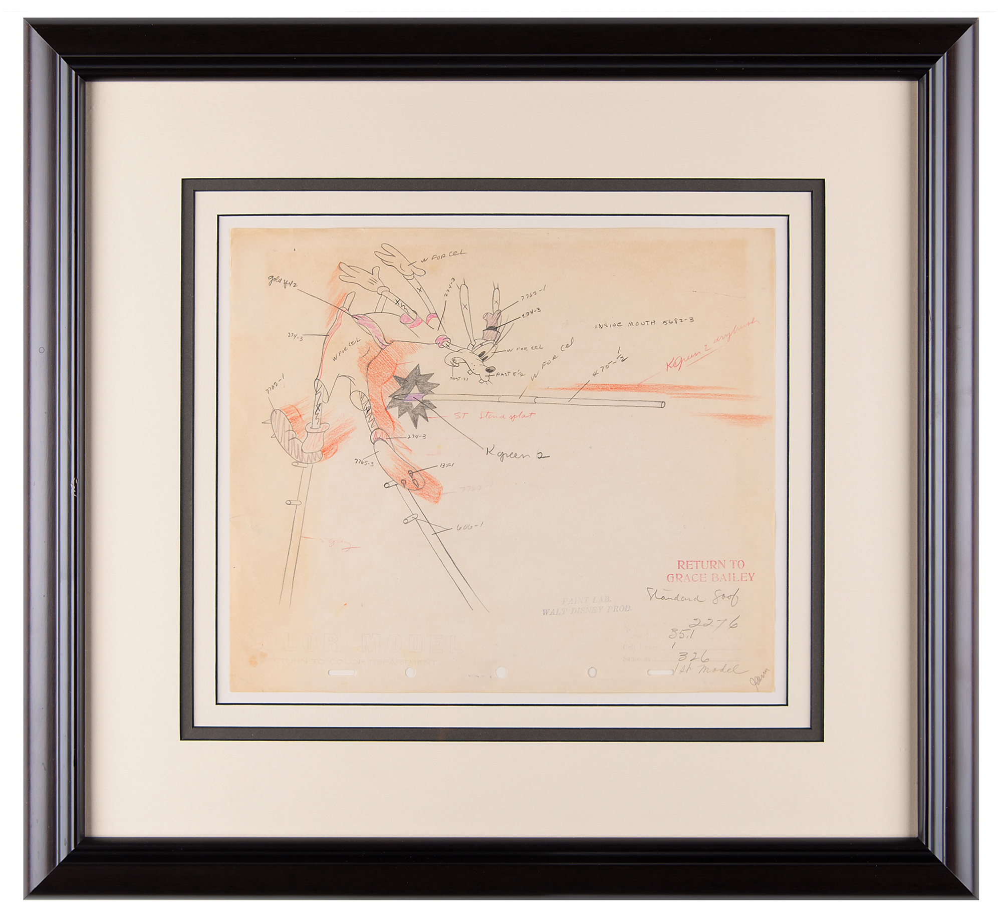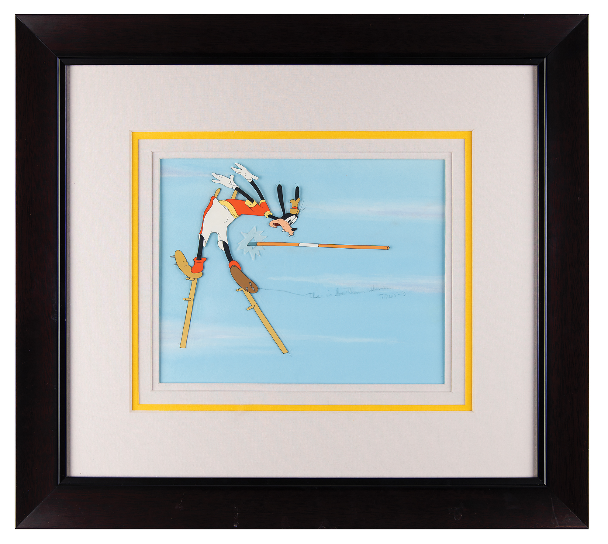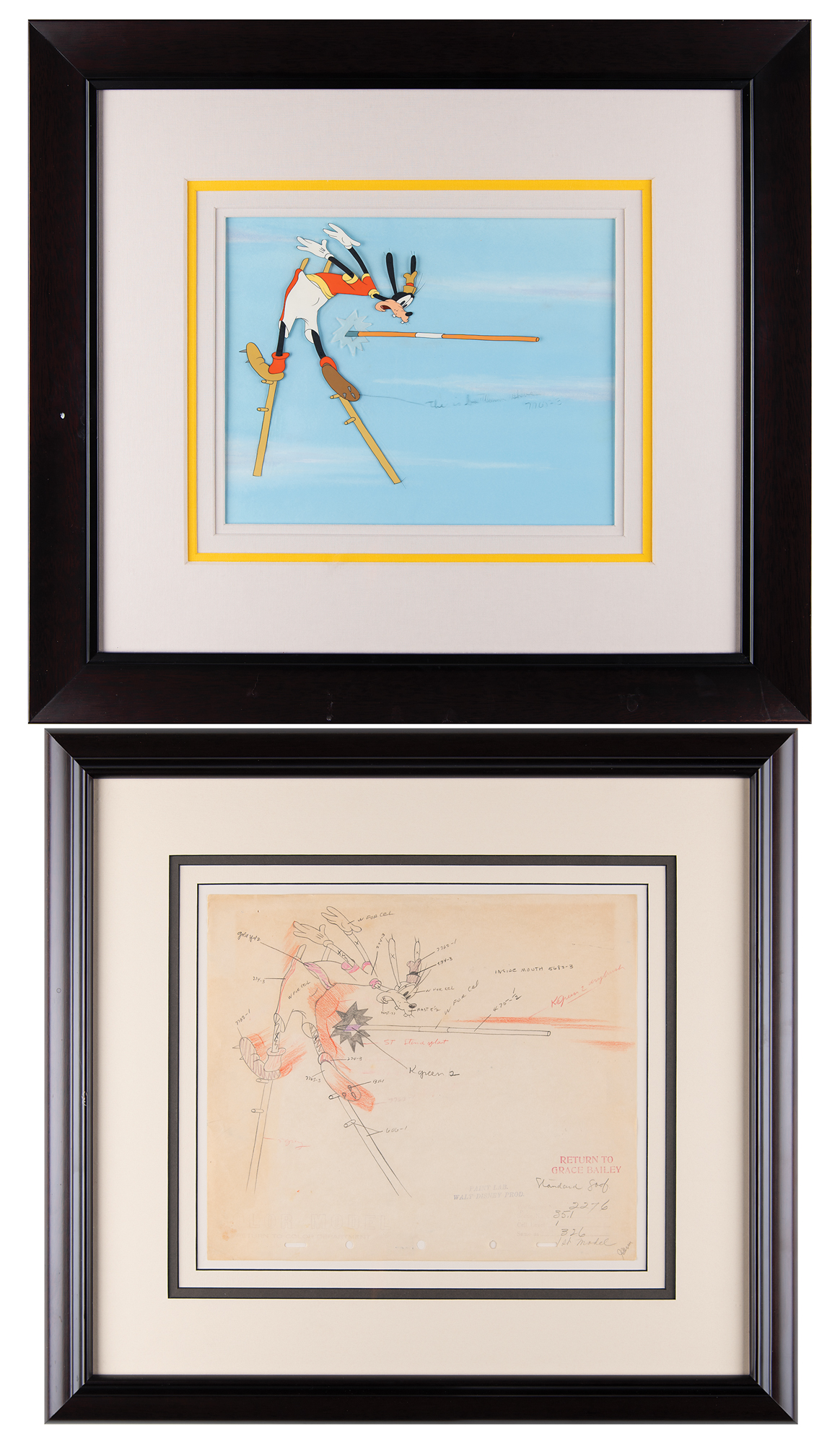 (Walt Disney Studios, 1942) Original production cel and matching model color drawing of Goofy from The Olympic Champ, which both depict him using pole vault frames as stilts as he attempts to dodge an incoming javelin. The cel is placed on a hand-painted background of a blue sky, and the drawing is accomplished in graphite and colored pencil on an untrimmed 12 x 10 animation sheet stamped in the lower right, “Paint Lab. Walt Disney Prod.” and “Return to Grace Bailey [Turner].” The cel image measures 8.75 x 7.75, with a mat opening of 11 x 8.75; and the drawing image measures 9 x 8. Both are individually cloth-matted and framed to overall sizes of 22.25 x 19.75 and 21.25 x 19.25. In overall fine condition.