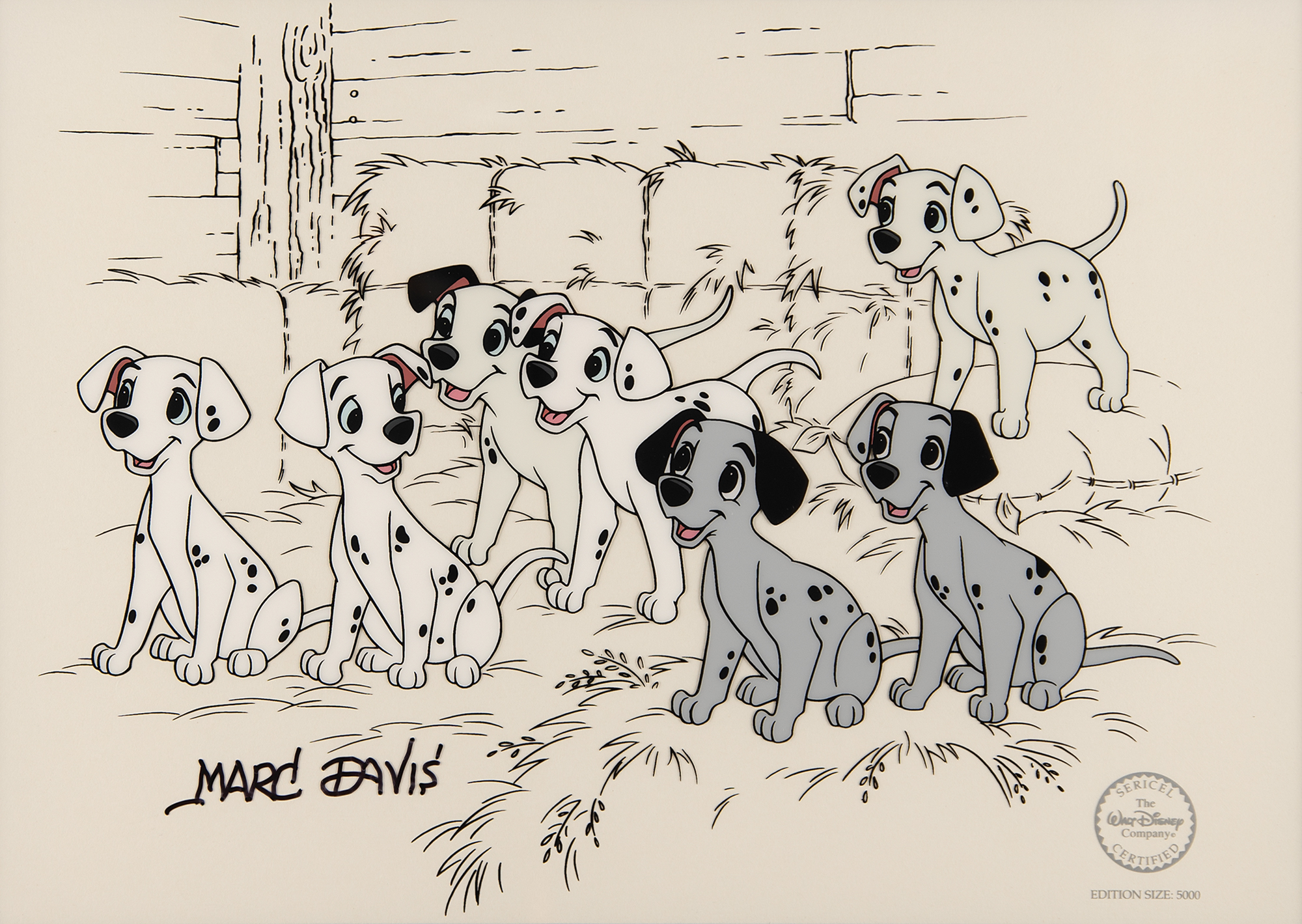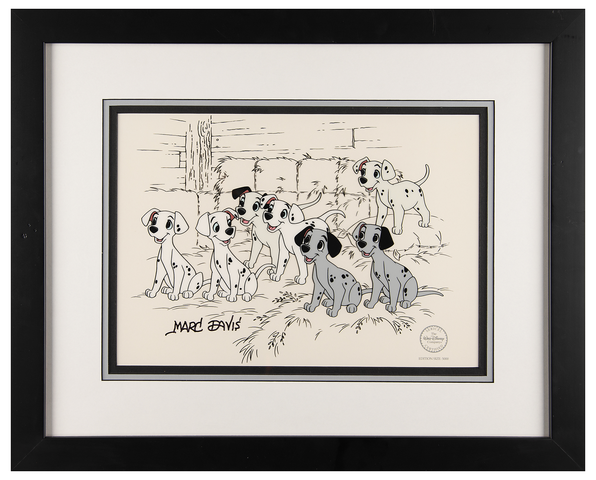(Walt Disney Studios, 1996) Original limited edition serigraph cel for One Hundred and One Dalmatians entitled ‘Hopeful Pups,’ signed in black felt tip by legendary Disney animator Marc Davis. The cel, which is triple-matted and framed to an overall size of 21.25 x 17.25, shows a group of seven happy Dalmatian puppies in a hay-filled barn. Total image measures 12 x 9, and the lower right bears a silver Walt Disney Company seal indicating an edition size of 5000. In fine condition.