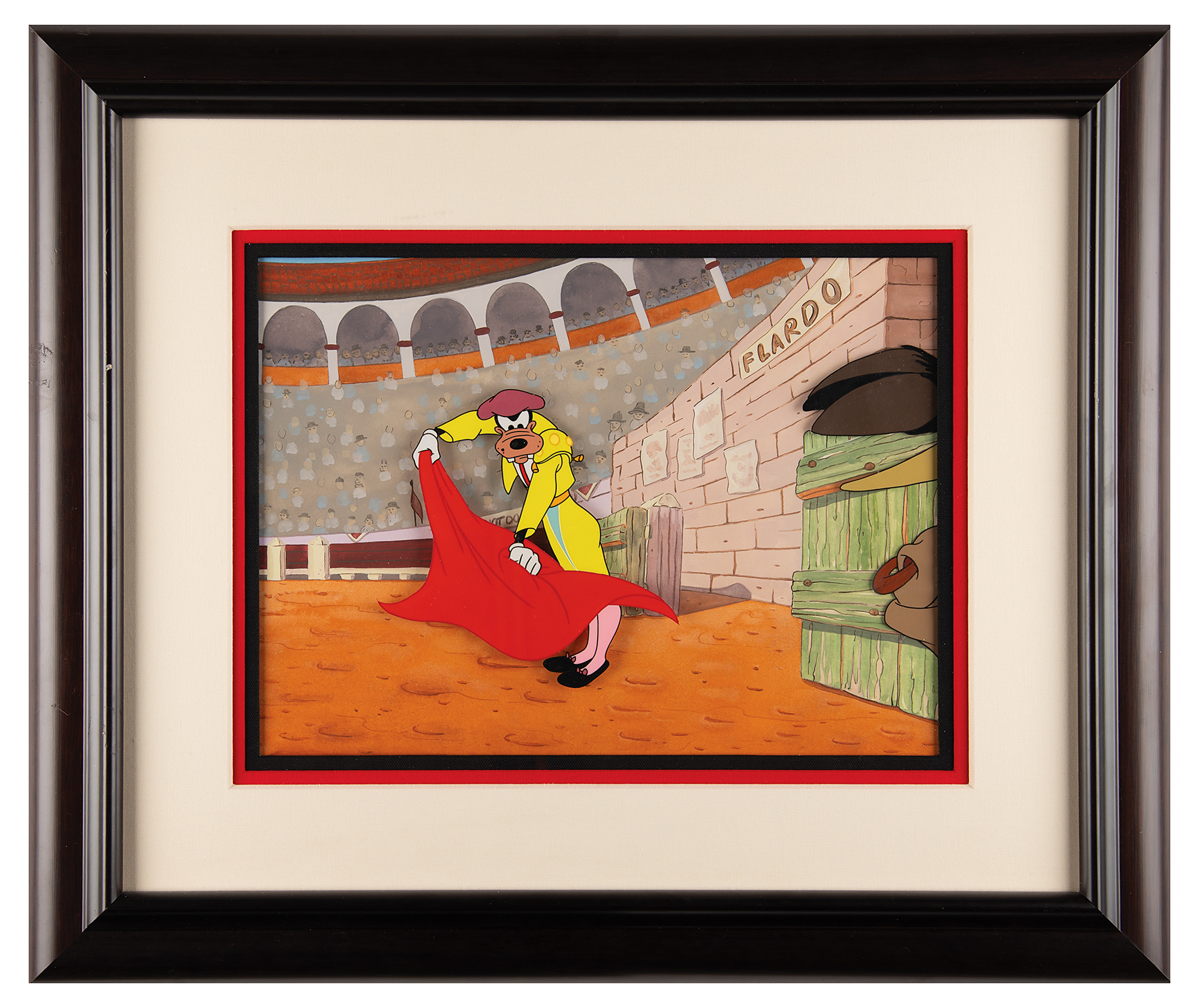 (Walt Disney Studios, 1953) Original production cels featuring Goofy and a bull from the short For Whom the Bulls Toil, which depicts matador Goofy waving a large red cape, with the horns, ears, and muzzle of the large bull visible to the right side. The cels are placed on a magnificent hand-painted custom-prepared background of a Mexican bullring. Character images measure 6 x 6 (Goofy) and 2.75 x 6 (Bull), with a mat opening of 13 x 9.75. Cloth-matted and framed to an overall size of 22 x 19. In fine condition.