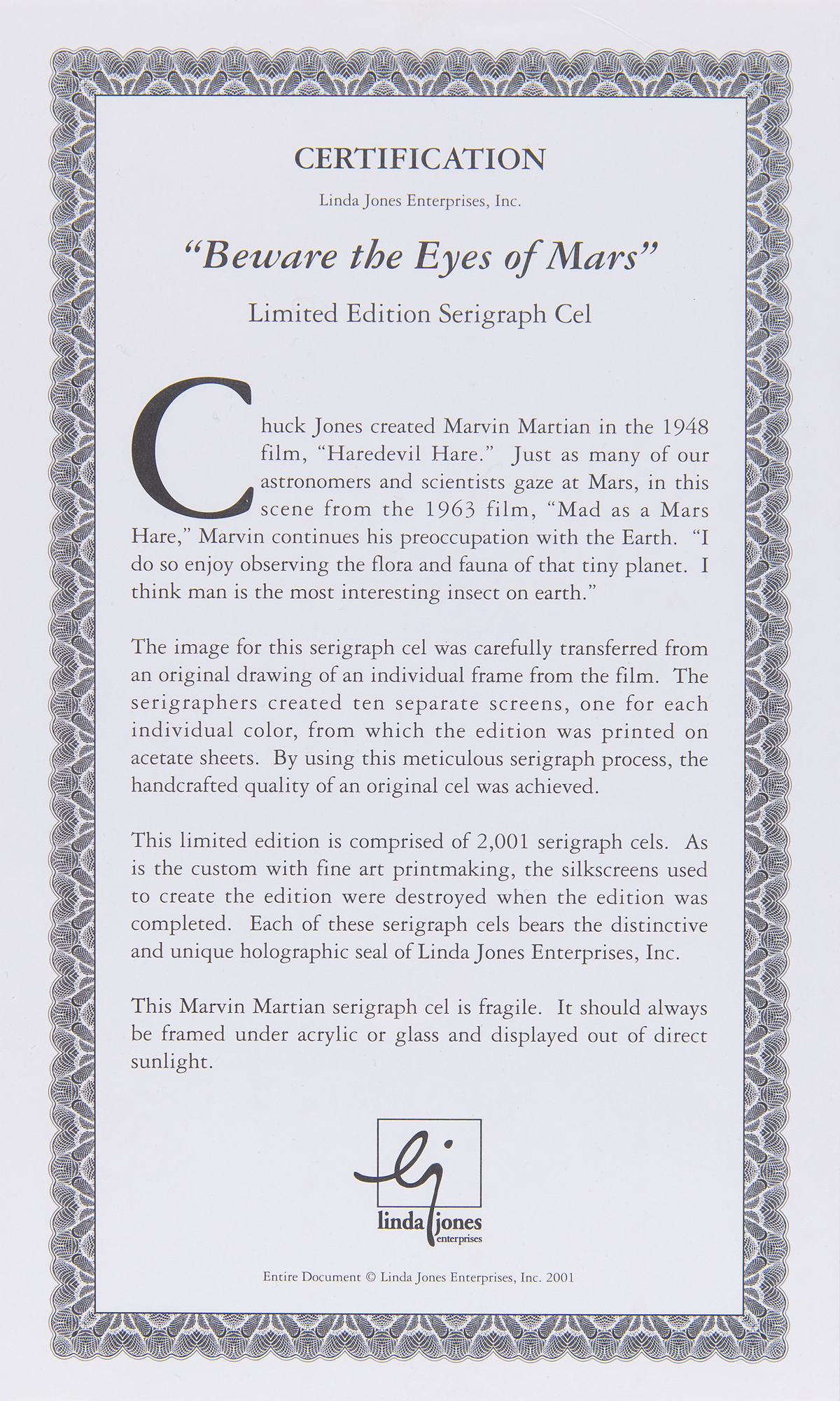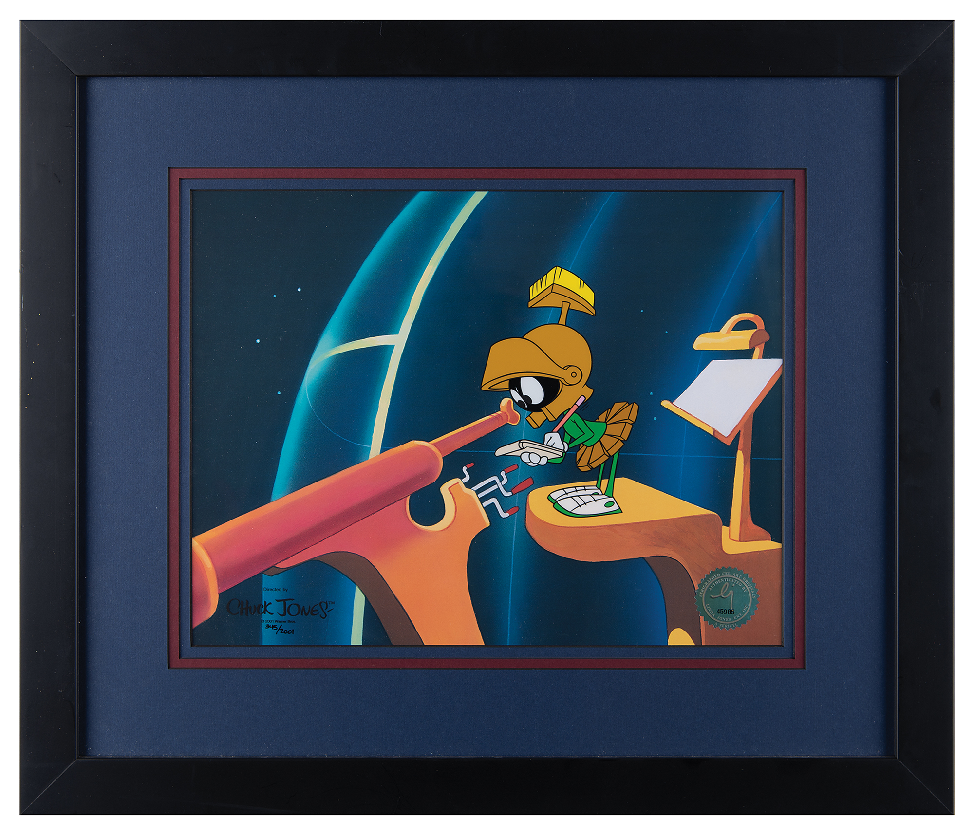 (Warner Brothers Studios, 2001) Original limited edition serigraph cel featuring Marvin the Martian entitled ‘Beware the Eyes of Mars,’ numbered 345/2001, a scene recreated from the beginning of the 1963 film Mad as a Mars Hare. The cel is placed on a matching studio-prepared giclee background of the interior of Marvin’s observation platform. Character image measures 3.75 x 5.75, with a mat opening of 13.5 x 15.5. Triple-matted and framed to an overall size of 21.25 x 18.25. The lower right bears a Linda Jones Enterprises seal. In fine condition. Accompanied by a certificate of authenticity from Linda Jones Enterprises.