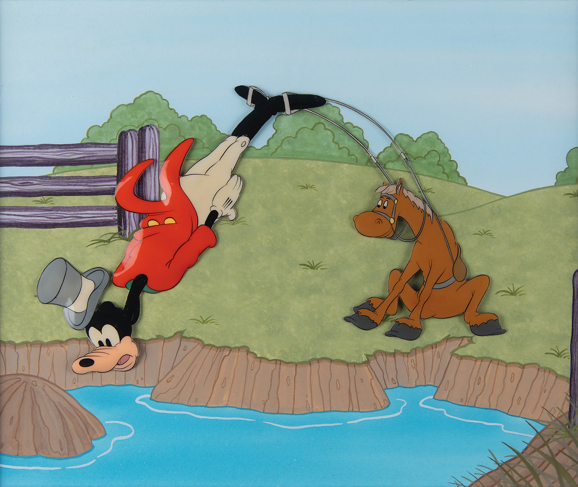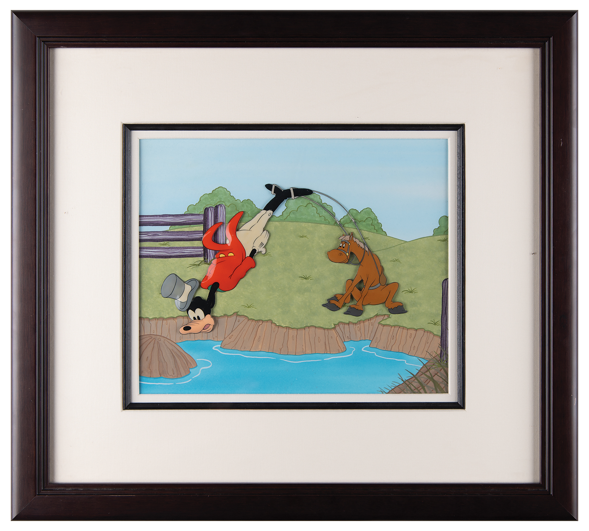 (Walt Disney Studios, 1941) Original production cels featuring Goofy and his horse Percy from the 'How to Ride a Horse' segment of The Reluctant Dragon, showing Goofy, dressed in full riding attire, about to go for a swim in a creek, the result of Percy, smiling from the shore, having suddenly hit the brakes. The cels have been trimmed and applied to a hand-painted custom background of a horse pasture and river. Full character image measures 8.75 x 5.5, with a mat opening of 11 x 9.25. Cloth-matted and framed to an overall size of 20 x 18. In fine condition.