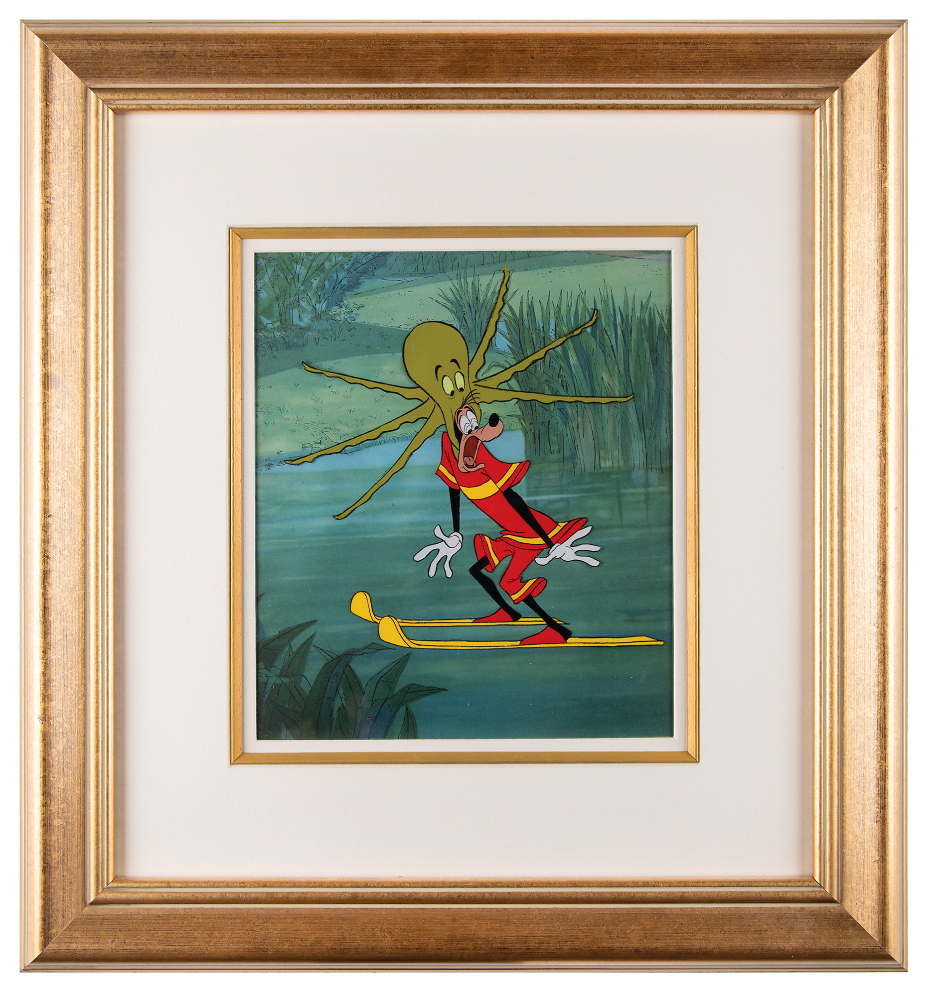 (Walt Disney Studios, 1961) Original production cel of Goofy and an octopus from the cartoon Aquamania, which shows a terrified Goofy water-skiing with an equally frightened octopus on his head. The cel is placed on a facsimile background of a creek or pond. The cel image measures 8.5 x 8.25, with a mat opening of 9 x 10.75. Cloth-matted and framed to an overall size of 19.5 x 21. In fine condition. A large cel with a great pose!