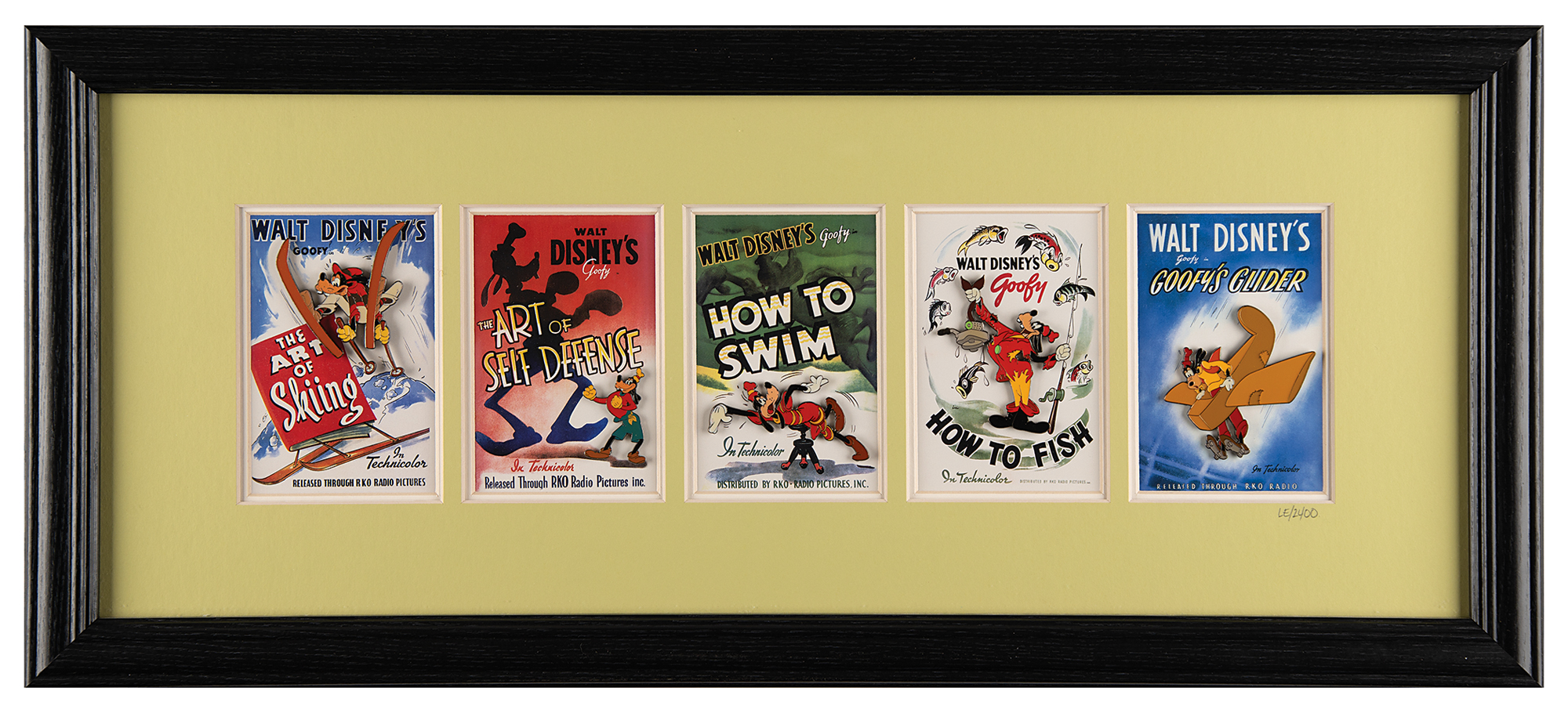 Limited edition ‘Goofy Posters’ framed pin set released by The Walt Disney Gallery, one of 2400 issued, featuring five miniature 1940s film posters promoting Goofy's comedic educational film series—The Art of Skiing, The Art of Self Defense, How to Swim, How to Fish, and Goofy’s Glider—with the enamel pins ranging in size from 1.25 x 1.75 to 2.5 x 2.5. Double-matted and framed to an overall size of 25.25 x 11.25. In very fine condition. Accompanied by a certificate of authenticity from the Walt Disney Gallery.