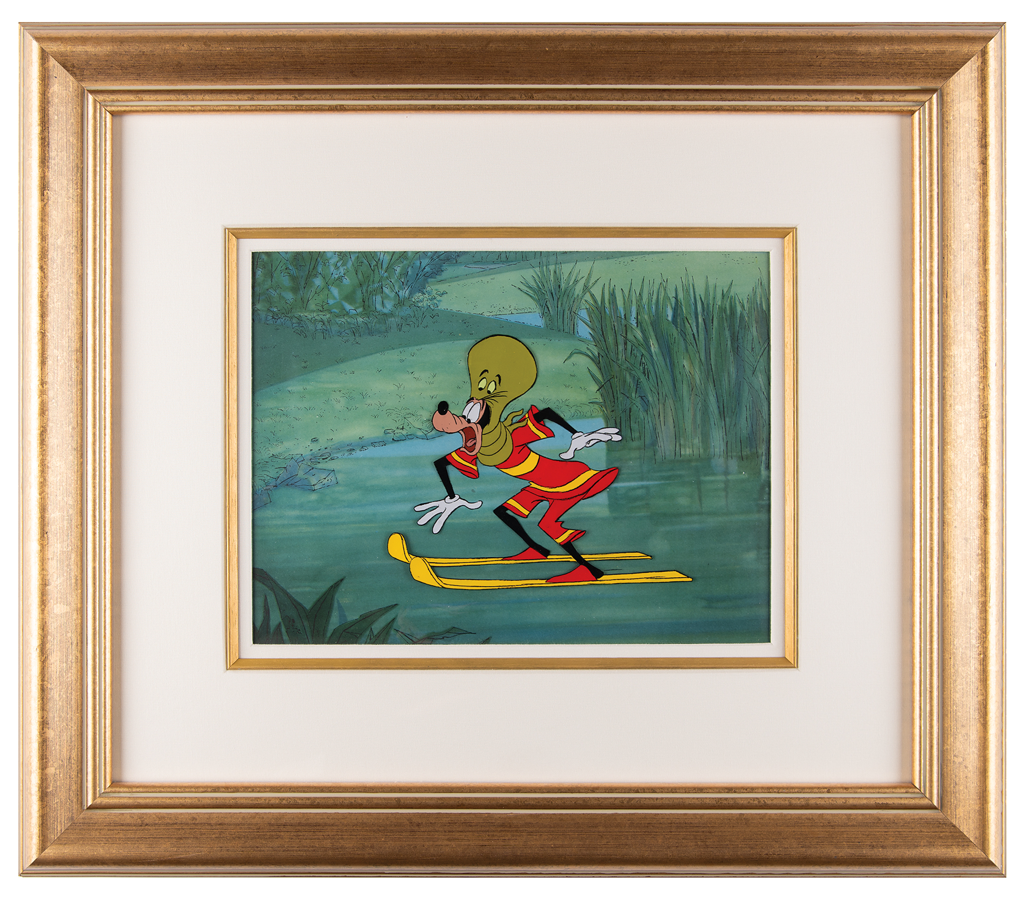 (Walt Disney Studios, 1961) Original production cel of Goofy and an octopus from the cartoon Aquamania, which shows a terrified Goofy water-skiing with an equally frightened octopus wrapped around his head and neck. The cel is placed on a facsimile background of a creek or pond. The cel image measures 6.75 x 5.5, with a mat opening of 11.5 x 9. Cloth-matted and framed to an overall size of 21.5 x 19. In fine condition. A large cel with a great pose!