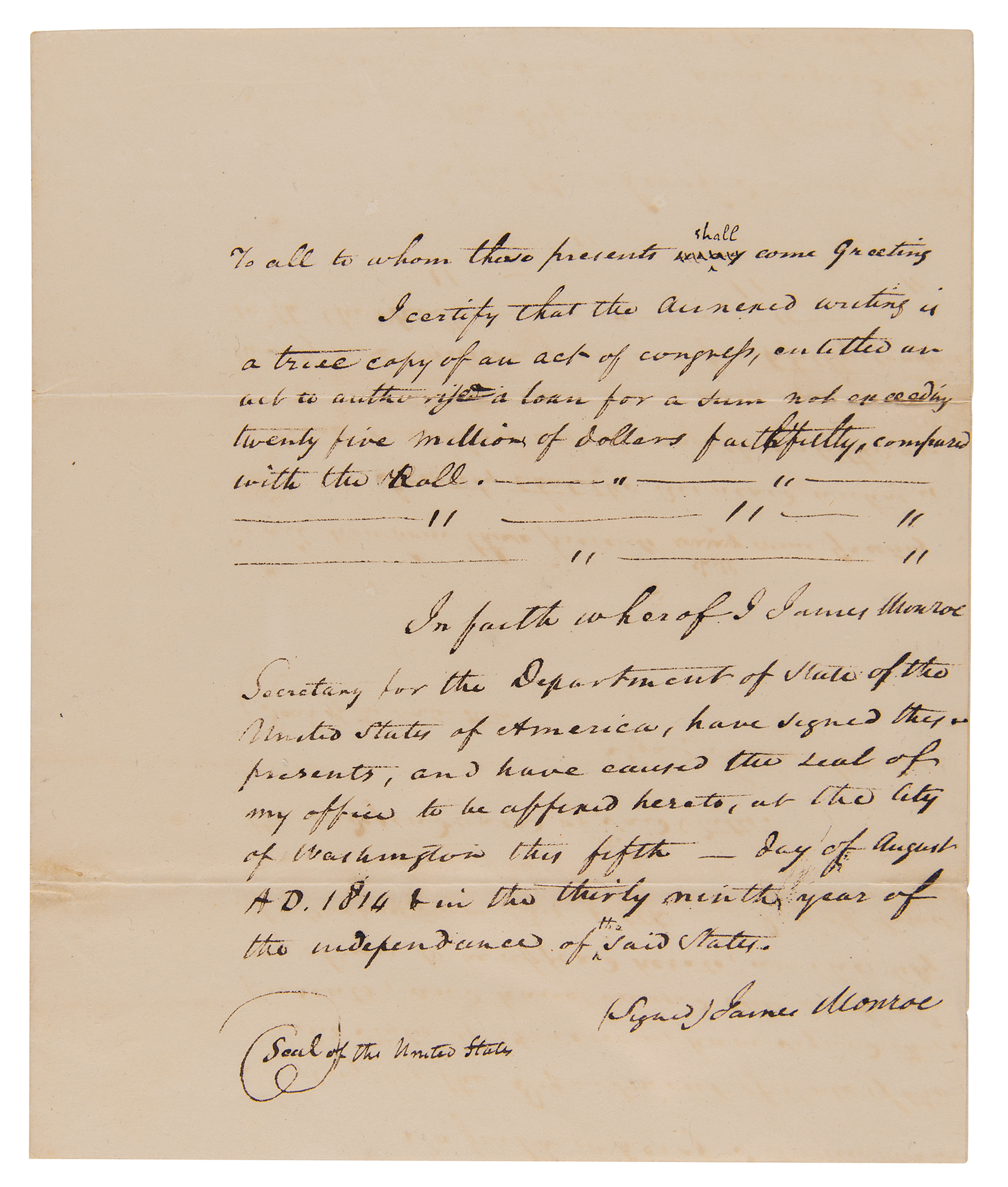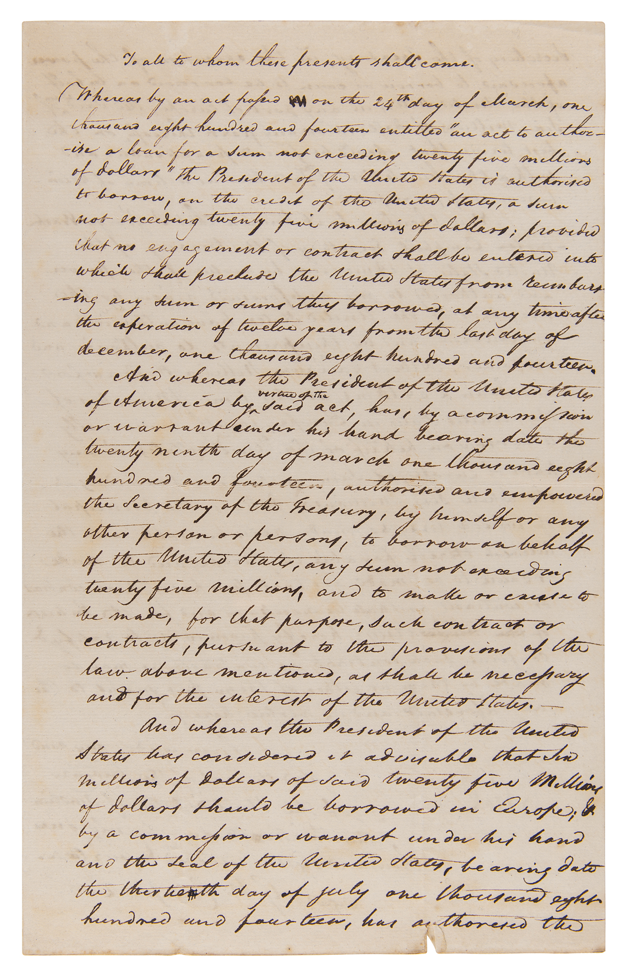 Important archive of manuscripts from the collection of Secretary of the Treasury William H. Crawford, involving a proposed loan from Europe to support the United States government during the War of 1812. The US faced a $50 million shortfall in revenue, brought on by restricted trade, years of seizures of merchant ships, and the expense of the war. There was a real question as to whether the federal government would be able to continue to support the military during wartime. To meet this challenge, Congress authorized President James Madison to borrow up to $25 million. As structuring the loan into tranches would make it more palatable to the public, they first sought a loan in the amount of $6 million. Trusted diplomats John Quincy Adams and Albert Gallatin were already in Europe to begin negotiating the Treaty of Ghent, and they were charged with acquiring the loan at the same time.