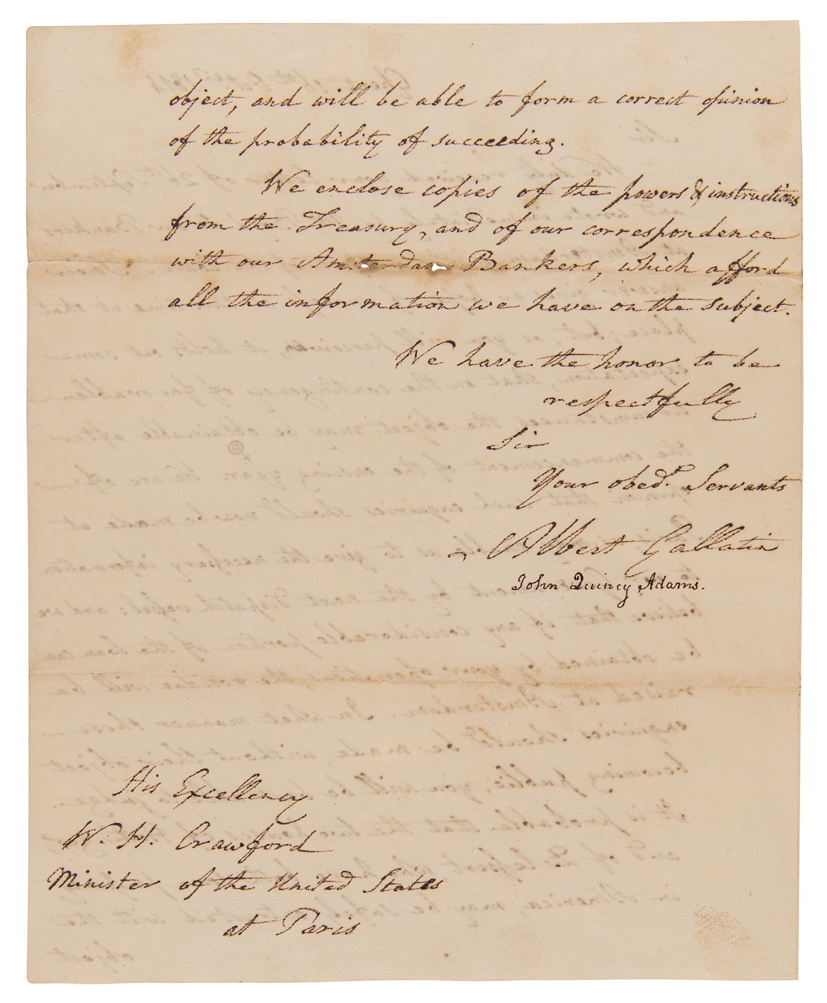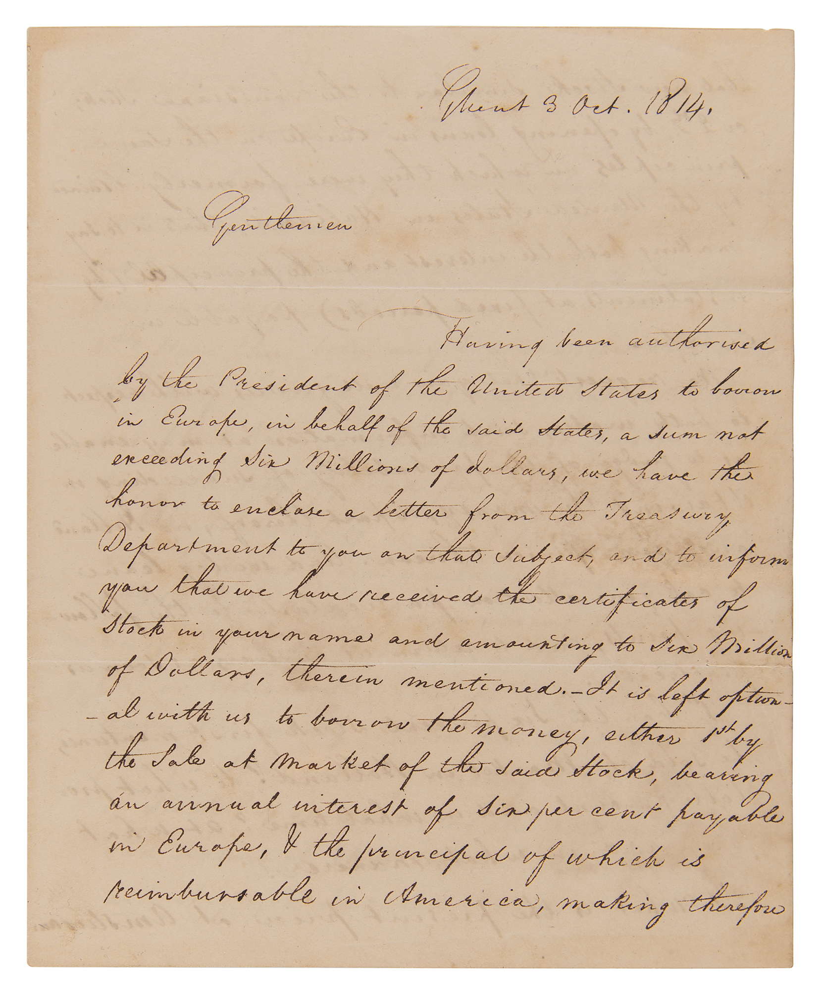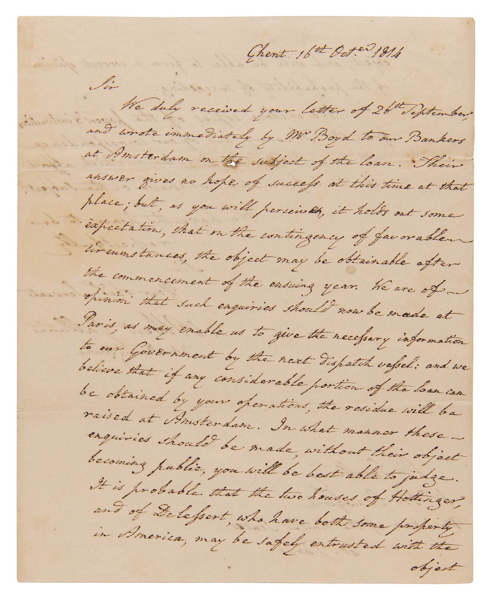 ALS in Gallatin's hand, signed by both, "Albert Gallatin" and "John Quincy Adams," one page both sides, 7 x 8.75, Ghent, October 16, 1814. In part: "We received your letter of 26th September, and wrote immediately by Mr. Boyd to our bankers at Amsterdam on the subject of the loan. Their answer gives no hope of success at this time at that place; but as you will perceive it holds out some expectation that on the contingency of favorable circumstances, the object may be obtainable after the commencement of the ensuing year. We are of opinion that such enquiries should now be made at Paris, as may enable us to give the necessary information to our government by the next dispatch vessel; and we believe that if any considerable portion of the loan can be obtained by your operations, the residue will be raised at Amsterdam. In what manner these enquiries should be made, without their object becoming public, you will be best able to judge. It is probable that the two houses of Hottinger and of Delessert, who have both some property in America, may be safely entrusted with the object…We enclose copies of the powers and instructions from the Treasury."