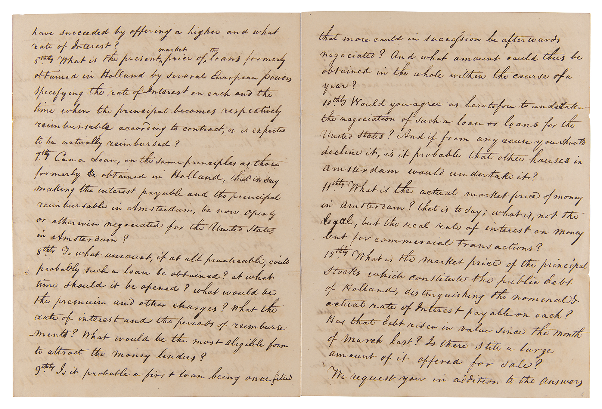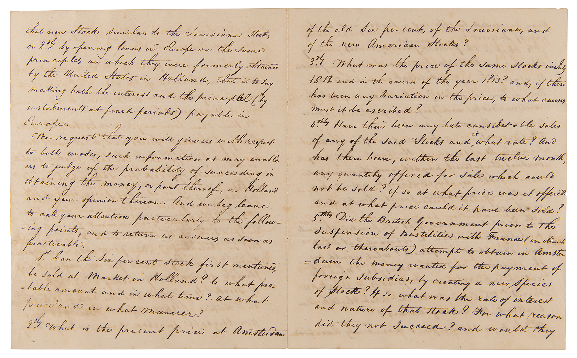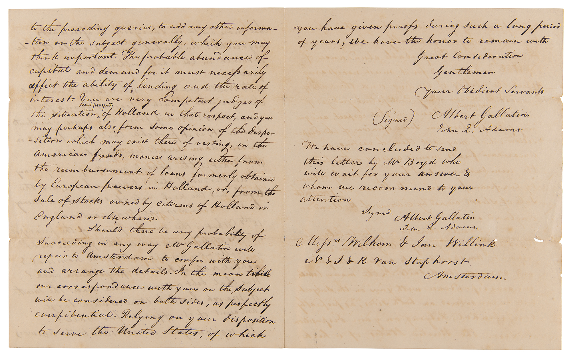 ALS in Gallatin's hand, signed by both, "Albert Gallatin" and "John Quincy Adams," one page both sides, 7 x 8.75, Ghent, October 16, 1814. In part: "We received your letter of 26th September, and wrote immediately by Mr. Boyd to our bankers at Amsterdam on the subject of the loan. Their answer gives no hope of success at this time at that place; but as you will perceive it holds out some expectation that on the contingency of favorable circumstances, the object may be obtainable after the commencement of the ensuing year. We are of opinion that such enquiries should now be made at Paris, as may enable us to give the necessary information to our government by the next dispatch vessel; and we believe that if any considerable portion of the loan can be obtained by your operations, the residue will be raised at Amsterdam. In what manner these enquiries should be made, without their object becoming public, you will be best able to judge. It is probable that the two houses of Hottinger and of Delessert, who have both some property in America, may be safely entrusted with the object…We enclose copies of the powers and instructions from the Treasury."