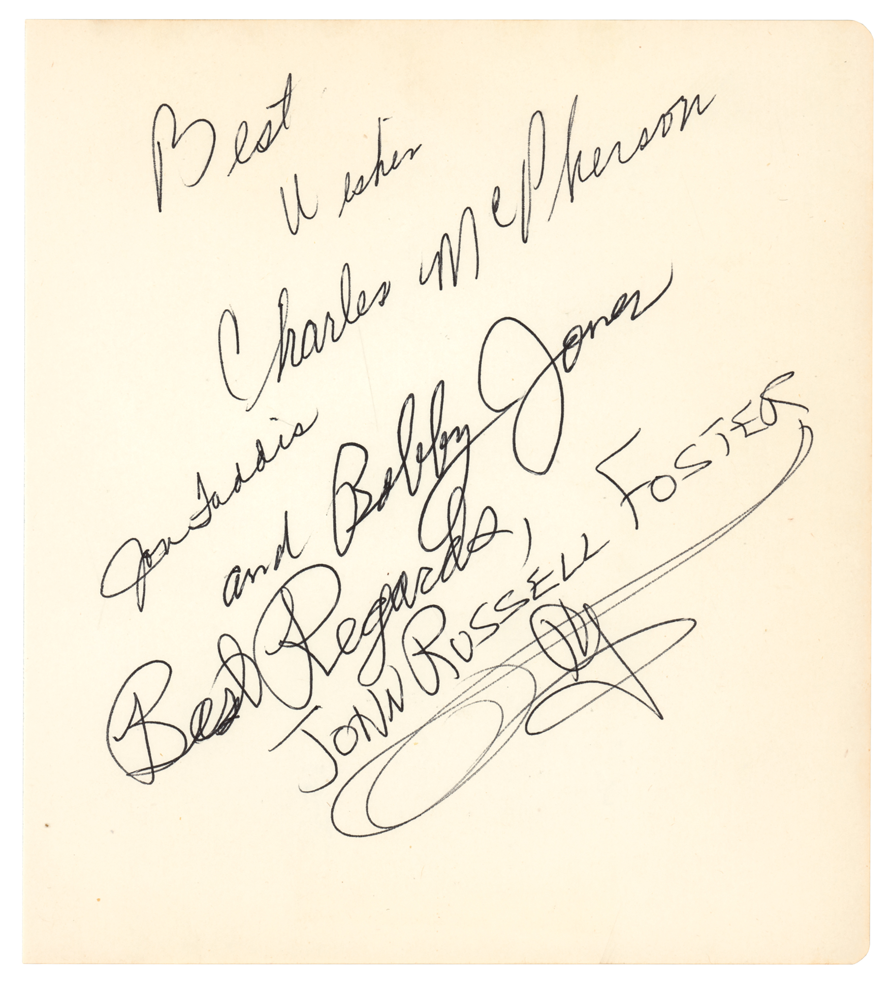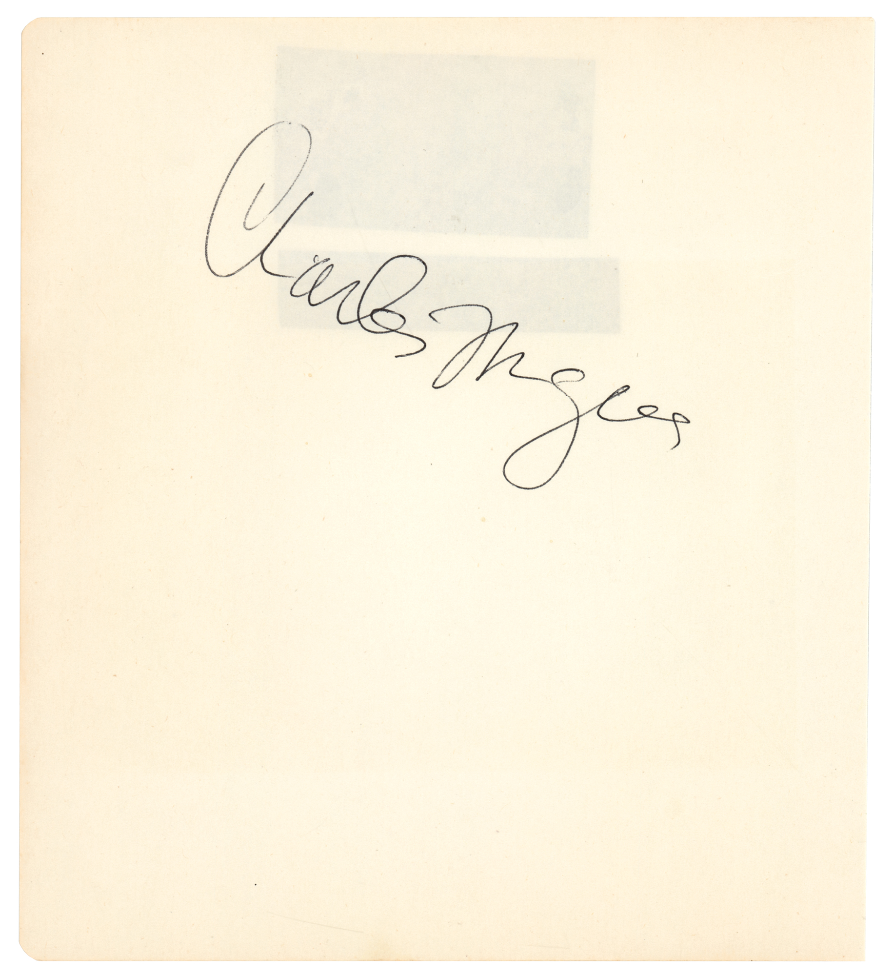 Vintage ballpoint signature, "Charles Mingus,” on an off-white 5.75 x 6.5 album page. Also included is a second album page signed by four members of his band: Charles McPherson, Jon Faddis, Bobby Jones, and John Russell Foster. In fine condition, with light show-through behind Mingus from two small clippings on the back. Accompanied by an original color glossy 5 x 3.5 candid photo of Mingus at the time of signing.