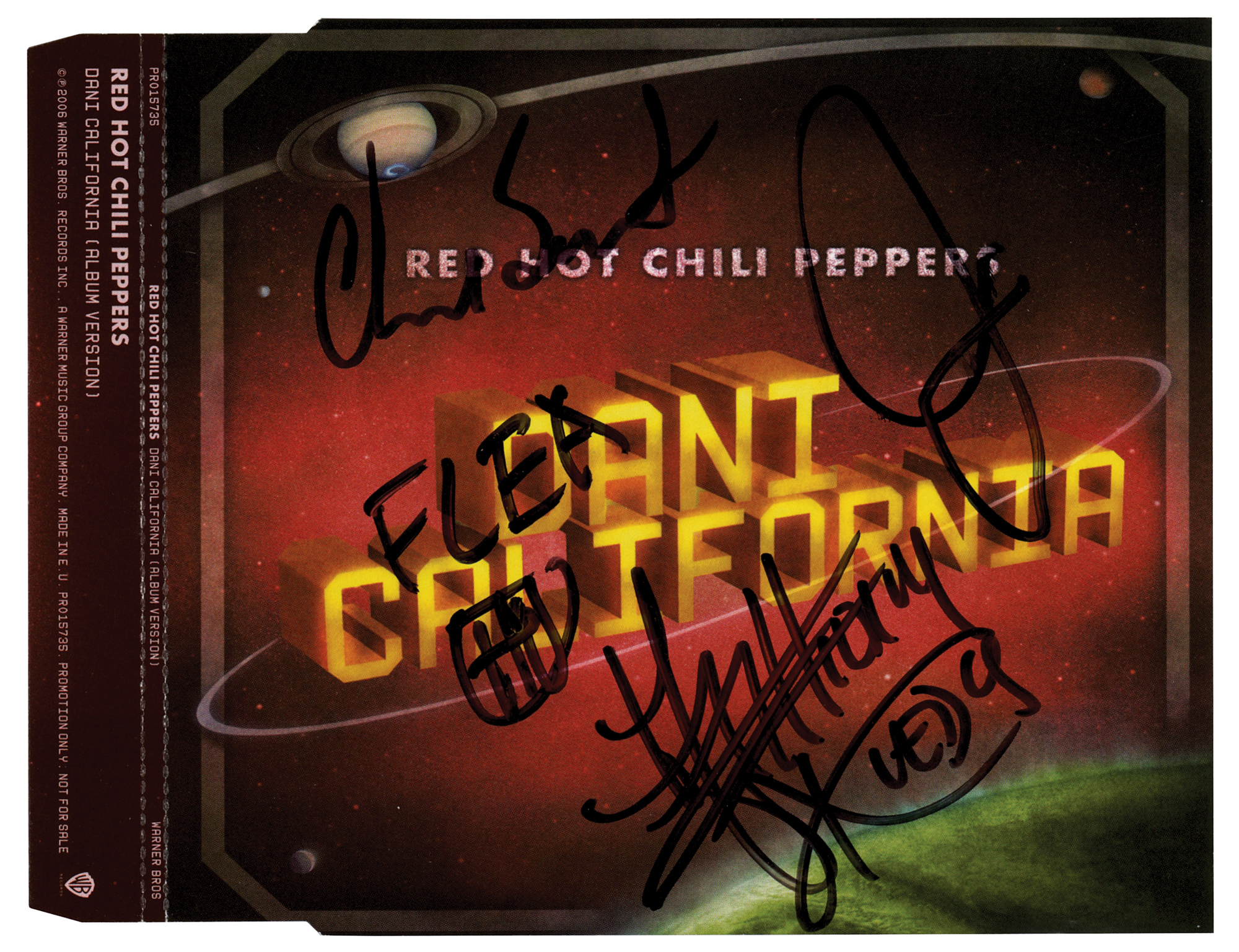 CD sleeve for the Red Hot Chili Peppers single ‘Dani California,’ signed in black felt tip by Anthony Kiedis, John Frusciante, Flea, and Chad Smith. In fine condition. The CD is not included.