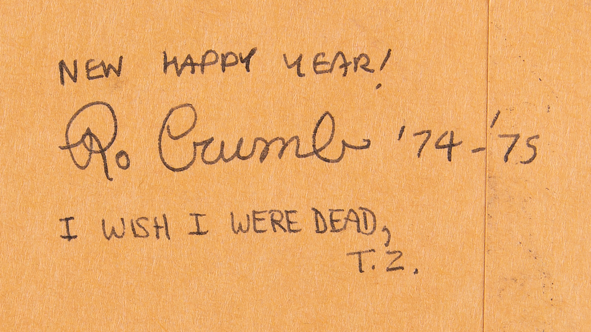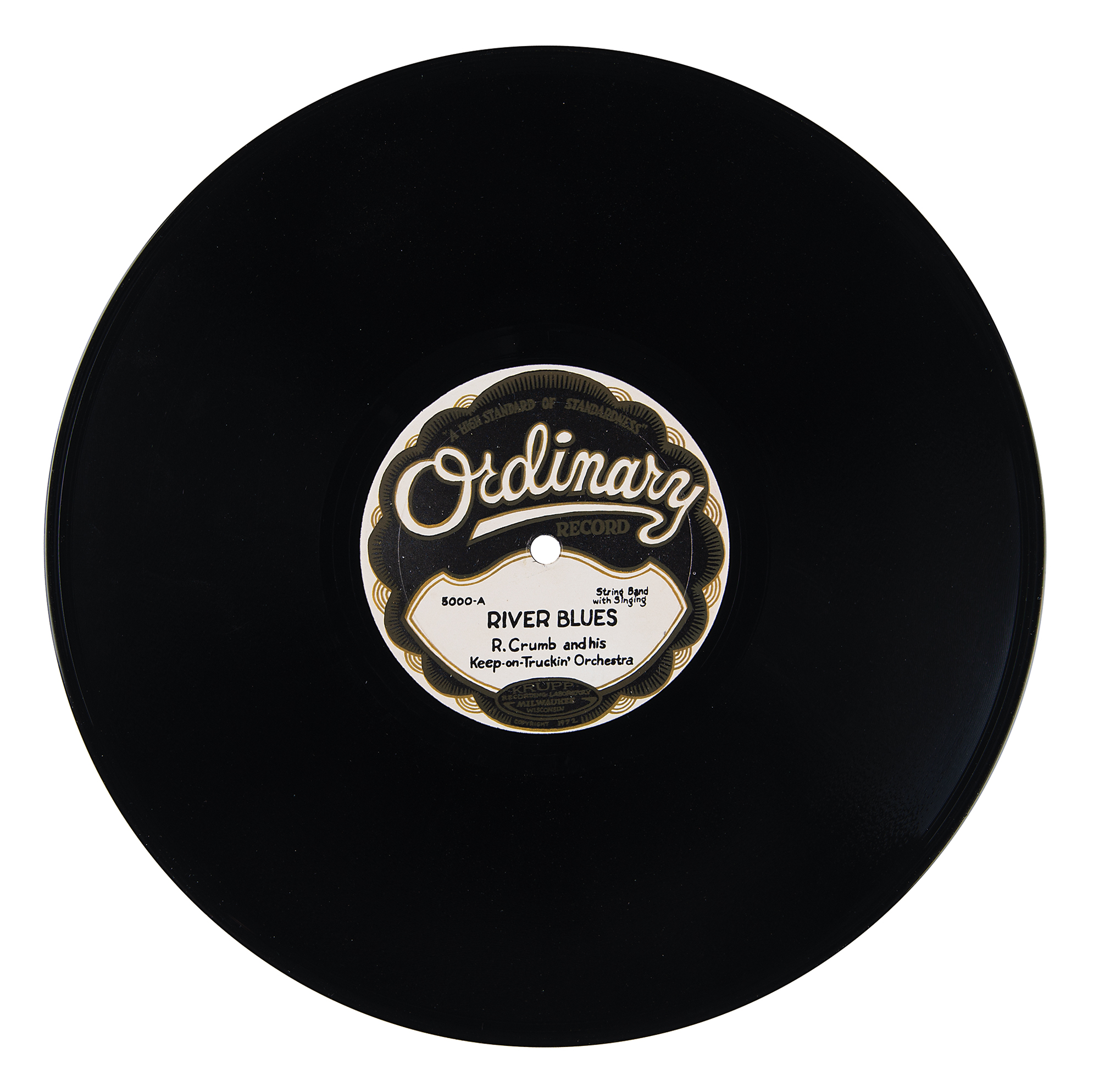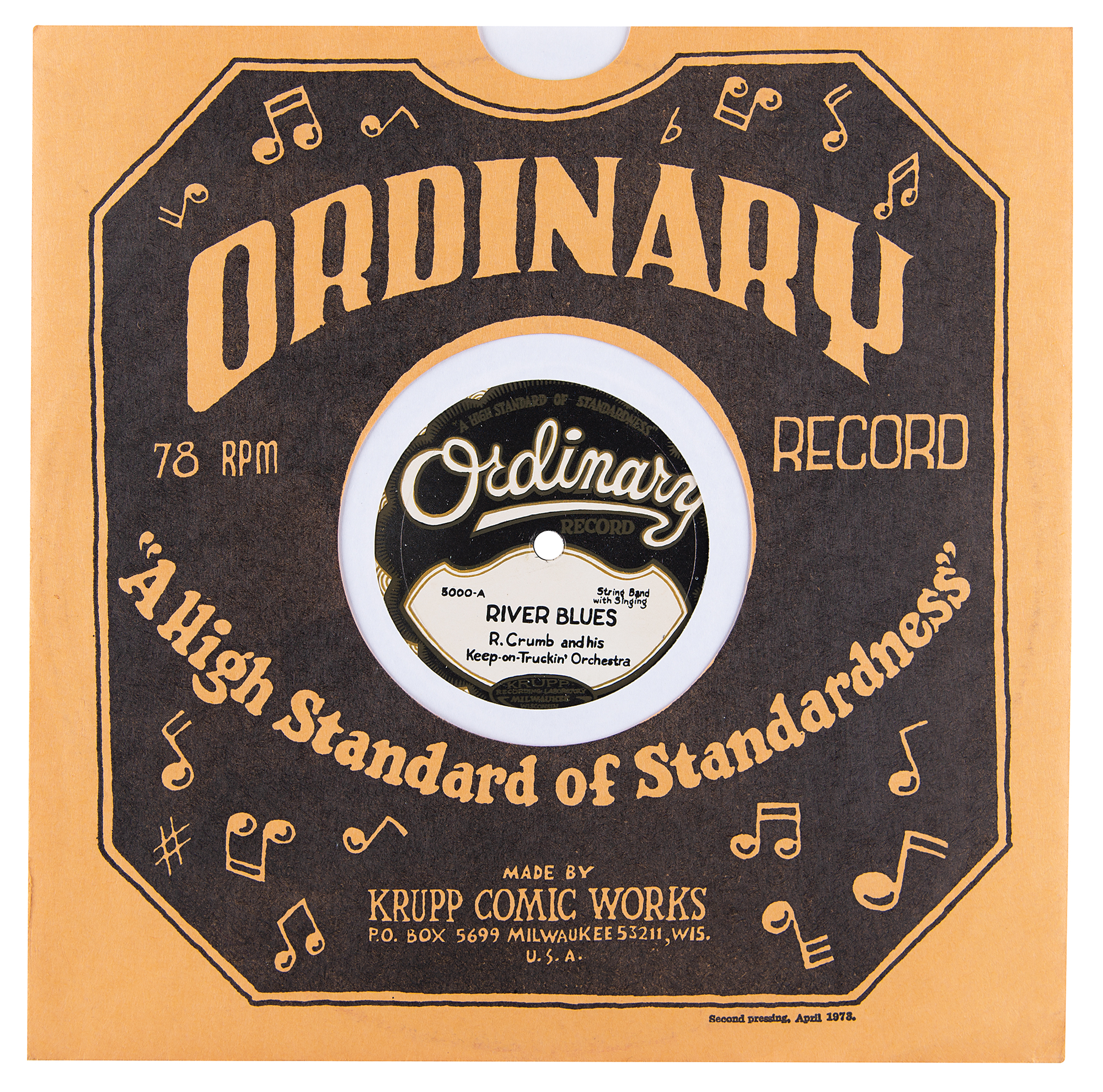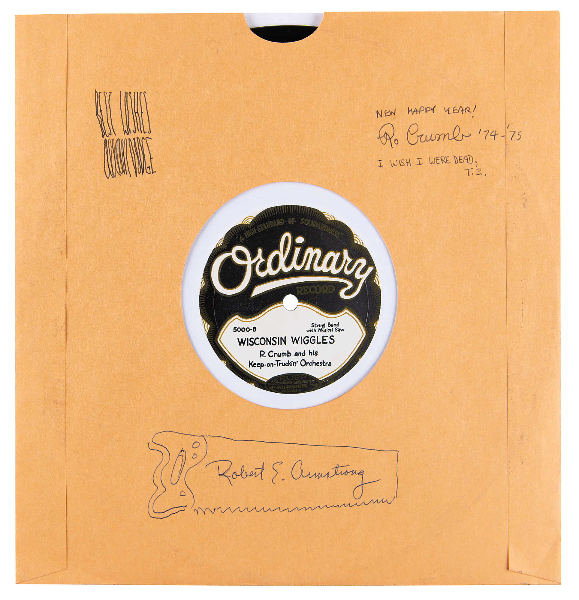 Scarce Ordinary Records 10-inch (78 RPM) vinyl record for the single ‘River Blues / Wisconsin Wiggles’ by R. Crumb and his Keep-on-Truckin’ Orchestra, signed on the back of the original beige Ordinary Record sleeve in black ballpoint, “New Happy Year! R. Crumb ‘74 – ‘75.” The sleeve is also signed by three of his band members: Allan Dodge, Robert Armstrong, who signs inside a sketch of a handsaw, and Terry Zwigoff, who signs, “I wish I were dead, T. Z.” The beige sleeve notes the record as a second printing (April 1973) and that it was made by Krupp Comic Works. In fine condition. The record is included.